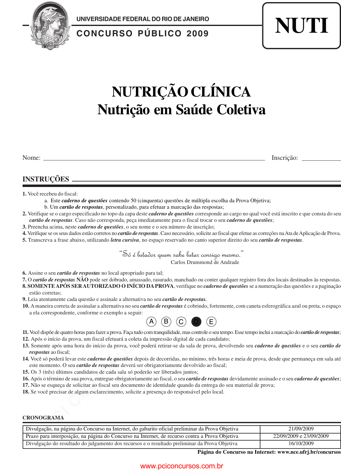 pcimarkpci MDAwMDowMDAwOjAwMDA6MDAwMDowMDAwOmZmZmY6MzZlOTpjMjU5:TW9uLCAxMyBTZXAgMjAyMSAxNjoxNzozNSAtMDMwMA== NUTRIÇÃO CLÍNICA Nutrição em Saúde Coletiva UNIVERSIDADE FEDERAL DO RIO DE JANEIRO CONCURSO PÚBLICO 2009 NUTI INSTRUÇÕES 1. Você recebeu do fiscal: a. Este caderno de questões contendo 50 (cinquenta) questões de múltipla escolha da Prova Objetiva; b. Um cartão de respostas, personalizado, para efetuar a marcação das respostas; 2. Verifique se o cargo especificado no topo da capa deste caderno de questões corresponde ao cargo no qual você está inscrito e que consta do seu cartão de respostas. Caso não corresponda, peça imediatamente para o fiscal trocar o seu caderno de questões; 3. Preencha acima, neste caderno de questões, o seu nome e o seu número de inscrição; 4. Verifique se os seus dados estão corretos no cartão de respostas. Caso necessário, solicite ao fiscal que efetue as correções na Ata de Aplicação de Prova. 5. Transcreva a frase abaixo, utilizando letra cursiva, no espaço reservado no canto superior direito do seu cartão de respostas. “Só é lutador quem sabe lutar consigo mesmo.” Carlos Drummond de Andrade 6. Assine o seu cartão de respostas no local apropriado para tal; 7. O cartão de respostas NÃO pode ser dobrado, amassado, rasurado, manchado ou conter qualquer registro fora dos locais destinados às respostas. 8. SOMENTE APÓS SER AUTORIZADO O INÍCIO DA PROVA, verifique no caderno de questões se a numeração das questões e a paginação estão corretas; 9. Leia atentamente cada questão e assinale a alternativa no seu cartão de respostas. 10. A maneira correta de assinalar a alternativa no seu cartão de respostas é cobrindo, fortemente, com caneta esferográfica azul ou preta, o espaço a ela correspondente, conforme o exemplo a seguir: 11. Você dispõe de quatro horas para fazer a prova. Faça tudo com tranquilidade, mas controle o seu tempo. Esse tempo inclui a marcação do cartão de respostas; 12. Após o início da prova, um fiscal efetuará a coleta da impressão digital de cada candidato; 13. Somente após uma hora do início da prova, você poderá retirar-se da sala de prova, devolvendo seu caderno de questões e o seu cartão de respostas ao fiscal; 14. Você só poderá levar este caderno de questões depois de decorridas, no mínimo, três horas e meia de prova, desde que permaneça em sala até este momento. O seu cartão de respostas deverá ser obrigatoriamente devolvido ao fiscal; 15. Os 3 (três) últimos candidatos de cada sala só poderão ser liberados juntos; 16. Após o término de sua prova, entregue obrigatoriamente ao fiscal, o seu cartão de respostas devidamente assinado e o seu caderno de questões; 17. Não se esqueça de solicitar ao fiscal seu documento de identidade quando da entrega do seu material de prova; 18. Se você precisar de algum esclarecimento, solicite a presença do responsável pelo local. A B C D E CRONOGRAMA Divulgação, na página do Concurso na Internet, do gabarito oficial preliminar da Prova Objetiva 21/09/2009 Prazo para interposição, na página do Concurso na Internet, de recurso contra a Prova Objetiva 22/09/2009 e 23/09/2009 Divulgação do resultado do julgamento dos recursos e o resultado preliminar da Prova Objetiva 16/10/2009 Página do Concurso na Internet: www.nce.ufrj.br/concursos Nome: Inscrição: www.pciconcursos.com.br pcimarkpci MDAwMDowMDAwOjAwMDA6MDAwMDowMDAwOmZmZmY6MzZlOTpjMjU5:TW9uLCAxMyBTZXAgMjAyMSAxNjoxNzozNSAtMDMwMA== Universidade Federal do Rio de Janeiro Concurso Público 2009 2 LÍNGUA PORTUGUESA Leia o texto abaixo e responda as questões 1 a 3. A OUTRA EPIDEMIA Lya Luft - Veja, 15-07-2009 Para mim, escrever é sempre questionar, não importa se estou escrevendo um romance, um poema, um artigo. Como ficcionista, meu espaço de trabalho é o drama humano: palco, cenário, bastidores e os mais variados personagens com os quais invento histórias de magia ou desespero. Como colunista, observo e comento a realidade. O quadro não anda muito animador, embora na crise mundial o Brasil pareça estar se saindo melhor que a maioria dos países. De tirar o chapéu, se isso se concretizar e perdurar. Do ponto de vista da moralidade, por outro lado, até em instituições públicas que julgávamos venerandas, a cada dia há um novo espanto. Não por obra de todos os que lá foram colocados (por nós), mas o que ficamos sabendo é difícil de acreditar. Teríamos de andar feito o velho filósofo grego Diógenes, que percorria as ruas em dia claro com uma lanterna na mão. Questionado, respondia procurar um homem honrado. Vamos ter de sair aos bandos, aos magotes, catando essa figura, não uma, mas multidões delas, para consertar isso, que parece não ter arrumação? 1 - Assinale a alternativa em que a segunda forma do segmento altera o sentido do segmento inicial. (A) “Para mim, escrever é sempre questionar” = Escrever, para mim, é sempre questionar; (B) “para consertar isso” = para isso ser consertado; (C) “o drama humano” = o drama do homem; (D) “os que lá foram colocados” = os que foram colocados lá; (E) “não uma, mas multidões” = não multidões, mas uma. 2 - “De tirar o chapéu, se isso se concretizar e perdurar. Do ponto de vista da moralidade, por outro lado, até em instituições públicas que julgávamos venerandas, a cada dia há um novo espanto. Não por obra de todos os que lá foram colocados (por nós), mas o que ficamos sabendo é difícil de acreditar”. A alternativa que informa o valor semântico correto do elemento destacado é: (A) SE = condição; (B) POR OUTRO LADO = lugar; (C) ATÉ = direção; (D) POR = causa; (E) MAS = concessão. 3 - “Para mim, escrever é sempre questionar”; a forma plural correta dessa frase é: (A) Para nós, escrevermos é sempre questionarmos; (B) Para nós, escrevermos é sempre questionar; (C) Para nós, escrever é sempre questionar; (D) Para mim, escrevermos