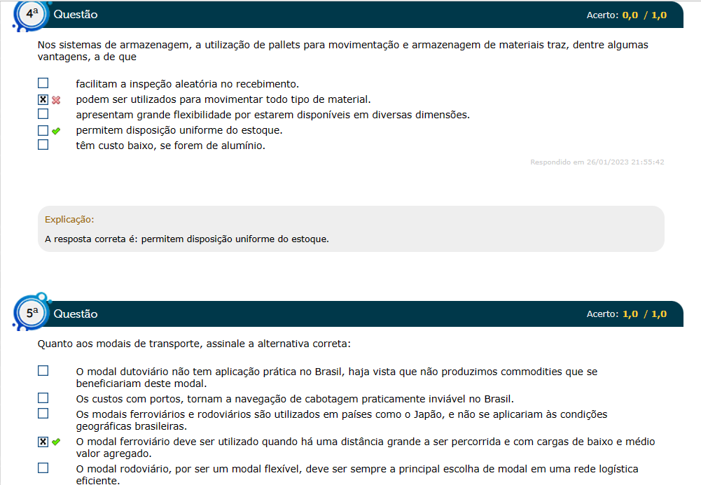 Nos sistemas de armazenagem, a utilização de pallets para movimentação e armazenagem de materiais traz, dentre algumas vantagens, a de que facilitam a inspeção aleatória no recebimento. Assinale a alternativa correta sobre as vantagens dos pallets. podem ser utilizados para movimentar todo tipo de material. apresentam grande flexibilidade por estarem disponíveis em diversas. permitem disposição uniforme do estoque. têm custo baixo, se forem de alumínio.