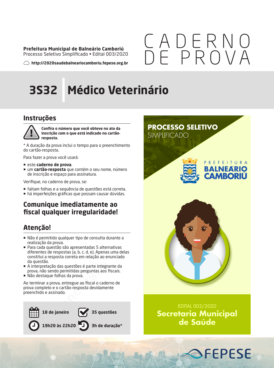 pcimarkpci MDAwMDowMDAwOjAwMDA6MDAwMDowMDAwOmZmZmY6MzZlOTpjMjU5:VHVlLCAxNCBTZXAgMjAyMSAxOToxODozOSAtMDMwMA== EDITAL 003/2020 Secretaria Municipal de Saúde Instruções Confira o número que você obteve no ato da inscrição com o que está indicado no cartão-resposta. * A duração da prova inclui o tempo para o preenchimento do cartão-resposta. Para fazer a prova você usará: � este caderno de prova. � um cartão-resposta que contém o seu nome, número de inscrição e espaço para assinatura. Verifique, no caderno de prova, se: � faltam folhas e a sequência de questões está correta. � há imperfeições gráficas que possam causar dúvidas. Comunique imediatamente ao fiscal qualquer irregularidade! Atenção! � Não é permitido qualquer tipo de consulta durante a realização da prova. � Para cada questão são apresentadas 5 alternativas diferentes de respostas (a, b, c, d, e). Apenas uma delas constitui a resposta correta em relação ao enunciado da questão. � A interpretação das questões é parte integrante da prova, não sendo permitidas perguntas aos fiscais. � Não destaque folhas da prova. Ao terminar a prova, entregue ao fiscal o caderno de prova completo e o cartão-resposta devidamente preenchido e assinado. 18 de janeiro 19h20 às 22h20 35 questões 3h de duração* C A D E R N O D E P R O V A Prefeitura Municipal de Balneário Camboriú Processo Seletivo Simplificado • Edital 003/2020 http://2020saudebalneariocamboriu.fepese.org.br 3S32 Médico Veterinário PROCESSO SELETIVO SIMPLIFICADO pcimarkpci MDAwMDowMDAwOjAwMDA6MDAwMDowMDAwOmZmZmY6MzZlOTpjMjU5:VHVlLCAxNCBTZXAgMjAyMSAxOToxODozOSAtMDMwMA== . pcimarkpci MDAwMDowMDAwOjAwMDA6MDAwMDowMDAwOmZmZmY6MzZlOTpjMjU5:VHVlLCAxNCBTZXAgMjAyMSAxOToxODozOSAtMDMwMA== Página 3 Prefeitura Municipal de Balneário Camboriú • Processo Seletivo Simplificado • Edital 003/2020 3S32 Médico Veterinário Língua Portuguesa 5 questões Leia o texto. Um poema de João Cabral de Mello Neto. Antes da leitura, saiba que o poema é composto por estrofes que contêm versos (linhas). Este tem quatro estrofes com quatro versos cada uma delas. O ovo da galinha O ovo revela o acabamento a toda mão que o acaricia daquelas coisas torneadas num trabalho de toda vida. E que se encontra também noutras que entretanto mão não fabrica: nos corais, nos seixos* rolados e em tantas coisas esculpidas cujas formas simples são obra de mil inacabáveis lixas usadas por mãos escultoras escondidas na água, na brisa. No entretanto, o ovo e apesar da pura forma concluída, não se situa no final: está no ponto de partida. (*pedras) 1. Identifique abaixo as afirmativas verdadeiras ( V ) e as falsas ( F ) em relação ao texto. ( ) Todas as pessoas que acariciam um ovo perce- bem seu belo acabamento. ( ) Embora tenha acabamento perfeito, o ovo é ponto de partida. ( ) Assim como os seixos rolados, o ovo foi escul- pido pelas mãos escultoras da água e da brisa. ( ) O poeta mostra-se melancólico ao falar sobre o ovo. ( ) A primeira e a segunda estrofes do poema revelam uma contradição, se tomarmos a palavra “acabamento” como “finalização”. Assinale a alternativa que indica a sequência correta, de cima para baixo. a. SQUARE V • V • F • V • F b. Check-square V • V • F • F • V c. SQUARE V • F • V • F • V d. SQUARE F • V • F • V • F e. SQUARE F • F • V • V • F 2. Assinale a alternativa correta, considerando o texto. a. SQUARE Na primeira estrofe, nas três vezes em que apa- rece a palavra “o”, ela é um artigo. b. SQUARE A expressão “e apesar da pura forma con- cluída” traz uma ideia de consequência ao fato expresso na estrofe. c. Check-square A expressão “no ponto de partida”, sintatica- mente, é um adjunto adverbial e tem função igual a das expressões “na água” e “na brisa”. d. SQUARE A palavra “entretanto”, usada na segunda e na última estrofe, denotam significados dife- rentes no contexto em que se inserem, pois iniciam oração coordenada e subordinada respectivamente. e. SQUARE A palavra “ovo” é usada duas vezes no poema. Em ambas as vezes, ela funciona como comple- mento do verbo da oração. 3. Analise as afirmativas abaixo: 1. O verso “cujas formas simples são obra” e a frase “Essas vaidades são seu segredo” apre- sentam a mesma concordância correta do verbo “ser” usado em sujeito e predicativo com números diferentes. 2. Na frase “O mundo é ilusões” a concordância verbal feita busca enfatizar a palavra “mundo”. 3. Em “Hoje são 15 de maio”, a concordância verbal está errada. 4. Em “Três quilômetros são suficiente para a prova de corrida” temos uma correta concor- dância do verbo “ser” que concorda com o sujeito. 5. Em: “Soou cinco badaladas aquele velho reló- gio colocado no alpendre do casarão” a con- cordância verbal está correta. Assinale a alternativa que indica todas as afirmativas corretas. a. SQUARE São corretas apenas as afirmativas 1 e 3. b. SQUARE São corretas apenas as afirmativas 4 e 5. c. SQUARE São corretas apenas as afirmativas 1, 2 e 3. d. Check-square São corretas apenas as afirmativas 1, 2 e 5. e. SQUARE São corretas apenas as afirmativas 3, 4 e 5. pcimarkpci MDAwMDowMDAwOjAwMDA6MDAwMDowMDAwOmZmZmY6MzZlOTpjMjU5:VHVlLCAxNCBTZXAgMjAyMSAxOToxODozOSAtMDMwMA== Página 4 Prefeitura Municipal de Balneário Camboriú • Processo Seletivo Simplificado • Edital 003/2020 3S32 Médico Veterinário 4. Assinale a alternativa em que a vírgula foi corre- tamente usada e a justificativa para seu uso também está correta. a. SQUARE Estão produzindo, todavia peças esculpidas lindíssimas. (separar oração subordinada) b. SQUARE Toda beleza advém, por óbvio do olhar, de quem a vê. (separar elemento intercalado) c. SQUARE A surpreendente poesia daquele autor para um ovo, despertou a curiosidade, pela leitura, de seus outros poemas. (separar termos em ora- ções coordenad