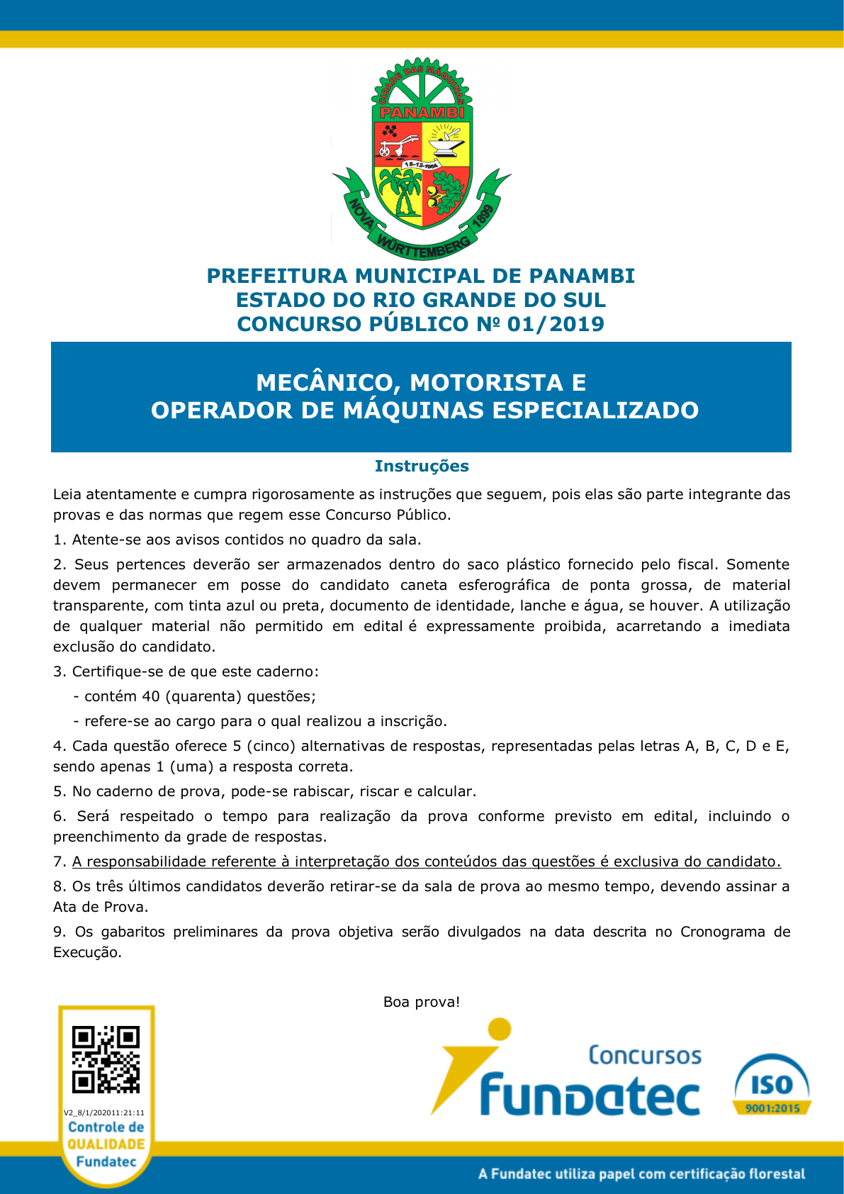 pcimarkpci MDAwMDowMDAwOjAwMDA6MDAwMDowMDAwOmZmZmY6MzZlOTpjMjU5:VHVlLCAxNCBTZXAgMjAyMSAyMjozNjo0NCAtMDMwMA== V1_8/1/202011:21:11 V2_8/1/202011:21:11 PREFEITURA MUNICIPAL DE PANAMBI ESTADO DO RIO GRANDE DO SUL CONCURSO PÚBLICO Nº 01/2019 Instruções Leia atentamente e cumpra rigorosamente as instruções que seguem, pois elas são parte integrante das provas e das normas que regem esse Concurso Público. 1. Atente-se aos avisos contidos no quadro da sala. 2. Seus pertences deverão ser armazenados dentro do saco plástico fornecido pelo fiscal. Somente devem permanecer em posse do candidato caneta esferográfica de ponta grossa, de material transparente, com tinta azul ou preta, documento de identidade, lanche e água, se houver. A utilização de qualquer material não permitido em edital é expressamente proibida, acarretando a imediata exclusão do candidato. 3. Certifique-se de que este caderno: - contém 40 (quarenta) questões; - refere-se ao cargo para o qual realizou a inscrição. 4. Cada questão oferece 5 (cinco) alternativas de respostas, representadas pelas letras A, B, C, D e E, sendo apenas 1 (uma) a resposta correta. 5. No caderno de prova, pode-se rabiscar, riscar e calcular. 6. Será respeitado o tempo para realização da prova conforme previsto em edital, incluindo o preenchimento da grade de respostas. 7. A responsabilidade referente à interpretação dos conteúdos das questões é exclusiva do candidato. 8. Os três últimos candidatos deverão retirar-se da sala de prova ao mesmo tempo, devendo assinar a Ata de Prova. 9. Os gabaritos preliminares da prova objetiva serão divulgados na data descrita no Cronograma de Execução. Boa prova! MECÂNICO, MOTORISTA E OPERADOR DE MÁQUINAS ESPECIALIZADO pcimarkpci MDAwMDowMDAwOjAwMDA6MDAwMDowMDAwOmZmZmY6MzZlOTpjMjU5:VHVlLCAxNCBTZXAgMjAyMSAyMjozNjo0NCAtMDMwMA== 544_BASE_NFC_15/1/202011:55:16 Execução: Fundatec NÍVEL FUNDAMENTAL COMPLETO LÍNGUA PORTUGUESA Instrução: As questões de números 01 a 15 referem-se ao texto abaixo. Açúcar não combina com crianças Por Flávio Pereira 01 02 03 04 05 06 07 08 09 10 11 12 13 14 15 16 17 18 19 20 21 22 23 24 25 26 Dados recentes do Ministério da Saúde revelam que 49% das crianças brasileiras, com menos de 2 anos, têm metade da sua alimentação diária composta por ultraprocessados (bolachas recheadas, refrigerantes, bolos prontos, margarina, caldos, molhos e temperos prontos, macarrão instantâneo, gelatina etc.). Ainda segundo o órgão federal, 15,9% das crianças com menos de 5 anos já apresentam excesso de peso no país A obesidade infantil é uma das possíveis consequências desse consumo excessivo e precoce mas certamente não é a única. O Guia Alimentar Para a População Brasileira, publicado em 2014 pelo Ministério da Saúde, já tinha entre suas principais orientações a redução do consumo de produtos ultraprocessados e o aumento da ingestão de alimentos naturais. Recentemente, foi lançada uma nova versão do documento: o Guia Alimentar para Crianças Brasileiras Menores de 2 anos. A publicação traz entre as atualizações a recomendação de que as crianças menores de dois anos não tenham nenhum contato com açúcar nem com ultraprocessados, pois nesta fase de formação da criança há uma grande necessidade de nutrientes. Além disso, é também uma fase na qual as crianças ingerem pequenas quantidades de alimentos por vez, então, se as refeições forem compostas por produtos nutricionalmente pobres, como açúcar, sódio e gordura (que estão na composição dos alimentos ultraprocessados), elas deixarão os pequenos saciados e ocuparão o espaço das vitaminas, fibras e minerais, presentes nos alimentos naturais. Essa substituição faz com que as crianças fiquem mal nutridas e tenham seu desenvolvimento prejudicado. É fato que o excesso de peso aumenta a tendência às doenças crônicas como diabetes tipo 2, hipertensão, colesterol alto, problemas cardíacos e até câncer, males normalmente vistos em adultos, mas que está cada vez mais comum entre os pequenos. De acordo com o nutricionista da Fiocruz, Cristiano Boccolini: “O cenário de obesidade infantil é muito preocupante, com índices cada vez mais altos de diabetes e hipertensão. Cada vez mais as crianças estão recebendo produtos ultraprocessados em vez de comida de verdade. Temos de desembalar menos e descascar mais”, defende o profissional. Disponível em: http://www.osul.com.br/acucar-nao-combina-com-criancas-e-nos-primeiros-dois-anos- deve-ficar-longe-delas/ – Texto especialmente adaptado para esta prova) QUESTÃO 01 – De acordo com o texto, é correto afirmar que: A) Não é aconselhável que exista algum tipo de orientação quanto à alimentação das crianças, pois quem escolhe o que seus filhos devem comer são os pais. B) A obesidade infantil não tem relação com o consumo excessivo de produtos ultraprocessados. C) Após os 5 anos de idade, não é necessário regular a alimentação das crianças, pois elas já sabem quais são os alimentos mais nutritivos. D) Os produtos ultraprocessados devem fazer parte apenas da metade da alimentação diária das crianças menores de 2 anos, para evitar o excesso de peso nessa faixa etária. E) Existe um documento nacional que orienta que as crianças menores de 2 anos de idade não consumam açúcar. QUESTÃO 02 – Quais sinais de pontuação substituem corretamente as figuras nas linhas 5 e 6, respectivamente? A) vírgula – vírgula. B) ponto de interrogação – vírgula. C) vírgula – dois pontos. D) ponto final – vírgula. E) vírgula – ponto final. pcimarkpci MDAwMDowMDAwOjAwMDA6MDAwMDowMDAwOmZmZmY6MzZlOTpjMjU5:VHVlLCAxNCBTZXAgMjAyMSAyMjozNjo0NCAtMDMwMA== 544_BASE_NFC_15/1/202011:55:16 Execução: Fundatec NÍVEL FUNDAMENTAL COMPLETO QUESTÃO 03 – Leia as afirmações a seguir sobre o texto: I. No trecho “Temos de desembalar menos e descascar mais”, compreende-se que o profissional citad