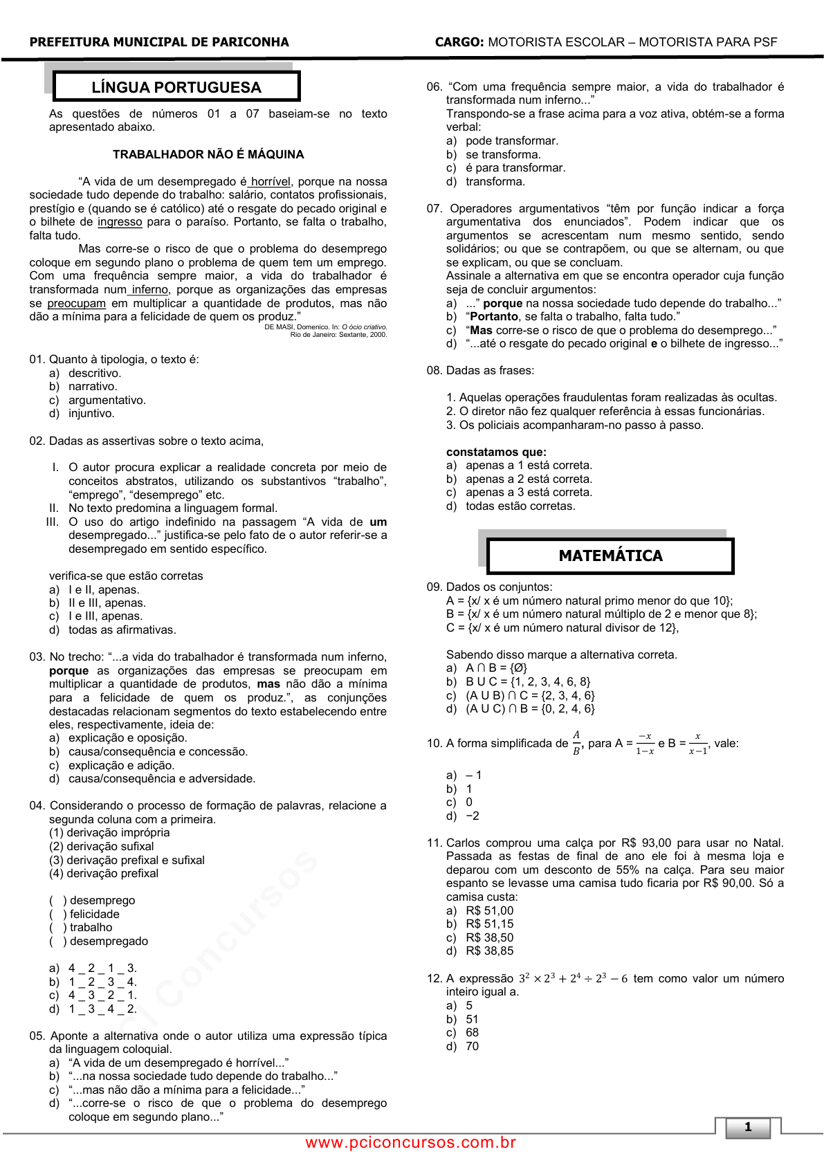 pcimarkpci MDAwMDowMDAwOjAwMDA6MDAwMDowMDAwOmZmZmY6MzZlOTpjMjU5:V2VkLCAxNSBTZXAgMjAyMSAwMTozNTo1MSAtMDMwMA== PREFEITURA MUNICIPAL DE PARICONHA CARGO: MOTORISTA ESCOLAR – MOTORISTA PARA PSF 1 As questões de números 01 a 07 baseiam-se no texto apresentado abaixo. TRABALHADOR NÃO É MÁQUINA “A vida de um desempregado é horrível, porque na nossa sociedade tudo depende do trabalho: salário, contatos profissionais, prestígio e (quando se é católico) até o resgate do pecado original e o bilhete de ingresso para o paraíso. Portanto, se falta o trabalho, falta tudo. Mas corre-se o risco de que o problema do desemprego coloque em segundo plano o problema de quem tem um emprego. Com uma frequência sempre maior, a vida do trabalhador é transformada num inferno, porque as organizações das empresas se preocupam em multiplicar a quantidade de produtos, mas não dão a mínima para a felicidade de quem os produz.” DE MASI, Domenico. In: O ócio criativo. Rio de Janeiro: Sextante, 2000. 01. Quanto à tipologia, o texto é: a) descritivo. b) narrativo. c) argumentativo. d) injuntivo. 02. Dadas as assertivas sobre o texto acima, I. O autor procura explicar a realidade concreta por meio de conceitos abstratos, utilizando os substantivos “trabalho”, “emprego”, “desemprego” etc. II. No texto predomina a linguagem formal. III. O uso do artigo indefinido na passagem “A vida de um desempregado...” justifica-se pelo fato de o autor referir-se a desempregado em sentido específico. verifica-se que estão corretas a) I e II, apenas. b) II e III, apenas. c) I e III, apenas. d) todas as afirmativas. 03. No trecho: “...a vida do trabalhador é transformada num inferno, porque as organizações das empresas se preocupam em multiplicar a quantidade de produtos, mas não dão a mínima para a felicidade de quem os produz.”, as conjunções destacadas relacionam segmentos do texto estabelecendo entre eles, respectivamente, ideia de: a) explicação e oposição. b) causa/consequência e concessão. c) explicação e adição. d) causa/consequência e adversidade. 04. Considerando o processo de formação de palavras, relacione a segunda coluna com a primeira. (1) derivação imprópria (2) derivação sufixal (3) derivação prefixal e sufixal (4) derivação prefixal ( ) desemprego ( ) felicidade ( ) trabalho ( ) desempregado a) 4 _ 2 _ 1 _ 3. b) 1 _ 2 _ 3 _ 4. c) 4 _ 3 _ 2 _ 1. d) 1 _ 3 _ 4 _ 2. 05. Aponte a alternativa onde o autor utiliza uma expressão típica da linguagem coloquial. a) “A vida de um desempregado é horrível...” b) “...na nossa sociedade tudo depende do trabalho...” c) “...mas não dão a mínima para a felicidade...” d) “...corre-se o risco de que o problema do desemprego coloque em segundo plano...” 06. “Com uma frequência sempre maior, a vida do trabalhador é transformada num inferno...” Transpondo-se a frase acima para a voz ativa, obtém-se a forma verbal: a) pode transformar. b) se transforma. c) é para transformar. d) transforma. 07. Operadores argumentativos “têm por função indicar a força argumentativa dos enunciados”. Podem indicar que os argumentos se acrescentam num mesmo sentido, sendo solidários; ou que se contrapõem, ou que se alternam, ou que se explicam, ou que se concluam. Assinale a alternativa em que se encontra operador cuja função seja de concluir argumentos: a) ...” porque na nossa sociedade tudo depende do trabalho...” b) “Portanto, se falta o trabalho, falta tudo.” c) “Mas corre-se o risco de que o problema do desemprego...” d) “...até o resgate do pecado original e o bilhete de ingresso...” 08. Dadas as frases: 1. Aquelas operações fraudulentas foram realizadas às ocultas. 2. O diretor não fez qualquer referência à essas funcionárias. 3. Os policiais acompanharam-no passo à passo. constatamos que: a) apenas a 1 está correta. b) apenas a 2 está correta. c) apenas a 3 está correta. d) todas estão corretas. 09. Dados os conjuntos: A = {x/ x é um número natural primo menor do que 10}; B = {x/ x é um número natural múltiplo de 2 e menor que 8}; C = {x/ x é um número natural divisor de 12}, Sabendo disso marque a alternativa correta. a) A ∩ B = {Ø} b) B U C = {1, 2, 3, 4, 6, 8} c) (A U B) ∩ C = {2, 3, 4, 6} d) (A U C) ∩ B = {0, 2, 4, 6} 10. A forma simplificada de 𝐴 𝐵 , para A = −𝑥 1−𝑥 e B = 𝑥 𝑥−1 , vale: a) – 1 b) 1 c) 0 d) −2 11. Carlos comprou uma calça por R$ 93,00 para usar no Natal. Passada as festas de final de ano ele foi à mesma loja e deparou com um desconto de 55% na calça. Para seu maior espanto se levasse uma camisa tudo ficaria por R$ 90,00. Só a camisa custa: a) R$ 51,00 b) R$ 51,15 c) R$ 38,50 d) R$ 38,85 12. A expressão 32 × 23 + 24 ÷ 23 − 6 tem como valor um número inteiro igual a. a) 5 b) 51 c) 68 d) 70 LÍNGUA PORTUGUESA MATEMÁTICA www.pciconcursos.com.br pcimarkpci MDAwMDowMDAwOjAwMDA6MDAwMDowMDAwOmZmZmY6MzZlOTpjMjU5:V2VkLCAxNSBTZXAgMjAyMSAwMTozNTo1MSAtMDMwMA== PREFEITURA MUNICIPAL DE PARICONHA CARGO: MOTORISTA ESCOLAR – MOTORISTA PARA PSF 2 13. O valor do condomínio de um determinado prédio é R$ 220,00. Sabendo que este prédio possui cinco andares com sete apartamentos por andar, e que o sindico só paga 50% do condomínio, determine o valor total da arrecadação deste prédio. a) R$ 1 540,00 b) R$ 2 640,00 c) R$ 7 480,00 d) R$ 7 590,00 14. Uma partida de futebol que começou às 21 horas e 12 minutos, com dois tempos de 45 minutos. No primeiro tempo teve um acréscimo de 3 minutos e no segundo tempo um acréscimo de 5 minutos. A partida de futebol terminou às. a) 22 horas e 50 minutos b) 22 horas e 40 minutos c) 22 horas e 30 minutos d) 23 horas 15. Pedro tem um terreno que a frente fica para a rua A e o fundo para a rua B. Para facilitar a venda ele loteou seu terreno em quatro outros, conforme indicado na figura. Qual a medida dos fundos para a rua B de cada lote, respectivamente, sabendo qu