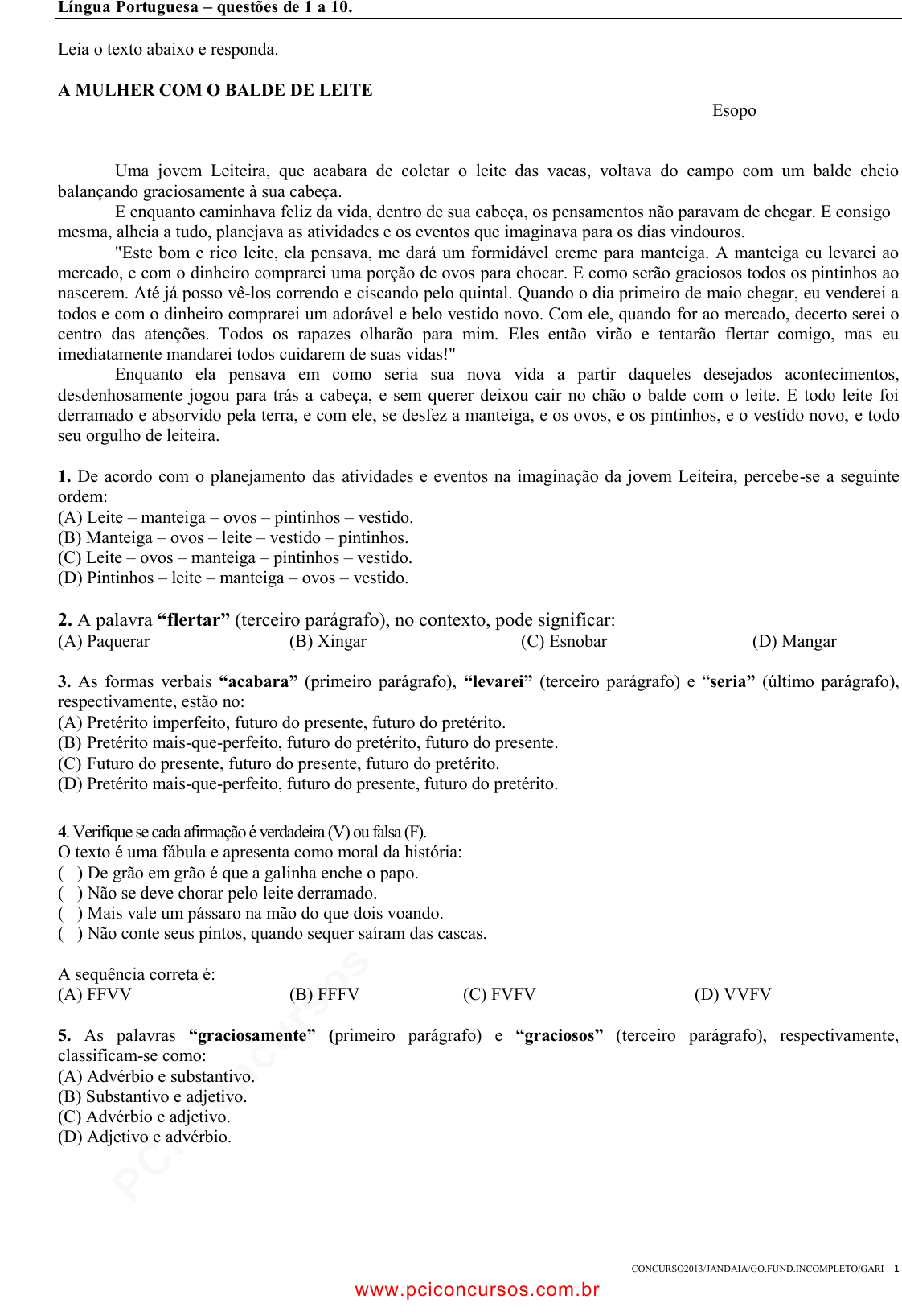 pcimarkpci MDAwMDowMDAwOjAwMDA6MDAwMDowMDAwOmZmZmY6MzZlOTpjMjU5:V2VkLCAxNSBTZXAgMjAyMSAwNTozODoyOSAtMDMwMA== CONCURSO2013/JANDAIA/GO.FUND.INCOMPLETO/GARI 1 Língua Portuguesa – questões de 1 a 10. Leia o texto abaixo e responda. A MULHER COM O BALDE DE LEITE Esopo Uma jovem Leiteira, que acabara de coletar o leite das vacas, voltava do campo com um balde cheio balançando graciosamente à sua cabeça. E enquanto caminhava feliz da vida, dentro de sua cabeça, os pensamentos não paravam de chegar. E consigo mesma, alheia a tudo, planejava as atividades e os eventos que imaginava para os dias vindouros. "Este bom e rico leite, ela pensava, me dará um formidável creme para manteiga. A manteiga eu levarei ao mercado, e com o dinheiro comprarei uma porção de ovos para chocar. E como serão graciosos todos os pintinhos ao nascerem. Até já posso vê-los correndo e ciscando pelo quintal. Quando o dia primeiro de maio chegar, eu venderei a todos e com o dinheiro comprarei um adorável e belo vestido novo. Com ele, quando for ao mercado, decerto serei o centro das atenções. Todos os rapazes olharão para mim. Eles então virão e tentarão flertar comigo, mas eu imediatamente mandarei todos cuidarem de suas vidas!" Enquanto ela pensava em como seria sua nova vida a partir daqueles desejados acontecimentos, desdenhosamente jogou para trás a cabeça, e sem querer deixou cair no chão o balde com o leite. E todo leite foi derramado e absorvido pela terra, e com ele, se desfez a manteiga, e os ovos, e os pintinhos, e o vestido novo, e todo seu orgulho de leiteira. 1. De acordo com o planejamento das atividades e eventos na imaginação da jovem Leiteira, percebe-se a seguinte ordem: (A) Leite – manteiga – ovos – pintinhos – vestido. (B) Manteiga – ovos – leite – vestido – pintinhos. (C) Leite – ovos – manteiga – pintinhos – vestido. (D) Pintinhos – leite – manteiga – ovos – vestido. 2. A palavra “flertar” (terceiro parágrafo), no contexto, pode significar: (A) Paquerar (B) Xingar (C) Esnobar (D) Mangar 3. As formas verbais “acabara” (primeiro parágrafo), “levarei” (terceiro parágrafo) e “seria” (último parágrafo), respectivamente, estão no: (A) Pretérito imperfeito, futuro do presente, futuro do pretérito. (B) Pretérito mais-que-perfeito, futuro do pretérito, futuro do presente. (C) Futuro do presente, futuro do presente, futuro do pretérito. (D) Pretérito mais-que-perfeito, futuro do presente, futuro do pretérito. 4. Verifique se cada afirmação é verdadeira (V) ou falsa (F). O texto é uma fábula e apresenta como moral da história: ( ) De grão em grão é que a galinha enche o papo. ( ) Não se deve chorar pelo leite derramado. ( ) Mais vale um pássaro na mão do que dois voando. ( ) Não conte seus pintos, quando sequer saíram das cascas. A sequência correta é: (A) FFVV (B) FFFV (C) FVFV (D) VVFV 5. As palavras “graciosamente” (primeiro parágrafo) e “graciosos” (terceiro parágrafo), respectivamente, classificam-se como: (A) Advérbio e substantivo. (B) Substantivo e adjetivo. (C) Advérbio e adjetivo. (D) Adjetivo e advérbio. www.pciconcursos.com.br pcimarkpci MDAwMDowMDAwOjAwMDA6MDAwMDowMDAwOmZmZmY6MzZlOTpjMjU5:V2VkLCAxNSBTZXAgMjAyMSAwNTozODoyOSAtMDMwMA== CONCURSO2013/JANDAIA/GO.FUND.INCOMPLETO/GARI 2 6. Na tira, o humor é produzido a partir de relações que contrapõem: (A) A curiosidade e o espanto da menina. (B) O desejo da menina e a potência do rádio. (C) A voz do apresentador e o ruído produzido pelo rádio. (D) O equipamento do rádio e o conteúdo nele veiculado. 7. Considerando-se o papel do rádio como divulgador cultural, o que favorece a enunciação da crítica no último quadrinho? (A) A facilidade da população em aderir às mensagens das rádios. (B) A qualidade duvidosa das músicas tocadas durante a programação do rádio. (C) A substituição do rádio por veículos de informação visual. (D) A importância de tocar todos os gêneros musicais no rádio. 8. No segundo quadrinho, há a tentativa de reproduzir os sons ouvidos pela personagem. Além de dar a sensação de que o rádio está com defeito, o modo como as letras estão organizadas ajuda a representar: (A) as notas musicais presentes na composição. (B) o som exato produzido pelos instrumentos. (C) as palavras constantes da letra da música. (D) o efeito da música sobre a personagem. A RÃ E O BOI No prado, certa rã olhava um boi E, cheia de inveja pela grandeza dele, Inchou sua pele e perguntou a seus filhotes Se era maior que o boi. Como eles disseram que não, Novamente ela esticou sua pele E voltou a perguntar quem era maior. Os filhotes disseram que era o boi. Finalmente, indignada, quando quis se inchar com mais força, Caiu com o corpo estourado. Caio Júlio Fedro 9. No texto, há uma crítica: (A) À modéstia do boi. (C) À inveja dos filhotes. (B) À inveja da rã. (D) Ao orgulho do boi. 10. Considere os trechos. ... também contam para a avaliação do desempenho profissional − só que negativamente. ... e preparar-se para buscar uma recolocação no mercado de trabalho. ... Dois meses atrás, houve nova demissão na empresa. Assinale a alternativa que apresenta, correta e respectivamente, as circunstâncias expressas pelos termos em destaque. (A) negação, adição e tempo. (C) modo, lugar e tempo. (B) modo, lugar e consequência. (D) contraste, adição e causa. CHI!...O RÁDIO ESTÁ COM DEFEITO! ACABAMOS DE OUVIR UM CONCERTO DE MÚSICA ELETRÔNICA. OH!...A ARTE ESTÁ COM DEFEITO!... www.pciconcursos.com.br pcimarkpci MDAwMDowMDAwOjAwMDA6MDAwMDowMDAwOmZmZmY6MzZlOTpjMjU5:V2VkLCAxNSBTZXAgMjAyMSAwNTozODoyOSAtMDMwMA== CONCURSO2013/JANDAIA/GO.FUND.INCOMPLETO/GARI 3 Matemática – questões de 11 a 20. 11. Victor trabalha em uma banca de jornal. De segunda-feira a sábado, vende 160 jornais por dia. Nos dias de domingo vende 80 jornais a mais que em outros dias. Portanto, o número de jornais vendidos por V