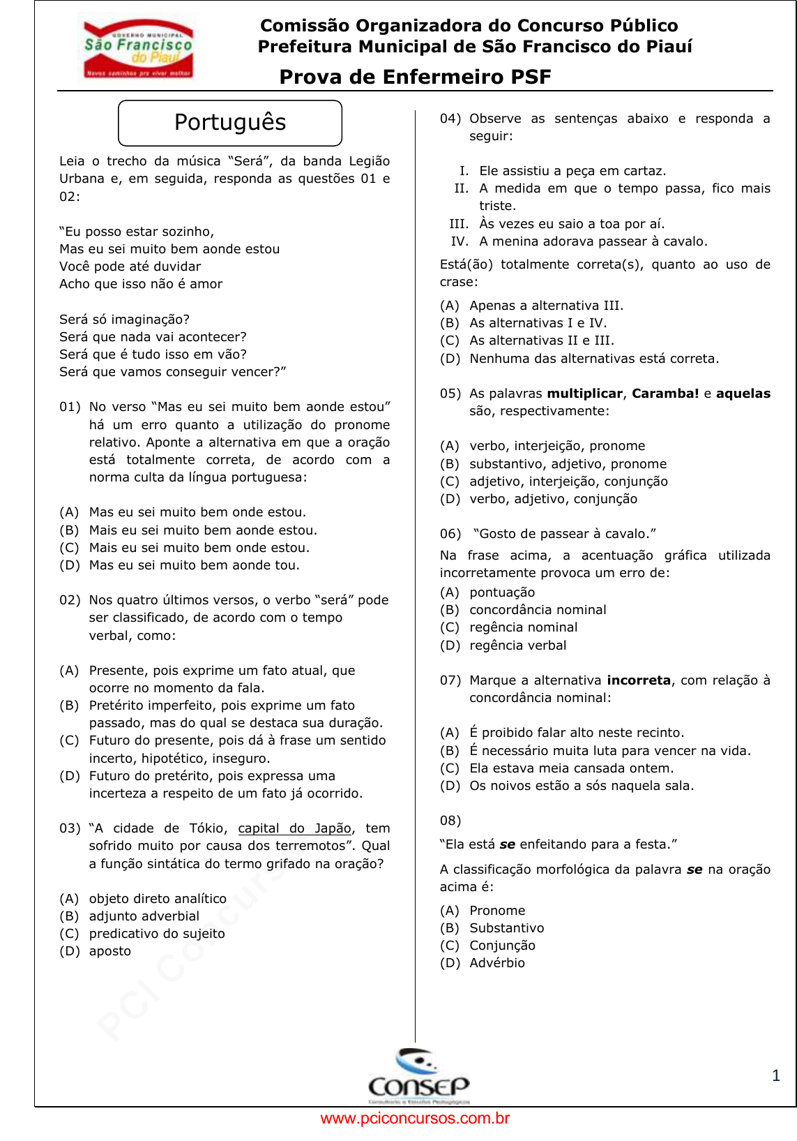 pcimarkpci MDAwMDowMDAwOjAwMDA6MDAwMDowMDAwOmZmZmY6MzZlOTpjMjU5:V2VkLCAxNSBTZXAgMjAyMSAxMzoyNjo0MSAtMDMwMA== Comissão Organizadora do Concurso Público Prefeitura Municipal de São Francisco do Piauí Prova de Enfermeiro PSF 1 Leia o trecho da música ―Será‖, da banda Legião Urbana e, em seguida, responda as questões 01 e 02: ―Eu posso estar sozinho, Mas eu sei muito bem aonde estou Você pode até duvidar Acho que isso não é amor Será só imaginação? Será que nada vai acontecer? Será que é tudo isso em vão? Será que vamos conseguir vencer?‖ 01) No verso ―Mas eu sei muito bem aonde estou‖ há um erro quanto a utilização do pronome relativo. Aponte a alternativa em que a oração está totalmente correta, de acordo com a norma culta da língua portuguesa: (A) Mas eu sei muito bem onde estou. (B) Mais eu sei muito bem aonde estou. (C) Mais eu sei muito bem onde estou. (D) Mas eu sei muito bem aonde tou. 02) Nos quatro últimos versos, o verbo ―será‖ pode ser classificado, de acordo com o tempo verbal, como: (A) Presente, pois exprime um fato atual, que ocorre no momento da fala. (B) Pretérito imperfeito, pois exprime um fato passado, mas do qual se destaca sua duração. (C) Futuro do presente, pois dá à frase um sentido incerto, hipotético, inseguro. (D) Futuro do pretérito, pois expressa uma incerteza a respeito de um fato já ocorrido. 03) ―A cidade de Tókio, capital do Japão, tem sofrido muito por causa dos terremotos‖. Qual a função sintática do termo grifado na oração? (A) objeto direto analítico (B) adjunto adverbial (C) predicativo do sujeito (D) aposto 04) Observe as sentenças abaixo e responda a seguir: I. Ele assistiu a peça em cartaz. II. A medida em que o tempo passa, fico mais triste. III. Às vezes eu saio a toa por aí. IV. A menina adorava passear à cavalo. Está(ão) totalmente correta(s), quanto ao uso de crase: (A) Apenas a alternativa III. (B) As alternativas I e IV. (C) As alternativas II e III. (D) Nenhuma das alternativas está correta. 05) As palavras multiplicar, Caramba! e aquelas são, respectivamente: (A) verbo, interjeição, pronome (B) substantivo, adjetivo, pronome (C) adjetivo, interjeição, conjunção (D) verbo, adjetivo, conjunção 06) ―Gosto de passear à cavalo.‖ Na frase acima, a acentuação gráfica utilizada incorretamente provoca um erro de: (A) pontuação (B) concordância nominal (C) regência nominal (D) regência verbal 07) Marque a alternativa incorreta, com relação à concordância nominal: (A) É proibido falar alto neste recinto. (B) É necessário muita luta para vencer na vida. (C) Ela estava meia cansada ontem. (D) Os noivos estão a sós naquela sala. 08) ―Ela está se enfeitando para a festa.‖ A classificação morfológica da palavra se na oração acima é: (A) Pronome (B) Substantivo (C) Conjunção (D) Advérbio Português www.pciconcursos.com.br pcimarkpci MDAwMDowMDAwOjAwMDA6MDAwMDowMDAwOmZmZmY6MzZlOTpjMjU5:V2VkLCAxNSBTZXAgMjAyMSAxMzoyNjo0MSAtMDMwMA== Comissão Organizadora do Concurso Público Prefeitura Municipal de São Francisco do Piauí Prova de Enfermeiro PSF 2 09) “Espere sentado / Ou você se cansa / Está provado, quem espera nunca alcança.‖ (Chico Buarque) Nos versos acima ocorre uma figura de linguagem. Aponte-a: (A) Catacrese (B) Ironia (C) Apóstrofe (D) Aliteração 10) “A presidente Dilma Rousseff desembarcou às 22h15 desta quarta (horário local; 11h15 no horário brasileiro) em Sanya, na China, onde participará nesta quinta do encontro de cúpula dos chamados Brics, grupo que reúne as principais nações emergentes (Brasil, Rússia, Índia, China e, pela primeira vez, África do Sul).” Fonte: www.globo.com No texto acima, predomina a seguinte função da linguagem: (A) Referencial (B) Conativa (C) Fática (D) Metalinguística 11) Ao atender um paciente hipertenso, o profissional de saúde da rede básica de saúde deve procurar por indícios clínicos de hipertensão arterial secundária, a fim de levantar a hipótese diagnóstica e de fazer o devido encaminhamento a especialistas. De acordo com os principais indícios clínicos que devem ser pesquisados para afastar ou confirmar a presença da hipertensão secundária assinale a alternativa CORRETA: (A) Potássio sérico superior a 3,5 meq./-¹, na ausência de tratamento com diuréticos. (B) Ausência de história familiar. (C) Início leve de hipertensão moderada, com retinopatia, hematúria e perda de função renal (HAS acelerada ou benigna). (D) Diminuição da creatinina. 12) Um dos aspectos mais importantes para garantir a acurácia das medidas de pressão arterial é a utilização de manguitos de dimensões recomendadas para o uso nas diversas faixas etárias e locais de medida da PA. A utilização de aparelhos de pressão com manguitos de dimensões fora das recomendadas acarretará imprecisão dos resultados obtidos. De acordo com as situações especiais para a medida da pressão arterial, marque V para afirmativa(s) verdadeira(s) ou F para falsa(s): ) Em crianças: a largura da bolsa de borracha do manguito deve corresponder a 40% da circunferência do braço. ) Em crianças: o comprimento da bolsa de borracha do manguito deve envolver 80% a 100% da circunferência do braço. ) Em gestantes: recomenda-se que a medida da pressão arterial seja feita na posição sentada. A determinação da pressão diastólica deve ser realizada na fase V de Korotkoff. ) No idoso, dentre os aspectos importantes: a maior freqüência de hiato auscultatório, que consiste no desaparecimento dos sons na ausculta durante a deflação do manguito, geralmente entre o final da fase I e o início da fase II dos sons de Korotkoff. Tal achado pode subestimar a verdadeira pressão sistólica ou superestimar a pressão diastólica. ) Em crianças: a pressão diastólica deve ser determinada na fase V de Korotkoff. Assinale a seqüência correta: (A) V, V, F, V, F; (B) F, F V, F, V; (C) V, F, V, F