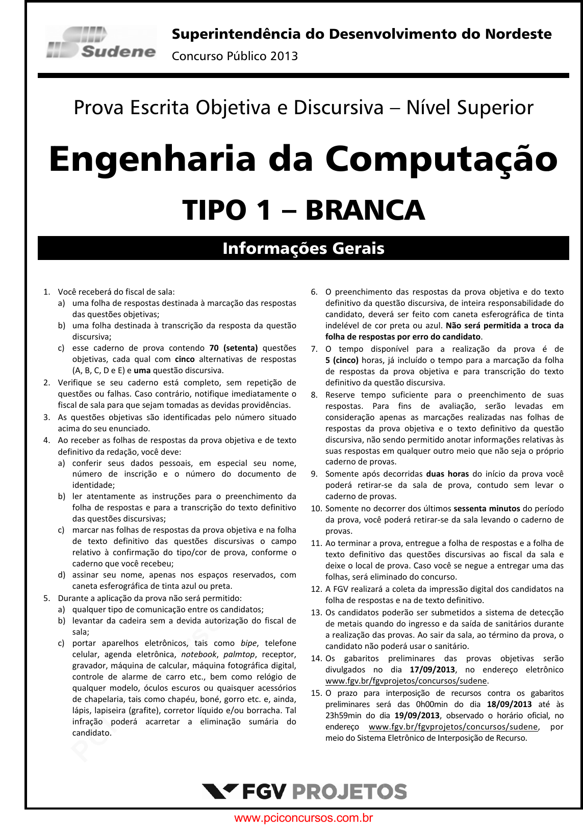 pcimarkpci MDAwMDowMDAwOjAwMDA6MDAwMDowMDAwOmZmZmY6MzZlOTpjMjU5:V2VkLCAxNSBTZXAgMjAyMSAxNToyNDoxNSAtMDMwMA== E 1. 2. 3. 4. 5. Prov Eng Você receberá a) uma folha das questõ b) uma folha discursiva; c) esse cade objetivas, (A, B, C, D Verifique se questões ou f fiscal de sala p As questões o acima do seu e Ao receber as definitivo da r a) conferir s número d identidade b) ler atenta folha de r das questõ c) marcar na de texto relativo à caderno q d) assinar se caneta esf Durante a apli a) qualquer t b) levantar d sala; c) portar ap celular, ag gravador, controle d qualquer de chapela lápis, lapis infração candidato va Escr gen á do fiscal de sa de respostas d ões objetivas; a destinada à t ; erno de prova cada qual com e E) e uma que seu caderno e falhas. Caso co para que sejam objetivas são i enunciado. s folhas de resp redação, você d seus dados p de inscrição e e; amente as inst respostas e par ões discursivas; as folhas de res definitivo da confirmação d ue você recebe eu nome, apen ferográfica de t icação da prova tipo de comuni da cadeira sem parelhos eletrô genda eletrôni máquina de ca de alarme de modelo, óculo aria, tais como seira (grafite), c poderá acarr . Superi Concurso rita Ob har TIP ala: destinada à ma ranscrição da contendo 70 m cinco altern estão discursiva está completo ntrário, notifiq tomadas as de identificadas p postas da prova deve: essoais, em e e o número truções para o ra a transcrição ; postas da prov s questões d do tipo/cor de eu; nas nos espaç tinta azul ou pre a não será perm cação entre os m a devida auto ônicos, tais co ica, notebook, alcular, máquin carro etc., be s escuros ou q o chapéu, boné corretor líquido etar a elimin ntendên o Público 2 bjetiva ria d PO 1 Inform rcação das resp resposta da qu (setenta) que nativas de resp a. , sem repetiçã ue imediatame evidas providên elo número si a objetiva e de especial seu n do document o preenchimen o do texto defi va objetiva e na iscursivas o c e prova, confor os reservados, eta. mitido: candidatos; orização do fisc omo bipe, tel palmtop, rece na fotográfica d m como relóg quaisquer aces , gorro etc. e, a o e/ou borrach nação sumári ncia do 2013 e Disc da C – BR mações postas uestão estões postas ão de ente o cias. tuado texto nome, to de nto da initivo a folha campo rme o , com cal de efone eptor, digital, gio de sórios ainda, ha. Tal a do 6. O d c in fo 7. O 5 d d 8. R re c re d s c 9. S p c 10. S d p 11. A te d fo 12. A fo 13. O d a c 14. O d w 15. O p 2 e m Desenvo cursiva Com RAN Gerais O preenchimen definitivo da qu andidato, deve ndelével de co olha de respost O tempo disp 5 (cinco) horas, de respostas d definitivo da qu Reserve tempo espostas. Par onsideração a espostas da p discursiva, não s uas respostas e aderno de prov Somente após d poderá retirar‐ aderno de prov Somente no dec da prova, você provas. Ao terminar a p exto definitivo deixe o local de olhas, será elim A FGV realizará olha de respost Os candidatos p de metais quan a realização das andidato não p Os gabaritos divulgados no www.fgv.br/fgv O prazo para preliminares se 23h59min do d endereço www meio do Sistema olvimen – Níve mpu CA s to das respost uestão discursiv erá ser feito co r preta ou azu tas por erro do ponível para , já incluído o t a prova objet estão discursiv o suficiente p ra fins de penas as marc rova objetiva sendo permitid em qualquer ou vas. decorridas dua se da sala de vas. correr dos últim poderá retirar‐ prova, entregue o das questões e prova. Caso vo minado do conc a coleta da im tas e na de text poderão ser su do do ingresso s provas. Ao sa poderá usar o sa preliminares dia 17/09/2 projetos/concu interposição d rá das 0h00m ia 19/09/2013 w.fgv.br/fgvpr a Eletrônico de I nto do N el Supe uta tas da prova o va, de inteira re om caneta esfe l. Não será pe o candidato. a realização tempo para a iva e para tra a. para o preenc avaliação, se cações realizad e o texto defi do anotar inform utro meio que as horas do iní e prova, cont mos sessenta m ‐se da sala leva e a folha de res s discursivas a ocê se negue a urso. pressão digital to definitivo. ubmetidos a sis o e da saída de ir da sala, ao té anitário. das provas 2013, no end ursos/sudene. de recursos co min do dia 18 3, observado o ojetos/concurs Interposição de Nordeste erior ção objetiva e do te esponsabilidade erográfica de t rmitida a troca da prova é marcação da fo anscrição do te chimento de s rão levadas das nas folhas initivo da ques mações relativa não seja o pró ício da prova v udo sem leva minutos do perí ando o caderno postas e a folha o fiscal da sa a entregar uma dos candidato stema de detec sanitários dura érmino da prov objetivas se dereço eletrô ontra os gaba 8/09/2013 até horário oficial, sos/sudene, e Recurso. e o exto e do tinta a da de olha exto suas em s de stão as às óprio você ar o íodo o de a de la e das s na cção ante va, o erão nico ritos é às , no por www.pciconcursos.com.br pcimarkpci MDAwMDowMDAwOjAwMDA6MDAwMDowMDAwOmZmZmY6MzZlOTpjMjU5:V2VkLCAxNSBTZXAgMjAyMSAxNToyNDoxNSAtMDMwMA== Concurso Público para a Superintendência do Desenvolvimento do Nordeste ‐ SUDENE – 2013 FGV ‐ Projetos Nível Superior – Engenharia da Computação Tipo 1 – Cor Branca – Página 2 Língua Portuguesa Texto Alternativa Envelhecer é chato, mas consolemo‐nos: a alternativa é pior. Ninguém que eu conheça morreu e voltou para contar como é estar morto, mas o consenso geral é que existir é muito melhor do que não existir. Há dúvidas, claro. Muitos acreditam que com a morte se vai desta vida para outra melhor, inclusive mais barata, além de eterna. Só descobriremos quando chegarmos lá. Enquanto isso vamos envelhecendo com a dignidade possível, sem nenhuma vontade de experimentar a alternativa. Mas há casos em que a alternativa para as coisas como estão é conhecida. Já passa