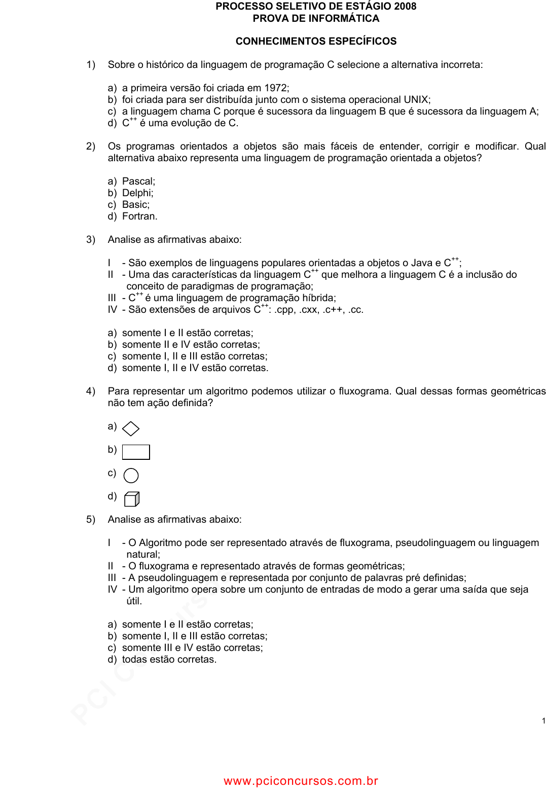 pcimarkpci MDAwMDowMDAwOjAwMDA6MDAwMDowMDAwOmZmZmY6MzZlOTpjMjU5:VGh1LCAxNiBTZXAgMjAyMSAwMDowMDoyNCAtMDMwMA== PROCESSO SELETIVO DE ESTÁGIO 2008 PROVA DE INFORMÁTICA 1 CONHECIMENTOS ESPECÍFICOS 1) Sobre o histórico da linguagem de programação C selecione a alternativa incorreta: a) a primeira versão foi criada em 1972; b) foi criada para ser distribuída junto com o sistema operacional UNIX; c) a linguagem chama C porque é sucessora da linguagem B que é sucessora da linguagem A; d) C++ é uma evolução de C. 2) Os programas orientados a objetos são mais fáceis de entender, corrigir e modificar. Qual alternativa abaixo representa uma linguagem de programação orientada a objetos? a) Pascal; b) Delphi; c) Basic; d) Fortran. 3) Analise as afirmativas abaixo: I - São exemplos de linguagens populares orientadas a objetos o Java e C++; II - Uma das características da linguagem C++ que melhora a linguagem C é a inclusão do conceito de paradigmas de programação; III - C++ é uma linguagem de programação híbrida; IV - São extensões de arquivos C++: .cpp, .cxx, .c++, .cc. a) somente I e II estão corretas; b) somente II e IV estão corretas; c) somente I, II e III estão corretas; d) somente I, II e IV estão corretas. 4) Para representar um algoritmo podemos utilizar o fluxograma. Qual dessas formas geométricas não tem ação definida? a) b) c) d) 5) Analise as afirmativas abaixo: I - O Algoritmo pode ser representado através de fluxograma, pseudolinguagem ou linguagem natural; II - O fluxograma e representado através de formas geométricas; III - A pseudolinguagem e representada por conjunto de palavras pré definidas; IV - Um algoritmo opera sobre um conjunto de entradas de modo a gerar uma saída que seja útil. a) somente I e II estão corretas; b) somente I, II e III estão corretas; c) somente III e IV estão corretas; d) todas estão corretas. www.pciconcursos.com.br pcimarkpci MDAwMDowMDAwOjAwMDA6MDAwMDowMDAwOmZmZmY6MzZlOTpjMjU5:VGh1LCAxNiBTZXAgMjAyMSAwMDowMDoyNCAtMDMwMA== PROCESSO SELETIVO DE ESTÁGIO 2008 PROVA DE INFORMÁTICA 2 6) Assinale a alternativa incorreta quanto a ação das formas geométricas abaixo: a) início e fim de fluxograma b) cálculo de dados exponencial c) impressão de resultados d) ponto de decisão 7) Na linguagem de programação C não é um tipo de variável válida: a) char; b) float; c) string; d) double. 8) Na linguagem de programação C a declaração “Quantos anos você tem? 15?” é armazenada em uma variável do tipo: a) char; b) int; c) float; d) string. 9) Na programação e estrutura de dados do tipo árvore é correto afirmar que são tipos de algoritmos: a) listas, filas e splay; b) splay, red-black e filas; c) splay, red-black e AV1; d) red-black, AV1 e dicionário. 10) Analise as afirmativas abaixo: I - Java é utilizado somente para rede internet; II - Programas escritos em Java podem ser executados virtualmente; III - O código Java executável compilado é chamado bytecodes; IV - Java não é uma linguagem orientada a objetos; V - O processador Virtual Java é o Java Virtual Machine (JVM). a) F, V, V, F, V; b) F, F, V, V, V; c) V, F, V, F, V; d) V, V, F, F, F. 11) As portas lógicas são circuitos eletrônicos que operam sobre um ou mais sinais de entrada para produzirem um sinal de saída, não é exemplo de porta lógica: a) OR; b) YES; c) AND; d) NOT. www.pciconcursos.com.br pcimarkpci MDAwMDowMDAwOjAwMDA6MDAwMDowMDAwOmZmZmY6MzZlOTpjMjU5:VGh1LCAxNiBTZXAgMjAyMSAwMDowMDoyNCAtMDMwMA== PROCESSO SELETIVO DE ESTÁGIO 2008 PROVA DE INFORMÁTICA 3 12) Não é uma propriedade básica da álgebra de Boole: a) comutativa; b) periférica; c) adjacência; d) distributiva. 13) A tabela verdade abaixo representa a porta lógica: A B X 0 0 0 0 1 0 1 0 0 1 1 1 a) AND; b) OR; c) YES; d) NOT. 14) Assinale a alternativa que não corresponde às definições de UML (Unified Modeling Language): a) é uma linguagem de modelagem designada para especificar, visualizar, construir e documentar um sistema; b) a especificação consiste de duas partes: semântica e notação; c) não suporta o desenvolvimento iterativo e incremental; d) é a sucessora da linguagem de modelagem encontrada nos métodos Booch, OOSE e OMT. 15) Assinale a alternativa incorreta: a) desenvolvimento iterativo e incremental é o processo de desenvolvimento de sistemas em pequenos passos; b) para alcançar o resultado final a iteração percorre as seguintes atividades: análise, projeto, implementação e teste. c) a UML é um método de modelagem voltada a modelos de entidades e relacionamentos; d) a análise de requisitos compõem-se dos seguintes diagramas: caso de uso, sequência e colaboração. 16) Analise as afirmativas abaixo: I - O objetivo da elicitação é a aquisição do conhecimento das situações e fatos que compõem os sistemas de informações (SI); II - A tarefa de elicitação e basicamente dividida em duas partes: a identificação das fontes de informação e a coleta das informações; III - A modelagem expressa às informações coletadas após a aplicação das técnicas de elicitação; IV - O objetivo da validação é verificar se as informações adquiridas realmente representam a realidade do sistema de informação (SI); V - A validação é feita a partir do modelo produzido na etapa de modelagem. a) V, V, V, V, V; b) V, V, F, F, V; c) F, V, V, F, F; d) F, F, F, V, V. www.pciconcursos.com.br pcimarkpci MDAwMDowMDAwOjAwMDA6MDAwMDowMDAwOmZmZmY6MzZlOTpjMjU5:VGh1LCAxNiBTZXAgMjAyMSAwMDowMDoyNCAtMDMwMA== PROCESSO SELETIVO DE ESTÁGIO 2008 PROVA DE INFORMÁTICA 4 17) Assinale a alternativa correta: a) As operações lógicas de um computador digital são fisicamente realizadas por circuitos mecânicos; b) os sistemas lógicos são estudados pela álgebra de chaveamento ou álgebra de Boole; c) a álgebra de Boole trabalha com três grandezas: falso, verdadeiro e indefinido; d) a grandeza verdadeiro é representada pelo número “0”. 18)