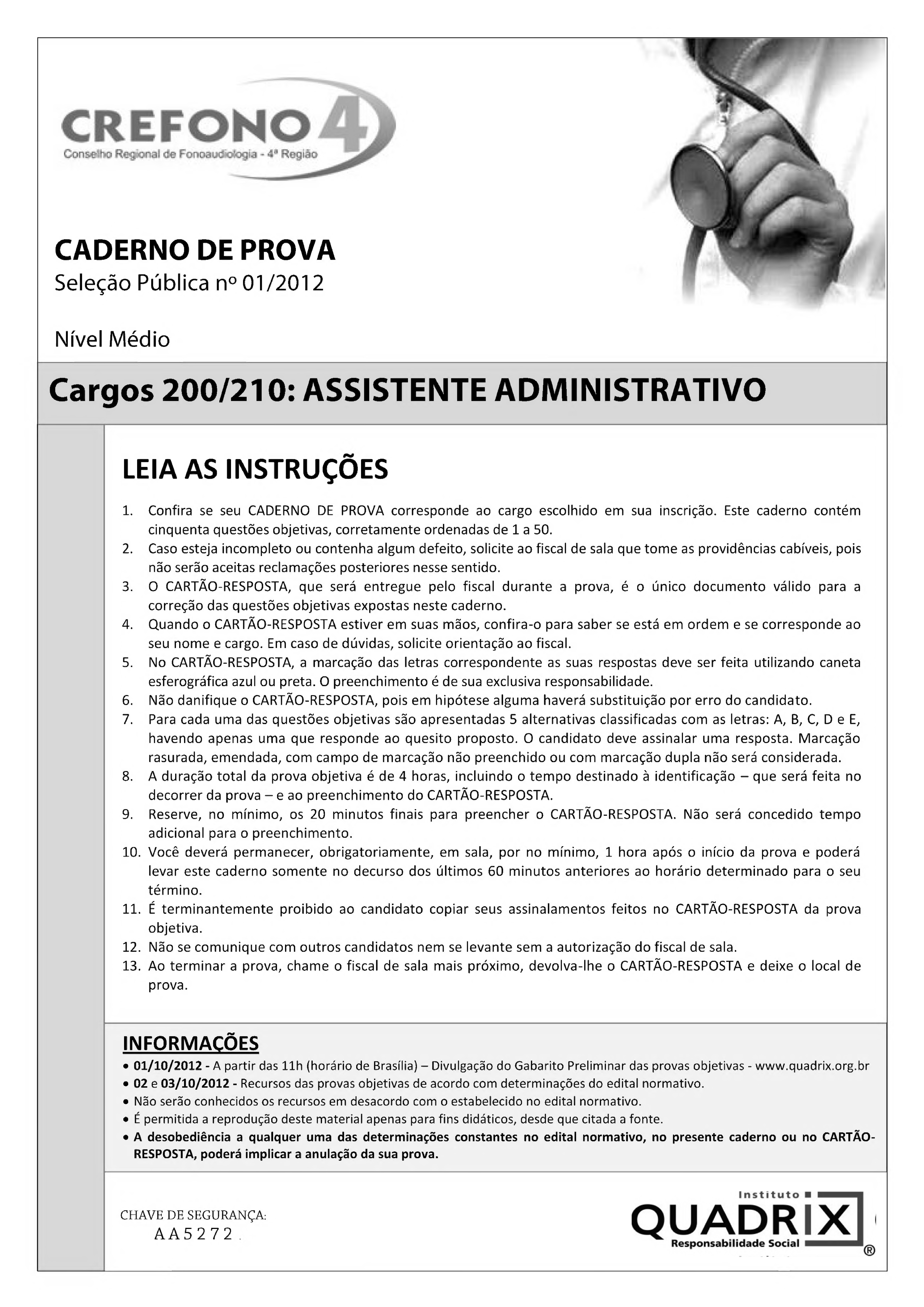 nri f i CADERNO DE PROVA Seleção Pública n° 01/2012 Nível Médio Cargos 200/210: ASSISTENTE ADMINISTRATIVO LEIA AS INSTRUÇÕES 1. Confira se seu CADERNO DE PROVA corresponde ao cargo escolhido em sua inscrição. Este caderno contém cinquenta questões objetivas, corretamente ordenadas de 1 a 50. 2. Caso esteja incompleto ou contenha algum defeito, solicite ao fiscal de sala que tome as providências cabíveis, pois não serão aceitas reclamações posteriores nesse sentido. 3. O CARTAO-RESPOSTA, que será entregue pelo fiscal durante a prova, é o único documento válido para a correção das questões objetivas expostas neste caderno. 4. Quando o CARTÃO-RESPOSTA estiver em suas mãos, confira-o para saber se está em ordem e se corresponde ao seu nome e cargo. Em caso de dúvidas, solicite orientação ao fiscal. f« ^ | j 5. No CARTAO-RESPOSTA, a marcação das letras correspondente as suas respostas deve ser feita utilizando caneta esferográfica azul ou preta. O preenchimento é de sua exclusiva responsabilidade. 6. Não danifique o CARTÃO-RESPOSTA, pois em hipótese alguma haverá substituição por erro do candidato. 7. Para cada uma das questões objetivas são apresentadas 5 alternativas classificadas com as letras: A, B, C, D e E, havendo apenas uma que responde ao quesito proposto. O candidato deve assinalar uma resposta. Marcação rasurada, emendada, com campo de marcação não preenchido ou com marcação dupla não será considerada. 8. A duração total da prova objetiva é de 4 horas, incluindo o tempo destinado à identificação - que será feita no decorrer da prova - e ao preenchimento do CARTÃO-RESPOSTA. 9. Reserve, no mínimo, os 20 minutos finais para preencher o CARTÃO-RESPOSTA. Não será concedido tempo adicional para o preenchimento. 10. Você deverá permanecer, obrigatoriamente, em sala, por no mínimo, 1 hora após o início da prova e poderá levar este caderno somente no decurso dos últimos 60 minutos anteriores ao horário determinado para o seu término. 11. É terminantemente proibido ao candidato copiar seus assinalamentos feitos no CARTÃO-RESPOSTA da prova objetiva. 12. Não se comunique com outros candidatos nem se levante sem a autorização do fiscal de sala. 13. Ao terminar a prova, chame o fiscal de sala mais próximo, devolva-lhe o CARTÃO-RESPOSTA e deixe o local de prova. INFORMAÇÕES • 01/10/2012 - A partir das l lh (horário de Brasília) - Divulgação do Gabarito Preliminar das provas objetivas - www.quadrix.org.br • 02 e 03/10/2012 - Recursos das provas objetivas de acordo com determinações do edital normativo. • Não serão conhecidos os recursos em desacordo com o estabelecido no edital normativo. • É permitida a reprodução deste material apenas para fins didáticos, desde que citada a fonte. • A desobediência a qualquer uma das determinações constantes no edital normativo, no presente caderno ou no CARTÃO- RESPOSTA, poderá implicar a anulação da sua prova. CHAVE DE SEGURANÇA: AA 5 2 7 2 http://www.quadrix.org.br SELEÇÃO PÚBLICA n°01/2012 - CREFONQ4 | 200/210: ASSISTENTE ADMINISTRATIVO Instituto QUADRIX LÍNGUA PORTUGUESA QUESTÃO 1 Observe a tirinha abaixo. AH RAZCIAVaMBJTE BEM. EU ACHO. 69TOU TENDO UM POUCO PE fKOSlEMA COM ARITMÉTICA. ASSUNTO ESSE E O PR061EMA. EU SOU 1 MELHOR EM ALfiO ONDE AS RESPOSBVS NA MAIORIA SÍO Questões DE OPINIÃO. (Disponível em http://www.peonuts.com/) QU ESTÃO 2 Após observar a tirinha, aponte a alternativa que contenha uma frase com a pontuação correta. ACHO QUE VOCE DEVERIA COMEÇAR UM PARA6RAF0 NOVO AQUI, E DEPOIS QUEM SABE COLOCAR ESTA MOSTRA ONDE cf i SÀLPICO À5 MARQÜIMHA5 CUKVAPA5... (A) Os meninos, são muito criativos. (B) Nunca desista de seus sonhos, pois você pode alcançá- los. (C) Ele é, esperto, você é, sagaz. (D) O mundo é um grande quebra-cabeça mas, com ele eu não sei, lidar. (E) Corra e, não, pare disse o pai para, seu filho durante a competição. QUESTÃO 3 Marque a alternativa na qual a frase está correta ortográfica e gramaticalmente. (A) Que mal cheiro neste local! Vamos sair daqui logo. (B) Ela está a salvo aqui, já que este homem é um excelente segurança. (C) Não diga que essa tarefa é para mim fazer, eu já limpei as louças há uma semana atrás. (D) Entre eu e você, nada mais precisa ser discutido. As crianças tem direito de ficar aqui, (E) Fazem vinte anos que ele mora nesta cidade, pois tem muito animo para aguentar a correría do cotidiano. Na frase "Pensei que você gostasse de Aritmética, ela é um assunto tão preciso", o significado que pode ser atribuído ao termo grifado é: (A) Agradável. (B) Necessário. (C) Exato. (D) Vago. (E) Dispensável. QUESTÃO 4 A respeito do sinal de crase, marque a alternativa em que ele é utilizado incorretamente, (A) Cheguei à noite na rodoviária e não havia ninguém. (B) Pablo nunca dá atenção àqueles colegas impertinentes. (C) Esta é a padaria à qual me referi na semana passada. (D) As borboletas estão à voar no quintal desde a manhã. (E) Marina vai à festa vestida de bruxa, disse-me hoje. CHAVE DE SEGURANÇA: A A 5 2 7 2 2 http://www.peonuts.com/ SELEÇÃO PÚBLICA n°01/2012 - CREFONQ4 | 200/210: ASSISTENTE ADMINISTRATIVO Instituto QUADRIX QUESTÃO 5 Assinale a alternativa na qual a concordância verbal está correta. QU ESTÃO 7 Marque a alternativa em que a concordância nominal esteja correta. (A) Há diversas pessoas aqui na festa que estavam no evento da semana passada. (B) Choveu pedrinhas de gelo hoje, você viu? (C) Haviam muitas pessoas fazendo propaganda eleitoral em frente o local da votação. (D) Bateu cinco horas quando ele avisou que precisava ir embora. (E) Fui eu que fechou a porta para o cão não entrar. (A) A casa estava meia desarrumada. (B) Maria comprou duas calças cinzas. (C) Você não acha que os livros custam cada vez mais caros? (D) São bastante difundida as idéias do pensador que você estuda. (E) O lutador chegou c