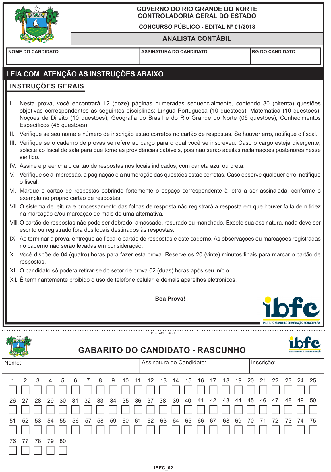 IBFC_02 DESTAQUE AQUI GABARITO DO CANDIDATO - RASCUNHO Nome: Assinatura do Candidato: Inscrição: GOVERNO DO RIO GRANDE DO NORTE CONTROLADORIA GERAL DO ESTADO ANALISTA CONTÁBIL NOME DO CANDIDATO ASSINATURA DO CANDIDATO RG DO CANDIDATO INSTRUÇÕES GERAIS I. Nesta prova, você encontrará 12 (doze) páginas numeradas sequencialmente, contendo 80 (oitenta) questões objetivas correspondentes às seguintes disciplinas: Língua Portuguesa (10 questões), Matemática (10 questões), Noções de Direito (10 questões), Geografia do Brasil e do Rio Grande do Norte (05 questões), Conhecimentos Específicos (45 questões). II. Verifique se seu nome e número de inscrição estão corretos no cartão de respostas. Se houver erro, notifique o fiscal. III. Verifique se o caderno de provas se refere ao cargo para o qual você se inscreveu. Caso o cargo esteja divergente, solicite ao fiscal de sala para que tome as providências cabíveis, pois não serão aceitas reclamações posteriores nesse sentido. IV. Assine e preencha o cartão de respostas nos locais indicados, com caneta azul ou preta. V. Verifique se a impressão, a paginação e a numeração das questões estão corretas. Caso observe qualquer erro, notifique o fiscal. VI. Marque o cartão de respostas cobrindo fortemente o espaço correspondente à letra a ser assinalada, conforme o exemplo no próprio cartão de respostas. VII. O sistema de leitura e processamento das folhas de resposta não registrará a resposta em que houver falta de nitidez na marcação e/ou marcação de mais de uma alternativa. VIII. O cartão de respostas não pode ser dobrado, amassado, rasurado ou manchado. Exceto sua assinatura, nada deve ser escrito ou registrado fora dos locais destinados às respostas. IX. Ao terminar a prova, entregue ao fiscal o cartão de respostas e este caderno. As observações ou marcações registradas no caderno não serão levadas em consideração. X. Você dispõe de 04 (quatro) horas para fazer esta prova. Reserve os 20 (vinte) minutos finais para marcar o cartão de respostas. XI. O candidato só poderá retirar-se do setor de prova 02 (duas) horas após seu início. XII. É terminantemente proibido o uso de telefone celular, e demais aparelhos eletrônicos. Boa Prova! LEIA COM ATENÇÃO AS INSTRUÇÕES ABAIXO 1 2 3 4 5 6 7 8 9 10 11 12 13 14 15 16 2117 2218 2319 2420 25 51 52 53 54 55 56 57 58 59 60 61 62 63 64 65 66 7167 7268 7369 7470 75 26 27 28 29 30 31 32 33 34 35 36 37 38 39 40 41 4642 4743 4844 4945 50 76 77 78 79 80 CONCURSO PÚBLICO - EDITAL Nº 01/2018 RASCUNHO 1IBFC_02 LÍNGUA PORTUGUESA Observe com atenção a tirinha de “Calvin e Haroldo” e responda as questões 1 e 2 a seguir. http://images.virgula.com.br/2015/11/Morte-CalvinHaroldoQuati9.gif 1) De acordo com a leitura atenta da tira acima, de “Calvin e Haroldo”, assinale a alternativa correta: a) A tira é construída integralmente a partir do monólogo do garoto Calvin, personagem que reflete sobre a vida e morte. b) No primeiro quadrinho, há a contra-argumentação de Calvin em relação à visão de mundo da sua mãe sobre a vida e a morte. c) O segundo quadrinho da tira evidencia o caráter inconformista da visão da mãe de Calvin a respeito da fatalidade da morte. d) No último quadrinho, é possível notar na fala do garoto sua preocupação de que seu amigo Haroldo, o tigre, morra. 2) De acordo com a leitura atenta da tira acima, de “Calvin e Haroldo” e, de acordo com a Gramática Normativa da Língua Portuguesa, analise as afirmativas abaixo e assinale a alternativa correta. I. No primeiro quadrinho há o uso do discurso indireto, já que o discurso da mãe é enunciado por outra personagem, no caso, por seu filho Calvin. II. No segundo quadrinho a oração “que nós não entendemos realmente isto” é classificada como Oração Subordinada Substantiva Objetiva Direta. III. Os verbos “pudermos” e “temos” no segundo quadrinho estão conjugados no modo indicativo. IV. O pronome de tratamento “você” no último quadrinho é, sintaticamente, um vocativo por se referir diretamente a Haroldo seu interlocutor. a) Apenas as afirmativas I e II estão corretas. b) Apenas as afirmativas I, II e IV estão corretas. c) Apenas as afirmativas II e III estão corretas. d) Apenas as afirmativas II, III e IV estão corretas. Leia atentamente a letra da canção “O meu Guri” do compositor brasileiro Chico Buarque e responda as questões 3, 4 e 5 a seguir. Quando, seu moço, nasceu meu rebento Não era o momento dele rebentar Já foi nascendo com cara de fome E eu não tinha nem nome pra lhe dar Como fui levando não sei lhe explicar Fui assim levando, ele a me levar E na sua meninice, ele um dia me disse Que chegava lá Olha aí! Olha aí! Olha aí! Ai, o meu guri, olha aí! Olha aí! É o meu guri e ele chega Chega suado e veloz do batente Traz sempre um presente pra me encabular Tanta corrente de ouro, seu moço Que haja pescoço pra enfiar Me trouxe uma bolsa já com tudo dentro Chave, caderneta, terço e patuá Um lenço e uma penca de documentos Pra finalmente eu me identificar (...) Chega no morro com carregamento Pulseira, cimento, relógio, pneu, gravador Rezo até ele chegar cá no alto Essa onda de assaltos está um horror Eu consolo ele, ele me consola Boto ele no colo pra ele me ninar De repente acordo, olho pro lado E o danado já foi trabalhar (...) Chega estampado, manchete, retrato Com venda nos olhos, legenda e as iniciais Eu não entendo essa gente, seu moço Fazendo alvoroço demais O guri no mato, acho que tá rindo Acho que tá lindo de papo pro ar Desde o começo eu não disse, seu moço! Ele disse que chegava lá Olha aí! Olha aí! Ref. https://www.letras.mus.br/chico-buarque/66513/ 3) Na canção “O Meu guri”, o compositor Chico Buarque faz um retrato de determinada classe social. Leia com atenção a letra e analise as afirmativas a seguir, depois assinale a alternativa correta: I. Os versos “Chega estam