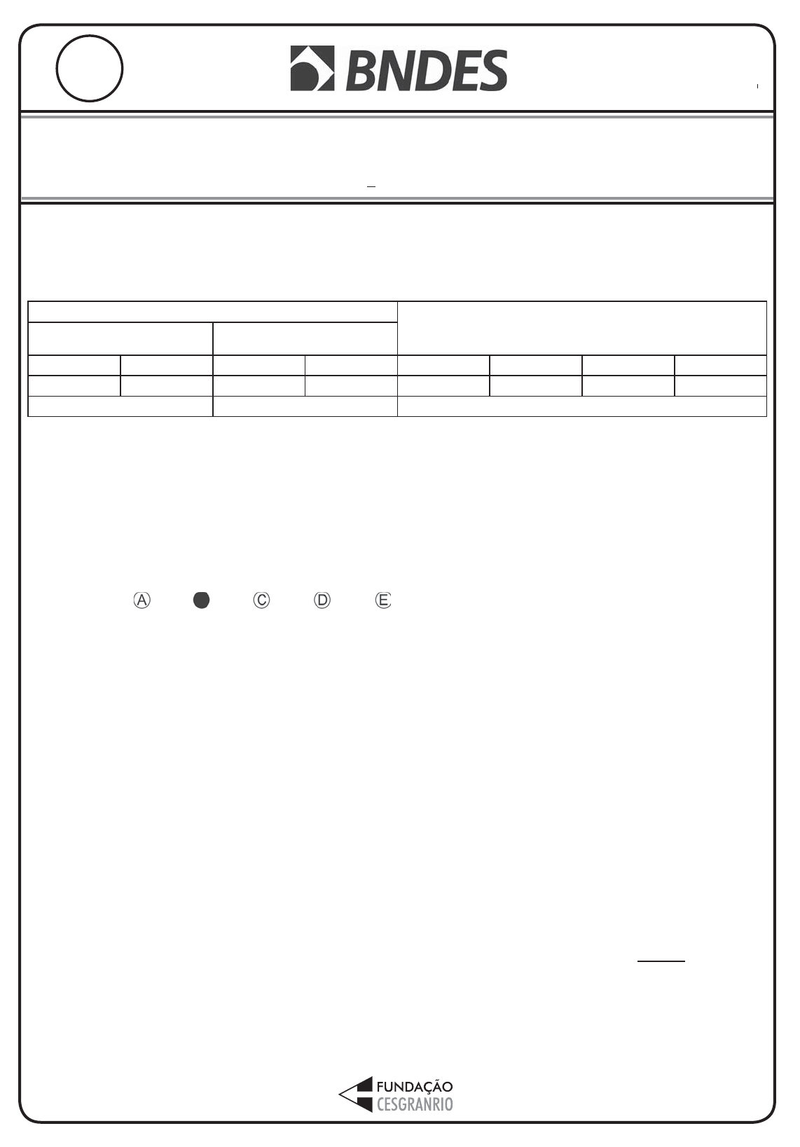 PROFISSIONAL BÁSICO FORMAÇÃO DE ADMINISTRAÇÃO 1 BNDES LEIA ATENTAMENTE AS INSTRUÇÕES ABAIXO. 01 - Você recebeu do fiscal o seguinte material: a) este CADERNO DE QUESTÕES, com o enunciado das 70 (setenta) questões objetivas, sem repetição ou falha, com a seguinte distribuição: CONHECIMENTOS BÁSICOS CONHECIMENTOS ESPECÍFICOSLÍNGUA PORTUGUESA LÍNGUA ESTRANGEIRA(INGLÊS/ESPANHOL) Questões Pontos Questões Pontos Questões Pontos Questões Pontos 1 a 20 1,0 cada 21 a 30 1,0 cada 31 a 50 1,5 cada 51 a 70 2,0 cada Total: 20,0 pontos Total: 10,0 pontos Total: 70,0 pontos b) CARTÃO-RESPOSTA destinado às respostas das questões objetivas formuladas nas provas. 02 - Verifique se este material está em ordem e se o seu nome e o seu número de inscrição conferem com os que aparecem no CARTÃO-RESPOSTA. Caso contrário, notifique o fato IMEDIATAMENTE ao fiscal. 03 - Após a conferência, o candidato deverá assinar, no espaço próprio do CARTÃO-RESPOSTA, com caneta esferográfica transparente de tinta na cor preta. 04 - No CARTÃO-RESPOSTA, a marcação das letras correspondentes às respostas certas deve ser feita cobrindo a letra e preenchendo todo o espaço compreendido pelos círculos, com caneta esferográfica transparente de tinta na cor preta, de forma contínua e densa. A LEITORA ÓTICA é sensível a marcas escuras; portanto, preencha os campos de marcação completamente, sem deixar claros. Exemplo: 05 - Tenha muito cuidado com o CARTÃO-RESPOSTA, para não o DOBRAR, AMASSAR ou MANCHAR. O CARTÃO- -RESPOSTA SOMENTE poderá ser substituído se, no ato da entrega ao candidato, já estiver danificado em suas margens superior e/ou inferior - BARRA DE RECONHECIMENTO PARA LEITURA ÓTICA. 06 - Para cada uma das questões objetivas, são apresentadas 5 alternativas classificadas com as letras (A), (B), (C), (D) e (E); só uma responde adequadamente ao quesito proposto. Você só deve assinalar UMA RESPOSTA: a marcação em mais de uma alternativa anula a questão, MESMO QUE UMA DAS RESPOSTAS ESTEJA CORRETA. 07 - As questões objetivas são identificadas pelo número que se situa acima de seu enunciado. 08 - SERÁ ELIMINADO desta Seleção Pública o candidato que: a) se utilizar, durante a realização das provas, de máquinas e/ou relógios de calcular, bem como de rádios gravadores, headphones, telefones celulares ou fontes de consulta de qualquer espécie; b) se ausentar da sala em que se realizam as provas levando consigo o CADERNO DE QUESTÕES e/ou o CARTÃO- -RESPOSTA. c) se recusar a entregar o CADERNO DE QUESTÕES e/ou o CARTÃO-RESPOSTA, quando terminar o tempo estabelecido. d) não assinar a LISTA DE PRESENÇA e/ou o CARTÃO-RESPOSTA. Obs. O candidato só poderá se ausentar do recinto das provas após 1 (uma) hora contada a partir do efetivo início das mesmas. Por motivos de segurança, o candidato NÃO PODERÁ LEVAR O CADERNO DE QUESTÕES, a qualquer momento. 09 - Reserve os 30 (trinta) minutos finais para marcar seu CARTÃO-RESPOSTA. Os rascunhos e as marcações assinaladas no CADERNO DE QUESTÕES NÃO SERÃO LEVADOS EM CONTA. 10 - Quando terminar, entregue ao fiscal o CADERNO DE QUESTÕES e o CARTÃO-RESPOSTA e ASSINE A LISTA DE PRESENÇA. 11 - O TEMPO DISPONÍVEL PARA ESTAS PROVAS DE QUESTÕES OBJETIVAS É DE 4 (QUATRO) HORAS, já incluído o tempo para marcação do seu CARTÃO-RESPOSTA, findo o qual o candidato deverá, obrigatoriamente, entregar o CARTÃO-RESPOSTA e o CADERNO DE QUESTÕES. 12 - As questões e os gabaritos das Provas Objetivas serão divulgados, no primeiro dia útil após a realização das mesmas, no endereço eletrônico do BNDES (www.bndes.gov.br) e no da FUNDAÇÃO CESGRANRIO (http://www.cesgranrio.org.br). ED IT A L N o 0 1/ 20 12 PROFISSIONAL BÁSICO (FORMAÇÃO DE ADMINISTRAÇÃO) 1a FASE 1 PROFISSIONAL BÁSICO FORMAÇÃO DE ADMINISTRAÇÃO 11 BNDES CONHECIMENTOS ESPECÍFICOS 31 O Código de Ética do Sistema BNDES tem uma Seção que trata dos conflitos de interesses. NÃO faz parte dos artigos dessa Seção aquele que esta- belece que o conflito de interesses (A) depende do alcance efetivo do benefício, econômico ou não, pelo participante. (B) faz com que o participante se declare impedido de to- mar decisão ou de participar de atividades ao perce- ber a possibilidade de sua existência. (C) é a situação gerada pelo confronto entre interesses públicos e privados que possa comprometer o inte- resse coletivo ou influenciar, de maneira imprópria, o desempenho da função pública. (D) é suscitado pelo exercício de atividade particular que possa provocar dúvida a respeito da integridade, mo- ralidade, clareza de posições e decoro do empregado. (E) é suscitado pelo exercício de atividade particular que implique prestação de serviços a pessoa física ou ju- rídica que tenha interesse em decisão individual do participante ou de órgão colegiado no sistema BNDES do qual faça parte. 32 Nos termos da Lei de Responsabilidade Fiscal, a institui- ção, a previsão e a efetiva arrecadação de todos os tribu- tos da competência constitucional do ente da Federação caracterizam a responsabilidade na gestão (A) fiscal (B) contábil (C) econômica (D) financeira (E) administrativa 33 A legislação cambiária, em relação aos títulos de crédito, estabelece que a(o) (A) nota promissória comporta aceite. (B) duplicata não constitui título causal. (C) letra de câmbio não admite vencimento a certo termo de vista. (D) cheque encerra natureza jurídica de ordem de paga- mento à vista. (E) warrant representa a propriedade de mercadorias ne- gociadas em feiras livres. 34 O contrato pelo qual uma das partes, na qualidade de pro- fissional autônomo, se obriga a obter pedidos de compra e venda de mercadorias fabricadas ou comercializadas pela outra parte denomina-se (A) seguro (B) arrendamento mercantil (C) representação comercial (D) franquia ou franchising (E) compra e venda mercantil 35 No primeiro semestre de 2012