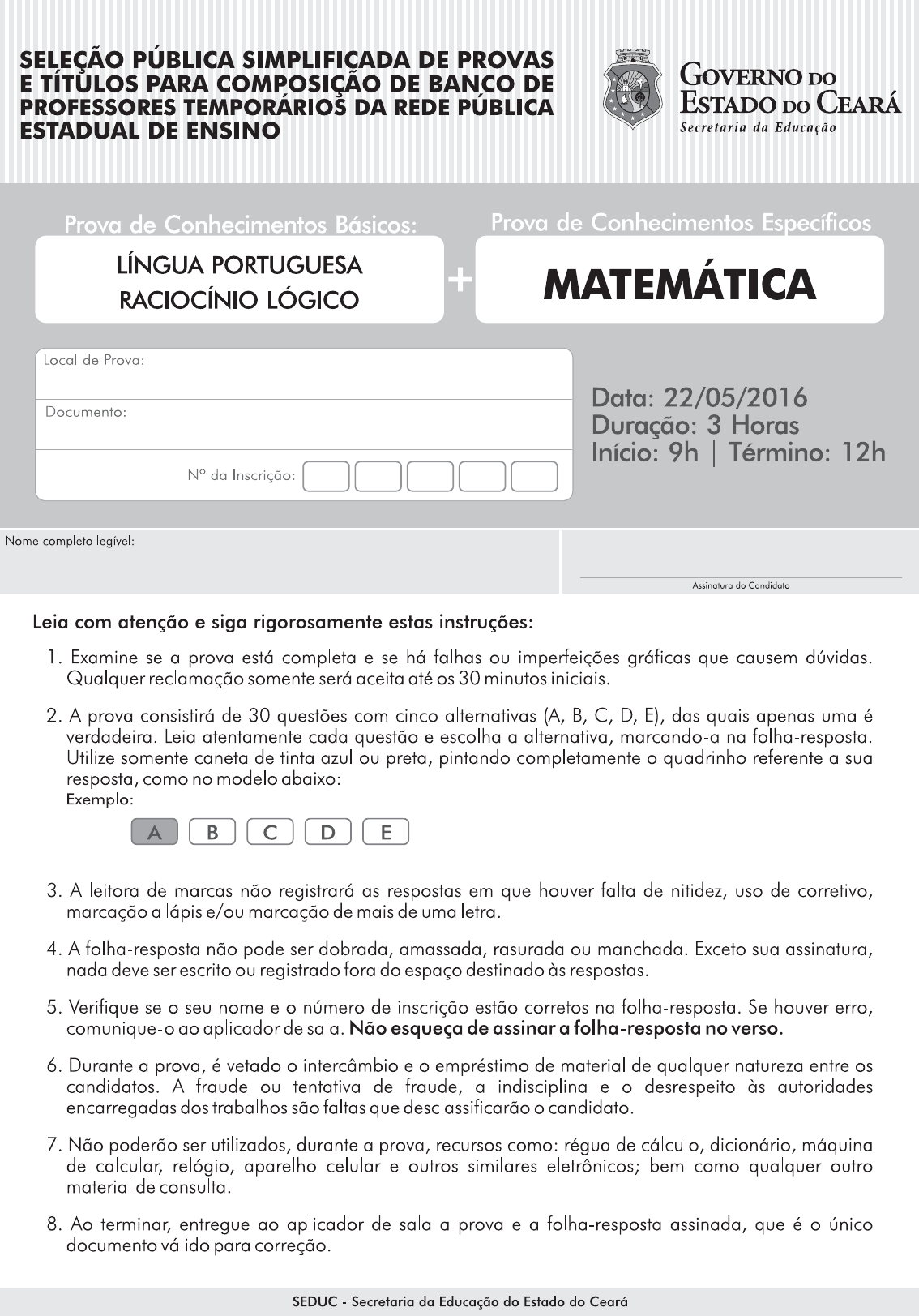 SEDUC / 1 Conhecimentos Básicos: LÍNGUA PORTUGUESA Leia o texto abaixo para responder às questões de 01 a 10. Normalmente, a noção de avaliação é reduzida à medição de competências e habilidades 1 que um estudante exibe ao final de um determinado período ou processo de aprendizagem. Vista 2 assim, a avaliação é uma forma de se verificar se o estudante aprendeu ou não o conteúdo 3 ensinado. Embora isso possa fazer parte do conceito de avaliação, ela é mais ampla e envolve 4 também outras esferas da sala de aula. 5 É sabido, por exemplo, que o professor procura respaldo na avaliação para exercer o 6 controle sobre o comportamento dos estudantes na sala de aula. Isso acontece porque a sala de 7 aula isolou-se tanto da vida real que os motivadores naturais da aprendizagem tiveram que ser 8 substituídos por motivadores artificiais, entre eles a nota. Assim, o estudante estuda apenas para 9 ter uma nota e não para ter suas possibilidades e leitura do mundo ampliadas. Isso, é claro, limita 10 os horizontes da formação do estudante e da própria avaliação. O poder de dar uma nota não 11 raramente é usado para induzir subordinação e controlar o comportamento do estudante em sala. 12 Além disso, nem sempre o professor avalia apenas o conhecimento que o estudante 13 adquiriu em um determinado processo de aprendizagem, mas também seus valores ou atitudes. 14 Dessa forma, ao conceituarmos a avaliação escolar, realizada nas salas de aula, devemos levar 15 em conta que são vários os aspectos incluídos nesta definição: o conhecimento aprendido pelo 16 estudante e seu desenvolvimento, o comportamento do estudante e seus valores e atitudes. 17 Alguns desses aspectos são avaliados formalmente (em provas, por exemplo), mas outros são 18 avaliados informalmente (nas conversas com os estudantes, no dia a dia da sala de aula). 19 Investigar, portanto, como está ocorrendo a avaliação em sua sala de aula – considerando os 20 aspectos formais e informais – pode ser um bom começo para aprimorar as práticas avaliativas 21 usadas. 22 Em decorrência desses aspectos informais, avaliamos muito mais do que pensamos 23 avaliar. Nas salas de aulas, estamos permanentemente emitindo juízos de valor sobre os 24 estudantes (frequentemente de forma pública). Esses juízos de valores vão conformando 25 imagens e representações entre professores e estudantes, entre estudantes e professores e 26 entre os próprios estudantes. Devemos ter em mente que, em nossa prática, não estamos 27 avaliando nossos estudantes e crianças, mas as aprendizagens que eles realizam. 28 Fonte: BEAUCHAMP, Jeanete; PAGEL, Sandra Denise; NASCIMENTO, Aricélia Ribeiro do. Indagações sobre currículo: currículo e avaliação. Brasília: Ministério da Educação, Secretaria de Educação Básica, 2007. p. 24. *Adaptado: Reforma Ortográfica. 01. Nesse texto, defende-se a tese de que a) a avaliação colabora para justificar o comportamento dos estudantes. b) a avaliação é mais ampla que a medição de competências e habilidades desenvolvidas. c) a escola cria juízos de valor que são disseminados pelos professores e estudantes. d) os professores devem considerar o conhecimento que o estudante adquiriu durante um período. e) os juízos de valor são um bom começo para a revisão das práticas adotadas pelos professores. SEDUC / 2 02. De acordo com esse texto, é necessário investigar como a avaliação escolar observa a) a atribuição de notas aos estudantes nas provas de aferição de conhecimentos. b) a construção de juízos de valor por parte dos discentes e educadores. c) as competências e habilidades desenvolvidas pelos estudantes. d) o desenvolvimento comportamental de cada estudante individualmente. e) os aspectos formais e informais envolvidos no processo de ensino e aprendizagem. 03. No trecho “...que um estudante exibe ao final de um determinado período...” (linha 2), a palavra em destaque refere-se a) a competências e habilidades. b) a determinado período. c) à noção de avaliação. d) a um estudante. e) ao processo de aprendizagem. 04. Sobre a acentuação gráfica de algumas palavras do texto, podemos afirmar corretamente: a) As palavras “competências”, “próprios” e “vários” não são acentuadas pela mesma regra. b) As palavras “substituídos”, “incluídos” e “juízos” obedecem à mesma regra de acentuação. c) As palavras “pública” e “prática” recebem acento por serem paroxítonas terminadas em a. d) As formas verbais “está” e “é” são acentuadas por obedecerem à mesma regra de acentuação. e) As palavras “além” e “também” são acentuadas, mas obedecem a regras diferentes. 05. Assim como avaliação e subordinação, grafam-se, corretamente com Ç, as palavras: a) aparição e submição. b) opreção e permição. c) pretenção e disperção. d) retenção e exceção. e) apreenção e compreenção. 06. O verbo induzir (linha12) significa a) distorcer. b) negar. c) seduzir. d) formular. e) impulsionar. 07. Do mesmo modo que ocorre o emprego da crase no trecho: “... a noção de avaliação é reduzida à medição de competências e habilidades”, está correto o emprego da crase em: a) Somos levados à avaliar nossos alunos rotineiramente. b) Ao elaborar uma prova, à nota não deve ser o principal juízo de valor. c) Na escola, à aprendizagem do aluno deve ser vista forma ampla. d) Devemos defender à formação coerente do estudante. e) Avaliamos bem à medida que interagimos com nossos alunos. SEDUC / 3 08. Na oração: “... o estudante estuda apenas para ter uma nota”, o termo grifado é a) adjetivo. b) advérbio. c) substantivo. d) preposição. e) pronome. 09. No trecho “... avaliamos muito mais do que pensamos avaliar.” (linhas 23-24), o verbo em destaque refere-se ao sujeito oculto determinado pelo pronome “Nós”. Nesse mesmo trecho, se o sujeito fosse substituído po