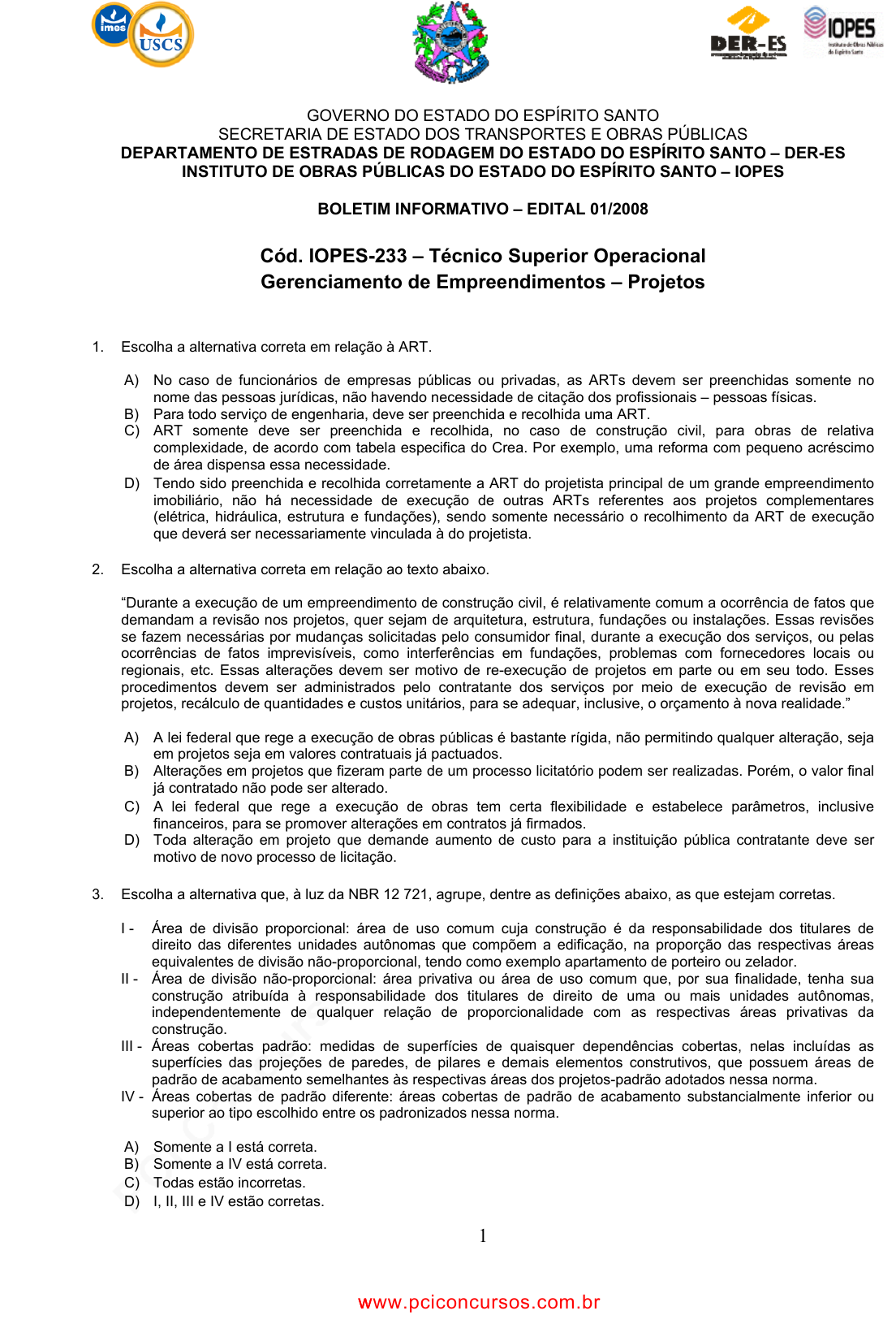 pcimarkpci MDAwMDowMDAwOjAwMDA6MDAwMDowMDAwOmZmZmY6MzZlOTpjMjU5:U2F0LCAxMSBTZXAgMjAyMSAyMzowMzoyOSAtMDMwMA== 1 GOVERNO DO ESTADO DO ESPÍRITO SANTO SECRETARIA DE ESTADO DOS TRANSPORTES E OBRAS PÚBLICAS DEPARTAMENTO DE ESTRADAS DE RODAGEM DO ESTADO DO ESPÍRITO SANTO – DER-ES INSTITUTO DE OBRAS PÚBLICAS DO ESTADO DO ESPÍRITO SANTO – IOPES BOLETIM INFORMATIVO – EDITAL 01/2008 Cód. IOPES-233 – Técnico Superior Operacional Gerenciamento de Empreendimentos – Projetos 1. Escolha a alternativa correta em relação à ART. A) No caso de funcionários de empresas públicas ou privadas, as ARTs devem ser preenchidas somente no nome das pessoas jurídicas, não havendo necessidade de citação dos profissionais – pessoas físicas. B) Para todo serviço de engenharia, deve ser preenchida e recolhida uma ART. C) ART somente deve ser preenchida e recolhida, no caso de construção civil, para obras de relativa complexidade, de acordo com tabela especifica do Crea. Por exemplo, uma reforma com pequeno acréscimo de área dispensa essa necessidade. D) Tendo sido preenchida e recolhida corretamente a ART do projetista principal de um grande empreendimento imobiliário, não há necessidade de execução de outras ARTs referentes aos projetos complementares (elétrica, hidráulica, estrutura e fundações), sendo somente necessário o recolhimento da ART de execução que deverá ser necessariamente vinculada à do projetista. 2. Escolha a alternativa correta em relação ao texto abaixo. “Durante a execução de um empreendimento de construção civil, é relativamente comum a ocorrência de fatos que demandam a revisão nos projetos, quer sejam de arquitetura, estrutura, fundações ou instalações. Essas revisões se fazem necessárias por mudanças solicitadas pelo consumidor final, durante a execução dos serviços, ou pelas ocorrências de fatos imprevisíveis, como interferências em fundações, problemas com fornecedores locais ou regionais, etc. Essas alterações devem ser motivo de re-execução de projetos em parte ou em seu todo. Esses procedimentos devem ser administrados pelo contratante dos serviços por meio de execução de revisão em projetos, recálculo de quantidades e custos unitários, para se adequar, inclusive, o orçamento à nova realidade.” A) A lei federal que rege a execução de obras públicas é bastante rígida, não permitindo qualquer alteração, seja em projetos seja em valores contratuais já pactuados. B) Alterações em projetos que fizeram parte de um processo licitatório podem ser realizadas. Porém, o valor final já contratado não pode ser alterado. C) A lei federal que rege a execução de obras tem certa flexibilidade e estabelece parâmetros, inclusive financeiros, para se promover alterações em contratos já firmados. D) Toda alteração em projeto que demande aumento de custo para a instituição pública contratante deve ser motivo de novo processo de licitação. 3. Escolha a alternativa que, à luz da NBR 12 721, agrupe, dentre as definições abaixo, as que estejam corretas. I - Área de divisão proporcional: área de uso comum cuja construção é da responsabilidade dos titulares de direito das diferentes unidades autônomas que compõem a edificação, na proporção das respectivas áreas equivalentes de divisão não-proporcional, tendo como exemplo apartamento de porteiro ou zelador. II - Área de divisão não-proporcional: área privativa ou área de uso comum que, por sua finalidade, tenha sua construção atribuída à responsabilidade dos titulares de direito de uma ou mais unidades autônomas, independentemente de qualquer relação de proporcionalidade com as respectivas áreas privativas da construção. III - Áreas cobertas padrão: medidas de superfícies de quaisquer dependências cobertas, nelas incluídas as superfícies das projeções de paredes, de pilares e demais elementos construtivos, que possuem áreas de padrão de acabamento semelhantes às respectivas áreas dos projetos-padrão adotados nessa norma. IV - Áreas cobertas de padrão diferente: áreas cobertas de padrão de acabamento substancialmente inferior ou superior ao tipo escolhido entre os padronizados nessa norma. A) Somente a I está correta. B) Somente a IV está correta. C) Todas estão incorretas. D) I, II, III e IV estão corretas. www.pciconcursos.com.br www.pciconcursos.com.br pcimarkpci MDAwMDowMDAwOjAwMDA6MDAwMDowMDAwOmZmZmY6MzZlOTpjMjU5:U2F0LCAxMSBTZXAgMjAyMSAyMzowMzoyOSAtMDMwMA== 2 4. Analise as afirmações abaixo e escolha a alternativa que contenha todas as corretas. As instalações sanitárias, em canteiros de obra, devem: I. ser mantidas em perfeito estado de conservação e higiene; II. ter portas de acesso que impeçam o devassamento, e ser construídas de modo a manter o resguardo conveniente; III. ter paredes de material resistente e lavável, podendo ser de madeira; IV. ter pisos impermeáveis, laváveis e de acabamento antiderrapante; V. não se ligar diretamente com os locais destinados às refeições; VI. ser independente para homens e mulheres, quando necessário; VII. ter ventilação e iluminação adequadas; VIII. ter instalações elétricas adequadamente protegidas; IX. estar situadas em locais de fácil e seguro acesso, não sendo permitido deslocamento superior a 150 (cento e cinqüenta) metros do posto de trabalho aos gabinetes sanitários, mictórios e lavatórios. A) I, II, III, IV, V, VI, VII, VIII e IX. B) I, II, IV, V, VI, VII, VIII e IX. C) I, II, III, IV, V, VI, VII e IX. D) I, II, IV, V, VI, VII e IX. 5. O projeto de fundações depende da definição das cargas atuantes e do tipo de solo onde se edificará a construção. O cálculo das cargas nos pilares é de responsabilidade do profissional que realizará o projeto das estruturas. A capacidade de suporte do solo pode ser estimada por meio da realização de um ensaio. Analise as afirmativas abaixo e assinale a alternativa que contenha as 