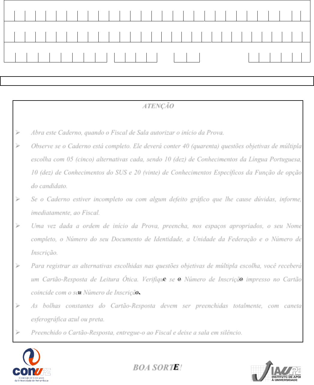 SECRETARIA DE ADMINISTRAÇÃO DO ESTADO DE PERNAMBUCO UNIVERSIDADE DE PERNAMBUCO – UPE PRONTO SOCORRO CARDIOLÓGICO DE PERNAMBUCO - PROCAPE SELEÇÃO PÚBLICA SIMPLIFICADA DADOS DE IDENTIFICAÇÃO DO CANDIDATO Não deixe de preencher as informações a seguir: Prédio Sala Nome Nº de Identidade Órgão Expedidor UF Nº de Inscrição TÉCNICO DE LABORATÓRIO ATENÇÃO Abra este Caderno, quando o Fiscal de Sala autorizar o início da Prova. Observe se o Caderno está completo. Ele deverá conter 40 (quarenta) questões objetivas de múltipla escolha com 05 (cinco) alternativas cada, sendo 10 (dez) de Conhecimentos da Língua Portuguesa, 10 (dez) de Conhecimentos do SUS e 20 (vinte) de Conhecimentos Específicos da Função de opção do candidato. Se o Caderno estiver incompleto ou com algum defeito gráfico que lhe cause dúvidas, informe, imediatamente, ao Fiscal. Uma vez dada a ordem de início da Prova, preencha, nos espaços apropriados, o seu Nome completo, o Número do seu Documento de Identidade, a Unidade da Federação e o Número de Inscrição. Para registrar as alternativas escolhidas nas questões objetivas de múltipla escolha, você receberá um Cartão-Resposta de Leitura Ótica. Verifique se o Número de Inscrição impresso no Cartão coincide com o seu Número de Inscrição. As bolhas constantes do Cartão-Resposta devem ser preenchidas totalmente, com caneta esferográfica azul ou preta. Preenchido o Cartão-Resposta, entregue-o ao Fiscal e deixe a sala em silêncio. BOA SORTE! www.pciconcursos.com.br 2 CONHECIMENTOS DA LÍNGUA PORTUGUESA Texto 1 (questões 01 a 03) 01. Analisando-se a charge, é CORRETO afirmar que A) a flecha continua sendo o meio de se chegar aos corações. B) os anjos possuem corações que resistem ao amor. C) as pessoas permanecem de corações abertos como outrora. D) se percebe uma mudança no comportamento das pessoas. E) o coração é inquebrável como a pedra. 02. Ao se ler a charge, percebe-se, no 2º balão, a palavra “duros” que está empregada em sentido figurado. Com que Figura de Linguagem o autor trabalhou? A) Metáfora B) Metonímia C) Eufemismo D) Antítese E) Hipérbole 03. Ainda analisando a charge, leia as afirmativas abaixo e coloque V nas Verdadeiras e F nas Falsas. ( ) A palavra “das” liga as palavras “corações” e “pessoas”, com valor semântico de posse. ( ) A palavra “duros” se refere a “corações”, atribuindo-lhe uma característica e com ele concordando em número e gênero. ( ) A palavra “demais” acompanha o adjetivo “duros”, modificando-o, com valor semântico de intensidade. Assinale a alternativa que contém a sequência CORRETA. A) F- F- V B) F- V- V C) V- V- V D) F- F- F E) V- F- F Texto 2 (questões 04 e 05) 04. Após a leitura da tira, A) observa-se que o respeito é praticado por todos os seus personagens. B) a passividade é algo existente em todos os personagens. C) todos os personagens apresentam perfis de agressividade. D) um dos personagens apresenta domínio sobre si mesmo. E) dois dos personagens são adeptos da conduta harmoniosa. www.pciconcursos.com.br 3 05. Analisando-se o texto, percebem-se alguns termos acentuados. Sobre a acentuação gráfica, analise os itens a seguir: I. O termo “você” recebe acento por ser um oxítono terminado em E, seguindo a mesma regra gramatical do termo mês. II. O termo “você” é acentuado porque é um monossílabo tônico terminado em E. III. Os termos “otário” e “remédio” são acentuados pela mesma razão: paroxítonos terminados em ditongo. Está CORRETO o que se afirma em A) I. B) II. C) III. D) II e III. E) I e II. Texto 3 (questões 06 e 07) 06. Por meio dessa imagem, o autor A) critica a verdade, ressalvando que a dor é sua única consequência. B) faz referência à dor como resultado da verdade, algo praticado por todos os homens nos dias atuais. C) corrobora a ideia de que a verdade dói e é por meio dela que se chega ao fundo do poço. D) revela que, apesar de provocar dores, a verdade conduz à liberdade. E) apresenta a seringa como algo que cura. 07. Ao se ler a imagem, é CORRETO afirmar que A) a palavra “mas” liga orações estabelecendo entre elas uma relação de conclusão. B) a vírgula separa as orações assindéticas. C) o termo “dói” é acentuado por ser um monossílabo tônico terminado em ditongo aberto. D) o elemento coesivo “mas” pode ser substituído por “logo”, uma vez que seu valor semântico é de contraste. E) a vírgula poderia ser omitida. Texto 4 (questões de 08 a 10) Ética, Compromisso e Honestidade Frei Nilo Agostini Não bastam palavras, é preciso vivê-las. Não basta fé, é preciso praticá-la. Ética é para ser vivida, não é enfeite! Urge sermos responsáveis, aliando compromisso e honestidade. Isto requer respeito das pessoas, coerência nas relações, transparência em tudo o que fazemos. A ética identifica direitos, sem fugir dos deveres; desmascara os ídolos e seus fetiches; combate a corrupção; enxerga as pessoas no face a face e defende a vida. A ética aponta sempre para o valor da dignidade humana, valorizando o ser humano em todas as suas dimensões, por inteiro; leva-nos a proteger o fraco e a promover os pobres, numa inclusão de todos no banquete da vida. Disponível em: http://falandocomasestrelas.blogspot.com.br/2012/12/etica-compromisso-e-honestidade.html 08. Na expressão “face a face”, não existe a crase porque é constituída de palavras repetitivas. Em qual das alternativas abaixo o acento indicador da crase também não deve ser utilizado? A) Não sejamos insensíveis à dor alheia. B) Tudo vale à pena quando se tem a ética como prática cotidiana. C) Chegamos à escola para ouvir a palestra sobre ética. D) A vida à qual aspiro é baseada na ética e na honestidade. E) Pedi informações à secretária sobre ética, honestidade e compromisso. www.pciconcursos.com.br http://falandocomasestrelas.blogspot.com.br/201