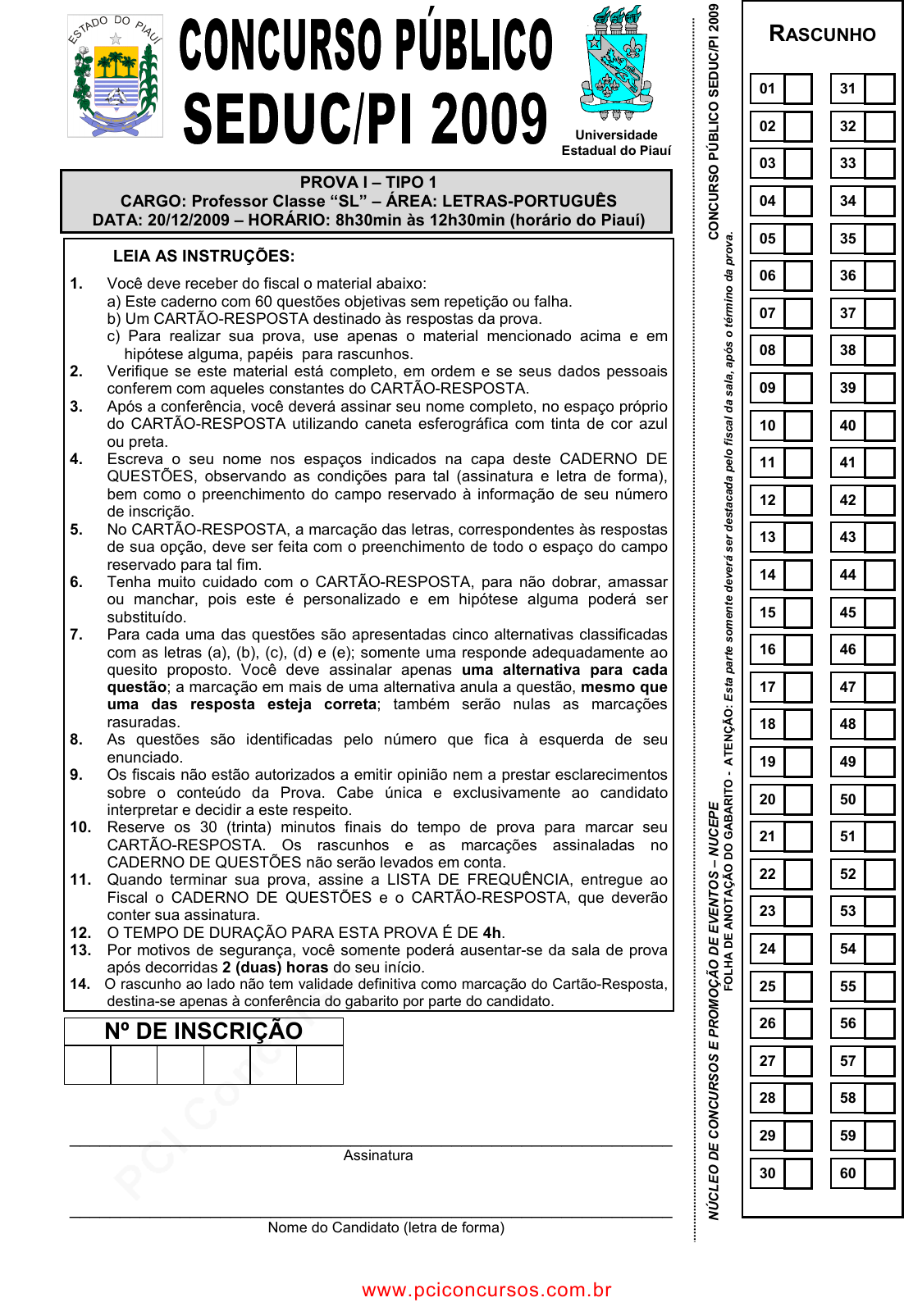 pcimarkpci MDAwMDowMDAwOjAwMDA6MDAwMDowMDAwOmZmZmY6MzZlOTpjMjU5:U3VuLCAxMiBTZXAgMjAyMSAwODo0MDozOSAtMDMwMA== PROVA I – TIPO 1 CARGO: Professor Classe “SL” – ÁREA: LETRAS-PORTUGU ÊS DATA: 20/12/2009 – HORÁRIO: 8h30min às 12h30min (ho rário do Piauí) LEIA AS INSTRUÇÕES: 1. Você deve receber do fiscal o material abaixo: a) Este caderno com 60 questões objetivas sem repetição ou falha. b) Um CARTÃO-RESPOSTA destinado às respostas da prova. c) Para realizar sua prova, use apenas o material mencionado acima e em hipótese alguma, papéis para rascunhos. 2. Verifique se este material está completo, em ordem e se seus dados pessoais conferem com aqueles constantes do CARTÃO-RESPOSTA. 3. Após a conferência, você deverá assinar seu nome completo, no espaço próprio do CARTÃO-RESPOSTA utilizando caneta esferográfica com tinta de cor azul ou preta. 4. Escreva o seu nome nos espaços indicados na capa deste CADERNO DE QUESTÕES, observando as condições para tal (assinatura e letra de forma), bem como o preenchimento do campo reservado à informação de seu número de inscrição. 5. No CARTÃO-RESPOSTA, a marcação das letras, correspondentes às respostas de sua opção, deve ser feita com o preenchimento de todo o espaço do campo reservado para tal fim. 6. Tenha muito cuidado com o CARTÃO-RESPOSTA, para não dobrar, amassar ou manchar, pois este é personalizado e em hipótese alguma poderá ser substituído. 7. Para cada uma das questões são apresentadas cinco alternativas classificadas com as letras (a), (b), (c), (d) e (e); somente uma responde adequadamente ao quesito proposto. Você deve assinalar apenas uma alternativa para cada questão ; a marcação em mais de uma alternativa anula a questão, mesmo que uma das resposta esteja correta ; também serão nulas as marcações rasuradas. 8. As questões são identificadas pelo número que fica à esquerda de seu enunciado. 9. Os fiscais não estão autorizados a emitir opinião nem a prestar esclarecimentos sobre o conteúdo da Prova. Cabe única e exclusivamente ao candidato interpretar e decidir a este respeito. 10. Reserve os 30 (trinta) minutos finais do tempo de prova para marcar seu CARTÃO-RESPOSTA. Os rascunhos e as marcações assinaladas no CADERNO DE QUESTÕES não serão levados em conta. 11. Quando terminar sua prova, assine a LISTA DE FREQUÊNCIA, entregue ao Fiscal o CADERNO DE QUESTÕES e o CARTÃO-RESPOSTA, que deverão conter sua assinatura. 12. O TEMPO DE DURAÇÃO PARA ESTA PROVA É DE 4h. 13. Por motivos de segurança, você somente poderá ausentar-se da sala de prova após decorridas 2 (duas) horas do seu início. 14. O rascunho ao lado não tem validade definitiva como marcação do Cartão-Resposta, destina-se apenas à conferência do gabarito por parte do candidato. Nº DE INSCRIÇÃO ____________________________________________________________ Assinatura ____________________________________________________________ Nome do Candidato (letra de forma) Universidade Estadual do Piauí RASCUNHO 01 31 02 32 03 33 04 34 05 35 06 36 07 37 08 38 09 39 10 40 11 41 12 42 13 43 14 44 15 45 16 46 17 47 18 48 19 49 20 50 21 51 22 52 23 53 24 54 25 55 26 56 27 57 28 58 29 59 30 60 N Ú C LE O D E C O N C U R S O S E P R O M O Ç Ã O D E E V E N T O S – N U C E P E C O N C U R S O P Ú B LI C O S E D U C /P I 2 00 9 F O LH A D E A N O T A Ç Ã O D O G A B A R IT O - A T E N Ç Ã O : E st a pa rt e so m en te d ev er á se r de st ac ad a pe lo fi sc al d a sa la , a pó s o té rm in o da p ro va . www.pciconcursos.com.br pcimarkpci MDAwMDowMDAwOjAwMDA6MDAwMDowMDAwOmZmZmY6MzZlOTpjMjU5:U3VuLCAxMiBTZXAgMjAyMSAwODo0MDozOSAtMDMwMA== Concurso Público SEDUC/PI 2009 2 N º D E I N S C R I Ç Ã O www.pciconcursos.com.br pcimarkpci MDAwMDowMDAwOjAwMDA6MDAwMDowMDAwOmZmZmY6MzZlOTpjMjU5:U3VuLCAxMiBTZXAgMjAyMSAwODo0MDozOSAtMDMwMA== Concurso Público SEDUC/PI 2009 3 QUESTÕES DE DIDÁTICA 01. A Didática constitui disciplina essencial nos processos de formação de professores, notadamente articulando o saber, o saber-ser e o saber-fazer. No contexto dessa análise, pode-se afirmar CORRETAMENTE, acerca da concepção tradicional de Didática que: a) refere-se a um conjunto de procedimentos universais relativos à docência; b) afirma a neutralidade científica do método, a preocupação com os meios desvinculados dos fins e do contexto; c) caracteriza-se por transcender métodos e técnicas de ensino, buscando articular escola/sociedade; d) compreende uma doutrina da instrução, revelando-se como um conjunto de normas prescritivas centradas no método; e) caracteriza-se por estabelecer métodos e técnicas de educação desvinculados dos princípios educacionais. 02. O processo de seleção dos conteúdos deve ocorrer de forma sistemática e criteriosa, contribuindo para que as experiências de ensino/aprendizagem sejam significativas. A partir dessa concepção, pode-se afirmar CORRETAMENTE, que se constituem em critérios de seleção de conteúdos de ensino, EXCETO: a) flexibilidade; b) utilidade; c) significação; d) afetividade; e) solidariedade. 03. A avaliação é inerente ao trabalho docente, devendo caracterizar-se como atividade didática contínua, fornecendo subsídios para o acompanhamento do processo ensino-aprendizagem. Nesta acepção, pode- se identificar, CORRETAMENTE, como características da avaliação: I – reflete a unidade objetivos/conteúdos/métodos; II – fornece subsídios para a revisão do plano de ensino; III – constata desempenhos através de testes objetivos; IV – possibilita a autopercepção do professor acerca de sua prática. A respeito das afirmações constantes dos itens I a IV, a alternativa CORRETA é: a) Apenas as afirmações constantes dos itens I, II e III estão corretas. b) Apenas as afirmações constantes dos itens I, III e IV estão corretas. c) Apenas as afirmações constantes dos itens II, III e IV estão corretas. d) Apenas as afirmaç