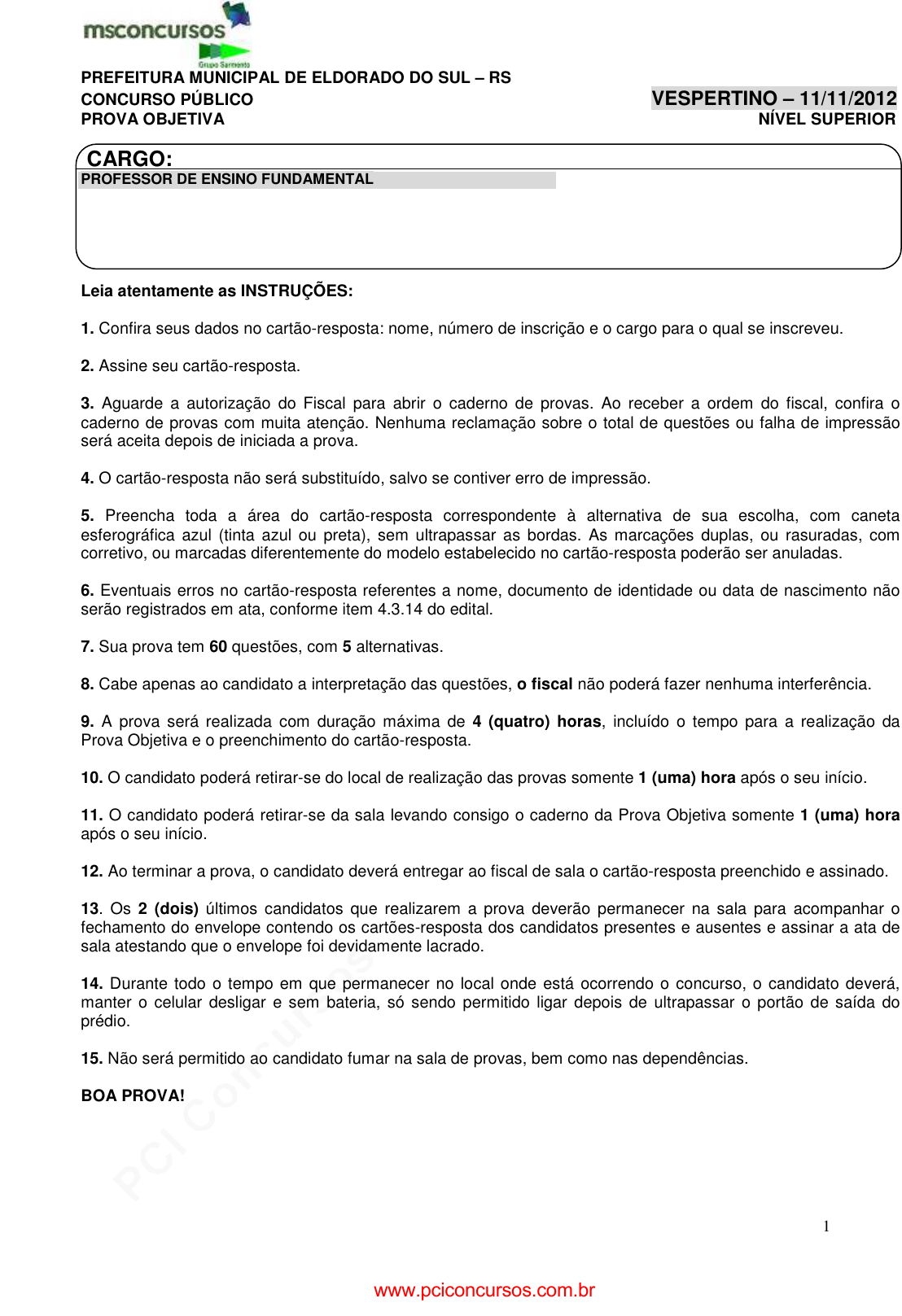 pcimarkpci MDAwMDowMDAwOjAwMDA6MDAwMDowMDAwOmZmZmY6MzZlOTpjMjU5:U3VuLCAxMiBTZXAgMjAyMSAwOTo1NTowMCAtMDMwMA== 1 PREFEITURA MUNICIPAL DE ELDORADO DO SUL – RS CONCURSO PÚBLICO VESPERTINO – 11/11/2012 PROVA OBJETIVA NÍVEL SUPERIOR CARGO:MATUTINO – 18/03/ PROFESSOR DE ENSINO FUNDAMENTAL Leia atentamente as INSTRUÇÕES: 1. Confira seus dados no cartão-resposta: nome, número de inscrição e o cargo para o qual se inscreveu. 2. Assine seu cartão-resposta. 3. Aguarde a autorização do Fiscal para abrir o caderno de provas. Ao receber a ordem do fiscal, confira o caderno de provas com muita atenção. Nenhuma reclamação sobre o total de questões ou falha de impressão será aceita depois de iniciada a prova. 4. O cartão-resposta não será substituído, salvo se contiver erro de impressão. 5. Preencha toda a área do cartão-resposta correspondente à alternativa de sua escolha, com caneta esferográfica azul (tinta azul ou preta), sem ultrapassar as bordas. As marcações duplas, ou rasuradas, com corretivo, ou marcadas diferentemente do modelo estabelecido no cartão-resposta poderão ser anuladas. 6. Eventuais erros no cartão-resposta referentes a nome, documento de identidade ou data de nascimento não serão registrados em ata, conforme item 4.3.14 do edital. 7. Sua prova tem 60 questões, com 5 alternativas. 8. Cabe apenas ao candidato a interpretação das questões, o fiscal não poderá fazer nenhuma interferência. 9. A prova será realizada com duração máxima de 4 (quatro) horas, incluído o tempo para a realização da Prova Objetiva e o preenchimento do cartão-resposta. 10. O candidato poderá retirar-se do local de realização das provas somente 1 (uma) hora após o seu início. 11. O candidato poderá retirar-se da sala levando consigo o caderno da Prova Objetiva somente 1 (uma) hora após o seu início. 12. Ao terminar a prova, o candidato deverá entregar ao fiscal de sala o cartão-resposta preenchido e assinado. 13. Os 2 (dois) últimos candidatos que realizarem a prova deverão permanecer na sala para acompanhar o fechamento do envelope contendo os cartões-resposta dos candidatos presentes e ausentes e assinar a ata de sala atestando que o envelope foi devidamente lacrado. 14. Durante todo o tempo em que permanecer no local onde está ocorrendo o concurso, o candidato deverá, manter o celular desligar e sem bateria, só sendo permitido ligar depois de ultrapassar o portão de saída do prédio. 15. Não será permitido ao candidato fumar na sala de provas, bem como nas dependências. BOA PROVA! www.pciconcursos.com.br pcimarkpci MDAwMDowMDAwOjAwMDA6MDAwMDowMDAwOmZmZmY6MzZlOTpjMjU5:U3VuLCAxMiBTZXAgMjAyMSAwOTo1NTowMCAtMDMwMA== 2 PROVA OBJETIVA – PROFESSOR DE ENSINO FUNDAMENTAL LÍNGUA PORTUGUESA Leia o texto, a seguir, para responder às quatro (4) próximas questões: Simplicidade Luís Fernando Veríssimo Cada semana uma novidade. A última foi que pizza previne câncer do esôfago. Acho a maior graça. Tomate previne isso, cebola previne aquilo, chocolate faz bem, chocolate faz mal, um cálice diário de vinho não tem problema, qualquer gole de álcool é nocivo, tome água em abundância, mas, peraí, não exagere... Diante dessa profusão de descobertas acho mais seguro não mudar de hábitos. Sei direitinho o que faz bem e o que faz mal prá minha saúde. Prazer faz muito bem. Dormir me deixa 0 km. Ler um bom livro me faz sentir novo em folha. Viajar me deixa tenso antes de embarcar, mas, depois, rejuvenesço uns cinco anos. Viagens aéreas não me incham as pernas; incham-me o cérebro: volto cheio de idéias... Brigar me provoca arritmia cardíaca. Ver pessoas tendo acessos de estupidez me embrulha o estômago. Testemunhar gente jogando lata de cerveja pela janela do carro me faz perder toda fé no ser humano... E telejornais? Os médicos deveriam proibir... como doem! Caminhar faz bem, namorar faz bem, dançar faz bem, ficar em silêncio quando uma discussão está pegando fogo faz muito bem: você exercita o autocontrole e ainda acorda no outro dia sem se sentir arrependido de nada. Acordar de manhã arrependido do que disse ou do que fez ontem à noite, isso sim, é prejudicial à saúde. E passar o resto do dia sem coragem para pedir desculpas, pior ainda. Não pedir perdão pelas nossas mancadas dá câncer. Guardar mágoas, ser pessimista, preconceituoso ou falso moralista, não há tomate ou pizza que previna. Ir ao cinema, conseguir um lugar central nas fileiras do fundo, não ter ninguém atrapalhando sua visão, nenhum celular tocando e o filme ser espetacular, uau! Cinema é melhor para a saúde do que pipoca. Conversa é melhor do que piada. Exercício é melhor do que cirurgia. Humor é melhor do que rancor. Amigos são melhores do que gente influente. Economia é melhor do que dívida. Pergunta é melhor do que dúvida. Sonhar é o melhor de tudo e muito melhor do que nada! http://www.quemtemsedevenha.com.br/simplicidade.htm 1. Avaliando alguns aspectos sobre o texto Simplicidade, observa-se que ele a) é do tipo injuntivo, pela utilização da sequência verbal e pela objetividade com que o assunto é apresentado ao leitor. b) é do tipo explicativo/expositivo, o que se pode perceber pelo afastamento do autor em relação àquilo que transmite. c) se dá prioridade à linguagem formal, com pequenos desvios para a linguagem informal limitados às expressões “prá” e “uau”. d) trata-se de uma crônica, pois baseia-se em acontecimentos do cotidiano, com leve toque de humor e sem a necessidade de aprofundamento da leitura. e) predomina a função de linguagem conativa ou apelativa, o que se pode notar pelas formas verbais no infinitivo. 2. O texto foi pensado em torno de propostas de alimentação visando à saúde. Ao efetuar uma leitura cuidadosa dele, pode-se concluir que a) o autor se esquiva de seguir as dietas saudáveis aconselhadas porque alega ter conhecimento do que é recomendável para a sua saúde. b) para uma