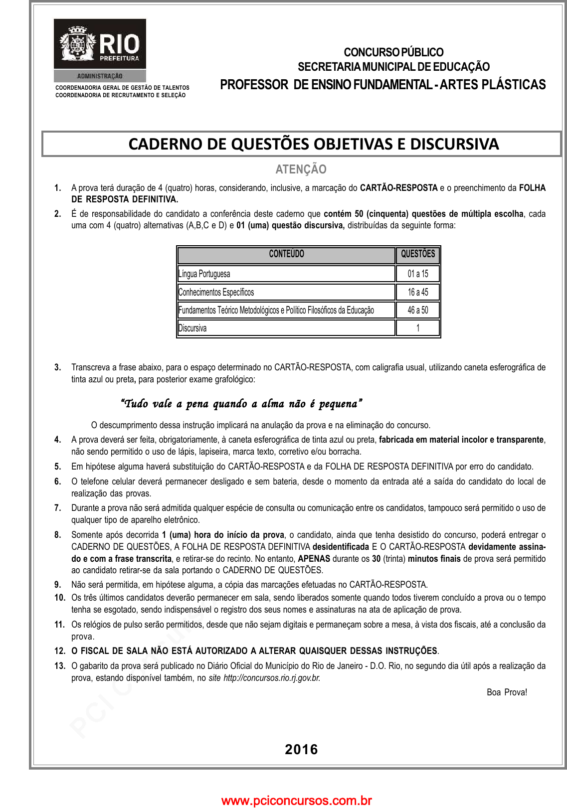 pcimarkpci MDAwMDowMDAwOjAwMDA6MDAwMDowMDAwOmZmZmY6MzZlOTpjMjU5:U3VuLCAxMiBTZXAgMjAyMSAxNDoyNDo1OSAtMDMwMA== 1. A prova terá duração de 4 (quatro) horas, considerando, inclusive, a marcação do CARTÃO-RESPOSTA e o preenchimento da FOLHA DE RESPOSTA DEFINITIVA. 2. É de responsabilidade do candidato a conferência deste caderno que contém 50 (cinquenta) questões de múltipla escolha, cada uma com 4 (quatro) alternativas (A,B,C e D) e 01 (uma) questão discursiva, distribuídas da seguinte forma: �������� � � ��� �������� ����� � ������� � ��������� �� ������� ������� ��������� ���� �� ���� � ���� ���� ���� ��� ���� ���������!" ������� #� �� �$� � 3. Transcreva a frase abaixo, para o espaço determinado no CARTÃO-RESPOSTA, com caligrafia usual, utilizando caneta esferográfica de tinta azul ou preta, para posterior exame grafológico: “Tudo vale a pena quando a alma não é pequena”“Tudo vale a pena quando a alma não é pequena”“Tudo vale a pena quando a alma não é pequena”“Tudo vale a pena quando a alma não é pequena”“Tudo vale a pena quando a alma não é pequena” O descumprimento dessa instrução implicará na anulação da prova e na eliminação do concurso. 4. A prova deverá ser feita, obrigatoriamente, à caneta esferográfica de tinta azul ou preta, fabricada em material incolor e transparente, não sendo permitido o uso de lápis, lapiseira, marca texto, corretivo e/ou borracha. 5. Em hipótese alguma haverá substituição do CARTÃO-RESPOSTA e da FOLHA DE RESPOSTA DEFINITIVA por erro do candidato. 6. O telefone celular deverá permanecer desligado e sem bateria, desde o momento da entrada até a saída do candidato do local de realização das provas. 7. Durante a prova não será admitida qualquer espécie de consulta ou comunicação entre os candidatos, tampouco será permitido o uso de qualquer tipo de aparelho eletrônico. 8. Somente após decorrida 1 (uma) hora do início da prova, o candidato, ainda que tenha desistido do concurso, poderá entregar o CADERNO DE QUESTÕES, A FOLHA DE RESPOSTA DEFINITIVA desidentificada E O CARTÃO-RESPOSTA devidamente assina- do e com a frase transcrita, e retirar-se do recinto. No entanto, APENAS durante os 30 (trinta) minutos finais de prova será permitido ao candidato retirar-se da sala portando o CADERNO DE QUESTÕES. 9. Não será permitida, em hipótese alguma, a cópia das marcações efetuadas no CARTÃO-RESPOSTA. 10. Os três últimos candidatos deverão permanecer em sala, sendo liberados somente quando todos tiverem concluído a prova ou o tempo tenha se esgotado, sendo indispensável o registro dos seus nomes e assinaturas na ata de aplicação de prova. 11. Os relógios de pulso serão permitidos, desde que não sejam digitais e permaneçam sobre a mesa, à vista dos fiscais, até a conclusão da prova. 12. O FISCAL DE SALA NÃO ESTÁ AUTORIZADO A ALTERAR QUAISQUER DESSAS INSTRUÇÕES. 13. O gabarito da prova será publicado no Diário Oficial do Município do Rio de Janeiro - D.O. Rio, no segundo dia útil após a realização da prova, estando disponível também, no site http://concursos.rio.rj.gov.br. Boa Prova! PROFESSOR DE ENSINO FUNDAMENTAL - ARTES PLÁSTICAS 2016 ATENÇÃO COORDENADORIA GERAL DE GESTÃO DE TALENTOS COORDENADORIA DE RECRUTAMENTO E SELEÇÃO CONCURSO PÚBLICO SECRETARIA MUNICIPAL DE EDUCAÇÃO CADERNO DE QUESTÕES OBJETIVAS E DISCURSIVA www.pciconcursos.com.br pcimarkpci MDAwMDowMDAwOjAwMDA6MDAwMDowMDAwOmZmZmY6MzZlOTpjMjU5:U3VuLCAxMiBTZXAgMjAyMSAxNDoyNDo1OSAtMDMwMA== Concurso Público Secretaria Municipal de Educação Secretaria Municipal de Administração Coordenadoria Geral de Gestão de Talentos - CGGT 2 2016 PROFESSOR DE ENSINO FUNDAMENTAL ARTES PLÁSTICAS LÍNGUA PORTUGUESA Texto: Patíbulos virtuais Ainda não tinha doze anos quando assisti a um linchamento. Vi um rapaz a fugir de bicicleta. Um homem começou a persegui-lo, a pé, e de repente já eram cinco, dez, uma turba exaltada, correndo, gritando, jogando pedras. Lembro-me de estar inteiro, de coração, numa angústia enorme, com o rapaz que fugia. Não havia nada que pudesse fazer para o ajudar. Minutos antes eu lia, ao sol, numa varanda. Logo a seguir o rapaz pedalava para salvar a vida, lá embaixo, entre uma estradinha de terra vermelha e um vasto des- campado coberto de capim. Desde então estou sempre do lado de quem, sozinho, se vê perseguido por uma multidão. Pouco me importa o que fez o rapaz que corre; o homem que ergue a mão para se proteger da panca- da; a mulher que enfrenta, chorando, os insultos de um bando de predadores cobardes. O surgimento das redes sociais marcou a emergência de um novo patíbulo para os linchadores. Bem sei que a comparação será sempre abusiva. Palavras, por muito aguçadas, por muito duras e pesadas, não racham cabeças. Palavras, por muito venenosas, não são capazes de matar. Em contrapartida, este novo palco tem o poder de juntar em poucos minutos largos milhares de pessoas, todas aos gritos. A estupidez das multidões virtuais é tão concreta quanto a das multidões reais. Praticamente todas as semanas há alguma figura pública a sofrer perseguição nas redes sociais. [...] Há alguns anos, em Luanda, afirmei, durante uma entrevista, não entender por que o governo insistia em promover a poesia de Agostinho Neto, primeiro presidente angolano, que a mim sempre me pareceu bastante medíocre. Um conhecido jurista e comentador político, João Pinto, deputado do partido no poder, assinou um artigo defendendo a minha prisão. Foi além: defendeu o restabelecimento da pena de morte e o meu fuzilamento. Segundo ele, eu ofendera não apenas um antigo presidente e herói nacional mas também uma divindade, visto que Agost