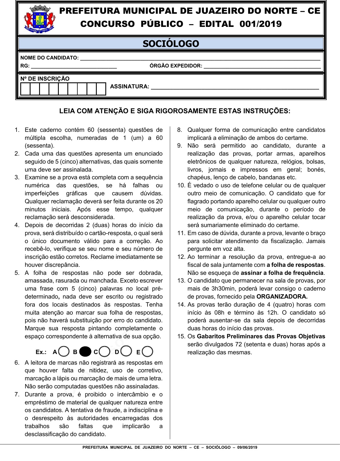 pcimarkpci MDAwMDowMDAwOjAwMDA6MDAwMDowMDAwOmZmZmY6MzZlOTpjMjU5:RnJpLCAxMCBTZXAgMjAyMSAyMzoxMzo1NiAtMDMwMA== PREFEITURA MUNICIPAL DE JUAZEIRO DO NORTE – CE – SOCIÓLOGO – 09/06/2019 PREFEITURA MUNICIPAL DE JUAZEIRO DO NORTE – CE CONCURSO PÚBLICO – EDITAL 001/2019 SOCIÓLOGO NOME DO CANDIDATO: ____________________________________________________________________________________ RG: ______________________________ ÓRGÃO EXPEDIDOR: _________________________________________ Nº DE INSCRIÇÃO ASSINATURA: _____________________________________________________ LEIA COM ATENÇÃO E SIGA RIGOROSAMENTE ESTAS INSTRUÇÕES: 1. Este caderno contém 60 (sessenta) questões de múltipla escolha, numeradas de 1 (um) a 60 (sessenta). 2. Cada uma das questões apresenta um enunciado seguido de 5 (cinco) alternativas, das quais somente uma deve ser assinalada. 3. Examine se a prova está completa com a sequência numérica das questões, se há falhas ou imperfeições gráficas que causem dúvidas. Qualquer reclamação deverá ser feita durante os 20 minutos iniciais. Após esse tempo, qualquer reclamação será desconsiderada. 4. Depois de decorridas 2 (duas) horas do início da prova, será distribuído o cartão-resposta, o qual será o único documento válido para a correção. Ao recebê-lo, verifique se seu nome e seu número de inscrição estão corretos. Reclame imediatamente se houver discrepância. 5. A folha de respostas não pode ser dobrada, amassada, rasurada ou manchada. Exceto escrever uma frase com 5 (cinco) palavras no local pré- determinado, nada deve ser escrito ou registrado fora dos locais destinados às respostas. Tenha muita atenção ao marcar sua folha de respostas, pois não haverá substituição por erro do candidato. Marque sua resposta pintando completamente o espaço correspondente à alternativa de sua opção. Ex.: A B C D E 6. A leitora de marcas não registrará as respostas em que houver falta de nitidez, uso de corretivo, marcação a lápis ou marcação de mais de uma letra. Não serão computadas questões não assinaladas. 7. Durante a prova, é proibido o intercâmbio e o empréstimo de material de qualquer natureza entre os candidatos. A tentativa de fraude, a indisciplina e o desrespeito às autoridades encarregadas dos trabalhos são faltas que implicarão a desclassificação do candidato. 8. Qualquer forma de comunicação entre candidatos implicará a eliminação de ambos do certame. 9. Não será permitido ao candidato, durante a realização das provas, portar armas, aparelhos eletrônicos de qualquer natureza, relógios, bolsas, livros, jornais e impressos em geral; bonés, chapéus, lenço de cabelo, bandanas etc. 10. É vedado o uso de telefone celular ou de qualquer outro meio de comunicação. O candidato que for flagrado portando aparelho celular ou qualquer outro meio de comunicação, durante o período de realização da prova, e/ou o aparelho celular tocar será sumariamente eliminado do certame. 11. Em caso de dúvida, durante a prova, levante o braço para solicitar atendimento da fiscalização. Jamais pergunte em voz alta. 12. Ao terminar a resolução da prova, entregue-a ao fiscal de sala juntamente com a folha de respostas. Não se esqueça de assinar a folha de frequência. 13. O candidato que permanecer na sala de provas, por mais de 3h30min, poderá levar consigo o caderno de provas, fornecido pela ORGANIZADORA. 14. As provas terão duração de 4 (quatro) horas com início às 08h e término às 12h. O candidato só poderá ausentar-se da sala depois de decorridas duas horas do início das provas. 15. Os Gabaritos Preliminares das Provas Objetivas serão divulgados 72 (setenta e duas) horas após a realização das mesmas. pcimarkpci MDAwMDowMDAwOjAwMDA6MDAwMDowMDAwOmZmZmY6MzZlOTpjMjU5:RnJpLCAxMCBTZXAgMjAyMSAyMzoxMzo1NiAtMDMwMA== 2 PREFEITURA MUNICIPAL DE JUAZEIRO DO NORTE – CE – SOCIÓLOGO – 09/06/2019 pcimarkpci MDAwMDowMDAwOjAwMDA6MDAwMDowMDAwOmZmZmY6MzZlOTpjMjU5:RnJpLCAxMCBTZXAgMjAyMSAyMzoxMzo1NiAtMDMwMA== 3 PREFEITURA MUNICIPAL DE JUAZEIRO DO NORTE – CE – SOCIÓLOGO – 09/06/2019 CONHECIMENTOS GERAIS Infância Meu pai montava a cavalo, ia para o campo. Minha mãe ficava sentada cosendo. Meu irmão pequeno dormia. Eu sozinho menino entre mangueiras lia a história de Robinson Crusoé, comprida história que não acaba mais. No meio-dia branco de luz uma voz que aprendeu a ninar nos longes da senzala – e nunca se esqueceu chamava para o café. Café preto que nem a preta velha café gostoso café bom. Minha mãe ficava sentada cosendo olhando para mim: - Psiu... Não acorde o menino. Para o berço onde pousou um mosquito. E dava um suspiro... que fundo! Lá longe meu pai campeava no mato sem fim da fazenda. E eu não sabia que minha história era mais bonita que a de Robinson Crusoé. Alguma Poesia Carlos Drummond de Andrade 1. Deduz-se, pela leitura do poema, que os fatos apresentados pelo autor a) realizavam-se diariamente. b) eram só lembranças de momento. c) ocorriam esporadicamente. d) tornavam a vida sem graça. e) não tinham valor algum. 2. O poeta não percebia que sua infância era a) triste demais. b) vivida com seus pais. c) mais bela que a do autor da história. d) muito alegre. e) totalmente campesina. 3. A leitura do menino só era interrompida pelo(a) a) chegada do pai. b) chamada para o café. c) mãe que estava cosendo. d) irmão que acordava. e) cansaço que sentia. 4. O autor fugia da monotonia e da solidão a) montando a cavalo. b) tomando café preto. c) passeando no campo. d) lendo histórias. e) ajudando sua mãe. 5. Na sua infância, o poeta ficava sozinho porque a) cada um estava ocupado com seus afazeres. b) ninguém lhe dava atenção. c) ele era misantropo. d) gostava muito de leitura. e) não gostavam dele. 6. Há no texto a) mais verbos regulares. b) nenhum verbo irregular. c) três verbos anômalos. d) dois verbos defectivos. e) três verbos auxiliares. 7. O primeiro p