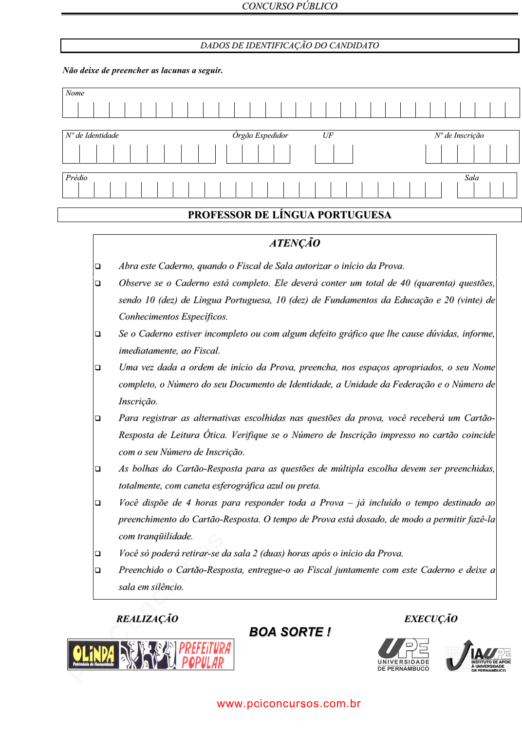 pcimarkpci MDAwMDowMDAwOjAwMDA6MDAwMDowMDAwOmZmZmY6MzZlOTpjMjU5:TW9uLCAxMyBTZXAgMjAyMSAwNDoyMTowOCAtMDMwMA== CCOONNCCUURRSSOO PPÚÚBBLLIICCOO DDAADDOOSS DDEE IIDDEENNTTIIFFIICCAAÇÇÃÃOO DDOO CCAANNDDIIDDAATTOO Não deixe de preencher as lacunas a seguir. NNoommee NNºº ddee IIddeennttiiddaaddee ÓÓrrggããoo EExxppeeddiiddoorr UUFF NNºº ddee IInnssccrriiççããoo PPrrééddiioo SSaallaa PPRROOFFEESSSSOORR DDEE LLÍÍNNGGUUAA PPOORRTTUUGGUUEESSAA AATTEENNÇÇÃÃOO �� AAbbrraa eessttee CCaaddeerrnnoo,, qquuaannddoo oo FFiissccaall ddee SSaallaa aauuttoorriizzaarr oo iinníícciioo ddaa PPrroovvaa.. �� OObbsseerrvvee ssee oo CCaaddeerrnnoo eessttáá ccoommpplleettoo.. EEllee ddeevveerráá ccoonntteerr uumm ttoottaall ddee 4400 ((qquuaarreennttaa)) qquueessttõõeess,, sseennddoo 1100 ((ddeezz)) ddee LLíínngguuaa PPoorrttuugguueessaa,, 1100 ((ddeezz)) ddee FFuunnddaammeennttooss ddaa EEdduuccaaççããoo ee 2200 ((vviinnttee)) ddee CCoonnhheecciimmeennttooss EEssppeeccííffiiccooss.. �� SSee oo CCaaddeerrnnoo eessttiivveerr iinnccoommpplleettoo oouu ccoomm aallgguumm ddeeffeeiittoo ggrrááffiiccoo qquuee llhhee ccaauussee ddúúvviiddaass,, iinnffoorrmmee,, iimmeeddiiaattaammeennttee,, aaoo FFiissccaall.. �� UUmmaa vveezz ddaaddaa aa oorrddeemm ddee iinníícciioo ddaa PPrroovvaa,, pprreeeenncchhaa,, nnooss eessppaaççooss aapprroopprriiaaddooss,, oo sseeuu NNoommee ccoommpplleettoo,, oo NNúúmmeerroo ddoo sseeuu DDooccuummeennttoo ddee IIddeennttiiddaaddee,, aa UUnniiddaaddee ddaa FFeeddeerraaççããoo ee oo NNúúmmeerroo ddee IInnssccrriiççããoo.. �� PPaarraa rreeggiissttrraarr aass aalltteerrnnaattiivvaass eessccoollhhiiddaass nnaass qquueessttõõeess ddaa pprroovvaa,, vvooccêê rreecceebbeerráá uumm CCaarrttããoo-- RReessppoossttaa ddee LLeeiittuurraa ÓÓttiiccaa.. VVeerriiffiiqquuee ssee oo NNúúmmeerroo ddee IInnssccrriiççããoo iimmpprreessssoo nnoo ccaarrttããoo ccooiinncciiddee ccoomm oo sseeuu NNúúmmeerroo ddee IInnssccrriiççããoo.. �� AAss bboollhhaass ddoo CCaarrttããoo--RReessppoossttaa ppaarraa aass qquueessttõõeess ddee mmúúllttiippllaa eessccoollhhaa ddeevveemm sseerr pprreeeenncchhiiddaass,, ttoottaallmmeennttee,, ccoomm ccaanneettaa eessffeerrooggrrááffiiccaa aazzuull oouu pprreettaa.. �� VVooccêê ddiissppõõee ddee 44 hhoorraass ppaarraa rreessppoonnddeerr ttooddaa aa PPrroovvaa –– jjáá iinncclluuííddoo oo tteemmppoo ddeessttiinnaaddoo aaoo pprreeeenncchhiimmeennttoo ddoo CCaarrttããoo--RReessppoossttaa.. OO tteemmppoo ddee PPrroovvaa eessttáá ddoossaaddoo,, ddee mmooddoo aa ppeerrmmiittiirr ffaazzêê--llaa ccoomm ttrraannqqüüiilliiddaaddee.. �� VVooccêê ssóó ppooddeerráá rreettiirraarr--ssee ddaa ssaallaa 22 ((dduuaass)) hhoorraass aappóóss oo iinníícciioo ddaa PPrroovvaa.. �� PPrreeeenncchhiiddoo oo CCaarrttããoo--RReessppoossttaa,, eennttrreegguuee--oo aaoo FFiissccaall jjuunnttaammeennttee ccoomm eessttee CCaaddeerrnnoo ee ddeeiixxee aa ssaallaa eemm ssiillêênncciioo.. BBOOAA SSOORRTTEE !! UN IVE RSIDADE DE PERNAMBUCO RREEAALLIIZZAAÇÇÃÃOO EEXXEECCUUÇÇÃÃOO www.pciconcursos.com.br pcimarkpci MDAwMDowMDAwOjAwMDA6MDAwMDowMDAwOmZmZmY6MzZlOTpjMjU5:TW9uLCAxMyBTZXAgMjAyMSAwNDoyMTowOSAtMDMwMA== CCOONNCCUURRSSOO PPÚÚBBLLIICCOO 2 LLÍÍNNGGUUAA PPOORRTTUUGGUUEESSAA Texto A para as questões de 01 a 05 sobre interpretação de texto. O brasileiro não é mal-educado, e já posso imaginar os narizes torcidos ante essa afirmação e todos os argumentos a favor dos outros do Primeiro Mundo, que, em tese, seriam muito mais educados do que nós. Mas é preciso definir o que entendemos como “educação”. Seria o conhecimento de regras e procedimentos formais que dividem os indivíduos em tribos, facilitando o convívio em círculos com acesso limitado apenas a quem domina estas regras? Ou teria mais a ver com a cortesia, a sabedoria de transmitir simpatia nos menores gestos? Acho que a educação está muito mais ligada à maneira afetiva de se relacionar do que a formalidades. (...) Podemos ser mal-informados ou despreparados para um comportamento cosmopolita e sofisticado, mas isso não quer dizer que sejamos mal-educados. Nossa marca registrada é a alegria, a gentileza, talvez um certo excesso de calor humano. Mas, convenhamos, é tão mais simpático este excesso, quando confrontado com a fleuma dos britânicos, a quase rispidez natural dos franceses, o drama exagerado dos italianos, a falsa jovialidade dos americanos ou a impassibilidade misteriosa dos japoneses. Somos uma enorme mistura de raças e culturas, este talvez seja o grande trunfo do brasileiro. Alice Carta, Revista Isto é, 2 jul, 1997. 01. Assinale a alternativa que explica a expressão “narizes torcidos.” A) Sentir-se mal em ambientes com pessoas sem educação. B) Os argumentos contra o que o texto sustenta de que também temos educação. C) Em palavras, somente o brasileiro é educado. D) Somente pessoas do Primeiro Mundo sabem o que é educação. E) O brasileiro é mal-educado pelo excesso de calor humano. 02. Através das perguntas colocadas no 1º parágrafo do texto, assinale a alternativa que indica a necessidade de se definir educação. A) Esclarecer o leitor sobre as dúvidas da convivência com pessoas. B) Convencer o leitor a aceitar o argumento de que educação é uma questão pessoal. C) Oferecer ao leitor a possibilidade de se posicionar sobre o que é ser educado. D) Descobrir detalhes da convivência entre pessoas. E) Conduzir o leitor à descoberta do que seja a boa convivência entre pessoas. 03. Assinale a alternativa que mostra a definição válida de educação para brasileiros, segundo a autora do texto. A) Conhecimento de regras que limitam o comportamento humano. B) Procedimentos que mostram ao homem o roteiro da boa convivência. C) Vivência de manifestações culturais em toda sua plenitude. D) Prática de modos afetivos no relacionamento, sobrepondo-se às r