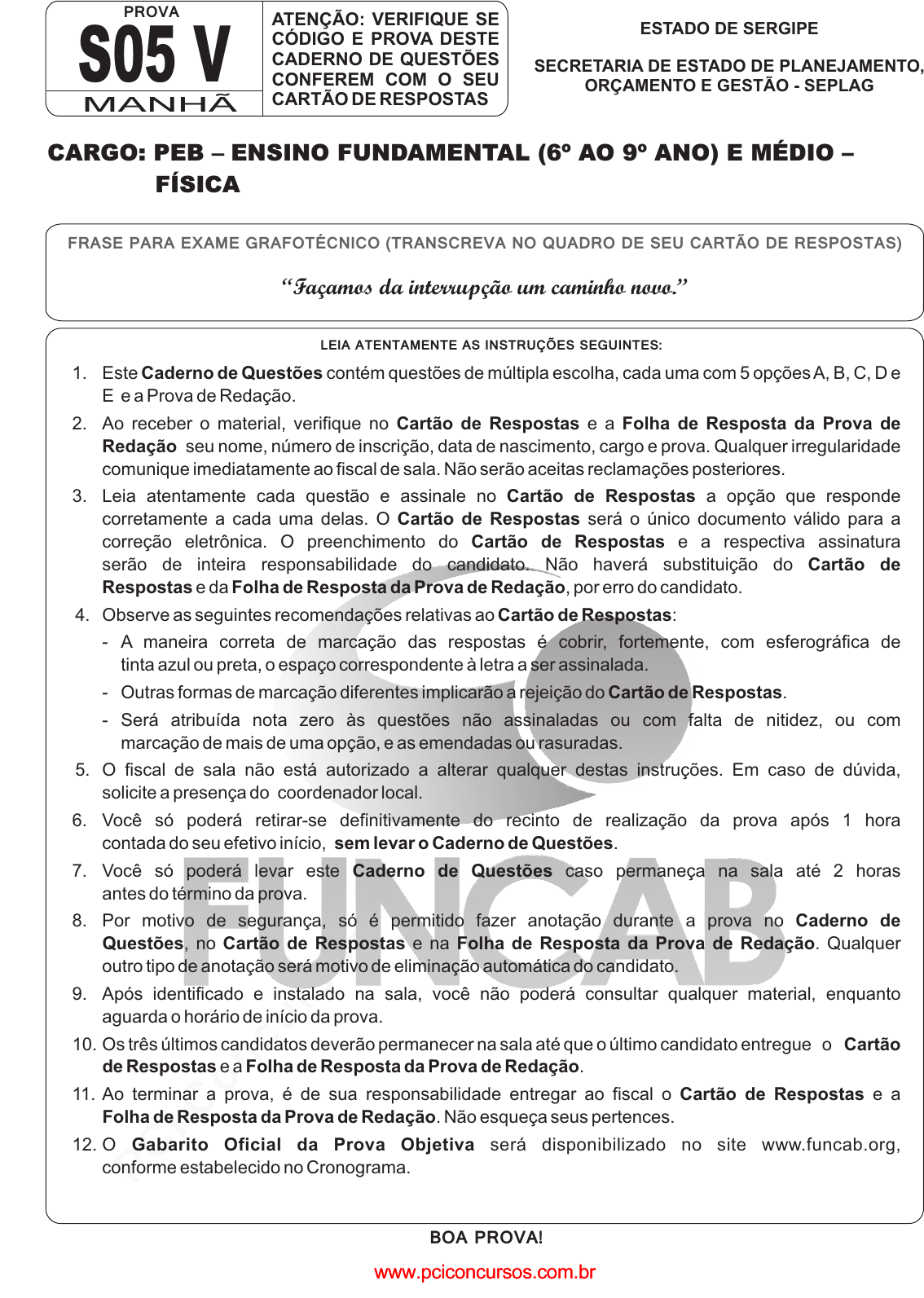 pcimarkpci MDAwMDowMDAwOjAwMDA6MDAwMDowMDAwOmZmZmY6MzZlOTpjMjU5:TW9uLCAxMyBTZXAgMjAyMSAwNToxNzo0OCAtMDMwMA== LEIA ATENTAMENTE AS INSTRUÇÕES SEGUINTES: 1. Este contém questões de múltipla escolha, cada uma com 5 opçõesA, B, C, D e E e a Prova de Redação. 2. Ao receber o material, verifique no e a seu nome, número de inscrição, data de nascimento, cargo e prova. Qualquer irregularidade comunique imediatamente ao fiscal de sala. Não serão aceitas reclamações posteriores. 3. Leia atentamente cada questão e assinale no a opção que responde corretamente a cada uma delas. O será o único documento válido para a correção eletrônica. O preenchimento do e a respectiva assinatura serão de inteira responsabilidade do candidato. Não haverá substituição do e da , por erro do candidato. 4. Observe as seguintes recomendações relativas ao : - A maneira correta de marcação das respostas é cobrir, fortemente, com esferográfica de tinta azul ou preta, o espaço correspondente à letra a ser assinalada. - Outras formas de marcação diferentes implicarão a rejeição do . - Será atribuída nota zero às questões não assinaladas ou com falta de nitidez, ou com marcação de mais de uma opção, e as emendadas ou rasuradas. 5. O fiscal de sala não está autorizado a alterar qualquer destas instruções. Em caso de dúvida, solicite a presença do coordenador local. 6. Você só poderá retirar-se definitivamente do recinto de realização da prova após 1 hora contada do seu efetivo início, . 7. Você só poderá levar este caso permaneça na sala até 2 horas antes do término da prova. 8. Por motivo de segurança, só é permitido fazer anotação durante a prova no , no e na . Qualquer outro tipo de anotação será motivo de eliminação automática do candidato. 9. Após identificado e instalado na sala, você não poderá consultar qualquer material, enquanto aguarda o horário de início da prova. 10. Os três últimos candidatos deverão permanecer na sala até que o último candidato entregue o e a . 11. Ao terminar a prova, é de sua responsabilidade entregar ao fiscal o e a . Não esqueça seus pertences. 12. O será disponibilizado no site www.funcab.org, conforme estabelecido no Cronograma. Caderno de Questões Cartão de Respostas Folha de Resposta da Prova de Redação Cartão de Respostas Cartão de Respostas Cartão de Respostas Cartão de Respostas Folha de Resposta da Prova de Redação Cartão de Respostas Cartão de Respostas sem levar o Caderno de Questões Caderno de Questões Caderno de Questões Cartão de Respostas Folha de Resposta da Prova de Redação Cartão de Respostas Folha de Resposta da Prova de Redação Cartão de Respostas Folha de Resposta da Prova de Redação Gabarito Oficial da Prova Objetiva CARGO: PEB ENSINO FUNDAMENTAL (6º AO 9º ANO) E MÉDIO – FÍSICA – FRASE PARA EXAME GRAFOTÉCNICO (TRANSCREVA NO QUADRO DE SEU CARTÃO DE RESPOSTAS) “Façamos da interrupção um caminho novo.” S05 V ATENÇÃO: VERIFIQUE SE CÓDIGO E PROVA DESTE CADERNO DE QUESTÕES CONFEREM COM O SEU CARTÃO DE RESPOSTAS PROVA MANHÃ BOA PROVA! ESTADO DE SERGIPE SECRETARIA DE ESTADO DE PLANEJAMENTO, ORÇAMENTO E GESTÃO - SEPLAG www.pciconcursos.com.brwww.pciconcursos.com.br pcimarkpci MDAwMDowMDAwOjAwMDA6MDAwMDowMDAwOmZmZmY6MzZlOTpjMjU5:TW9uLCAxMyBTZXAgMjAyMSAwNToxNzo0OCAtMDMwMA== 02 Leia o texto abaixo e responda às questões propostas. Em seu caminho para Meca, um peregrino passou por Bagdá, e ali, com muito esforço, tentou vender um colar seu que valia mil moedas de ouro. Não tendo encontrado comprador, foi até um perfumista de quem diziam ser um homem de bem e com ele deixou o colar. Então fez a peregrinação a Meca e retornou. Com um presente, foi até o perfumista, que lhe perguntou: – Quem é você? E o que é isso? Ele respondeu: – Sou o dono do colar deixado com você. O peregrino nem bem terminou de falar e o perfumista lhe deu um pontapé que o atirou para fora da loja e lhe disse: – Como você faz semelhante alegação contra mim? As pessoas se aglomeraram por ali e disseram ao peregrino: – Ai de ti! Este é um homem de bem! Você não encontrou outra pessoa contra a qual fazer alegações? Perplexo, o homem insistiu em falar com o perfumista, que não fez senão aumentar as ofensas e agressões. Disseram-lhe então: – Seria bom que você fosse ao sultão ‘Ûdud Addawla. Ele tem bons métodos para resolver estas coisas. O peregrino escreveu a história e foi levar o papel a 'Ûdud Addawla. Ao lê-lo, o sultão gritou chamando-o, e o peregrino se apresentou. Perguntou sobre o que ocorrera, e o peregrino lhe relatou o caso. ‘ÛdudAddawla disse: – Vá até o perfumista amanhã pela manhã e sente-se no banco diante de sua loja. Se ele expulsá-lo, sente-se no banco do outro lado da rua, e ali permaneça desde o amanhecer até o entardecer. Não lhe dirija a palavra. Repita essa ação por três dias. No quarto dia, eu passarei por ali, pararei e cumprimentarei você. Não fique de pé para mim nem faça mais do que responder à minha saudação e às perguntas que eu lhe dirigir. E assim o peregrino foi até o perfumista, que o impediu de sentar-se no banco em frente da loja. Durante os três dias seguintes, ele se sentou no banco do outro lado da rua. No quarto dia, ‘Ûdud Addawla passou por ali com seu magnífico cortejo e, ao avistar o peregrino, parou e disse: – Que a paz esteja convosco! Sem se movimentar, o peregrino respondeu: – Convosco esteja a paz! O peregrino, o colar e o perfumista - Língua Portuguesa FUNCAB - Fundação Professor Carlos Augusto Bittencourt ‘ÛdudAddawla perguntou: – Meu irmão, você vem até Bagdá e não vai nos visitar nem nos dizer quais são as suas necessidades? O peregrino respondeu: –Assim foi! E não esticou a conversa, por mais que o sultão perguntasse e demonstrasse preocupação. Ele parara, e com ele todos os soldados do seu cortejo. O perfumista quase desmai