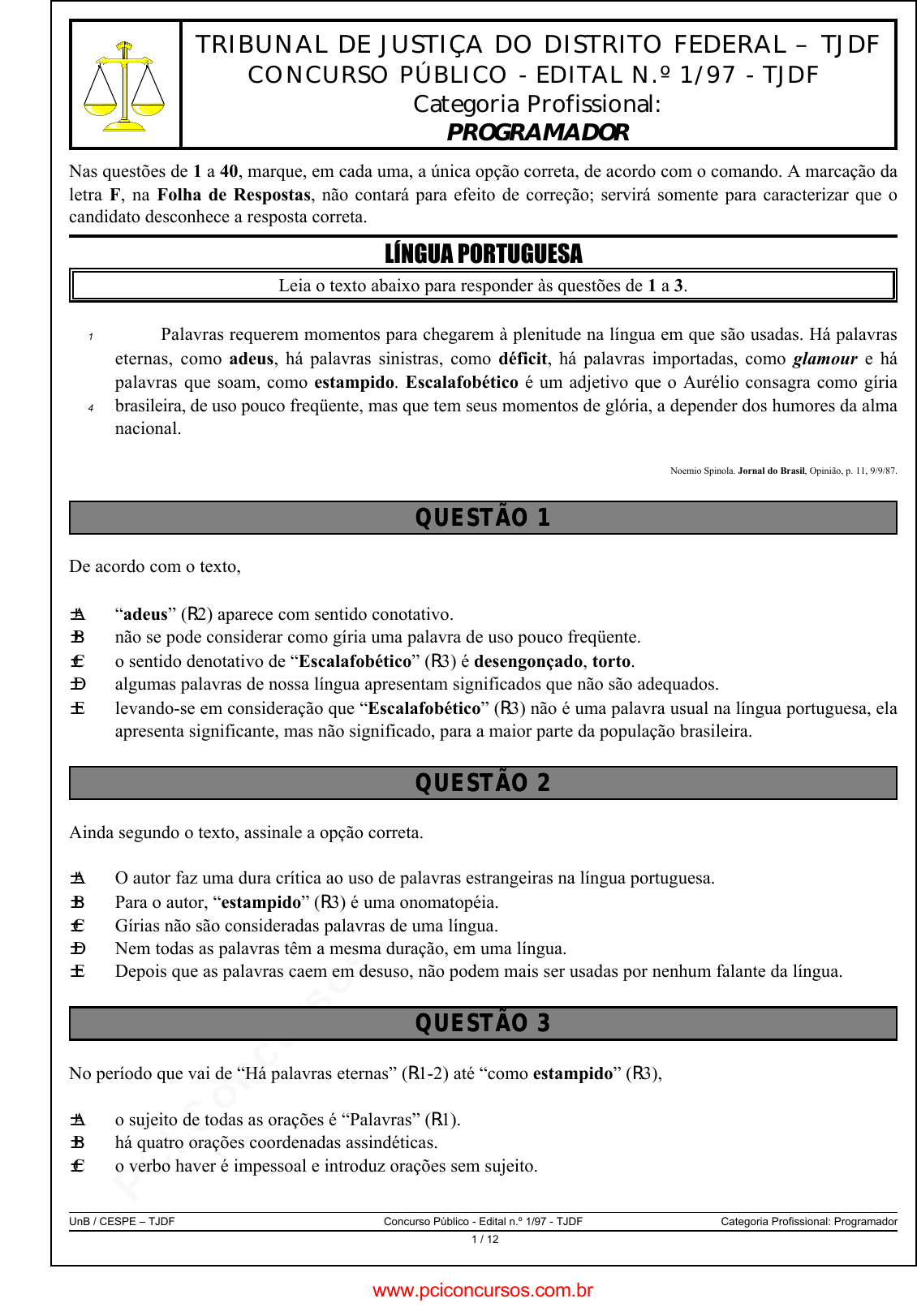 UnB / CESPE – TJDF Concurso Público - Edital n.º 1/97 - TJDF Categoria Profissional: Programador