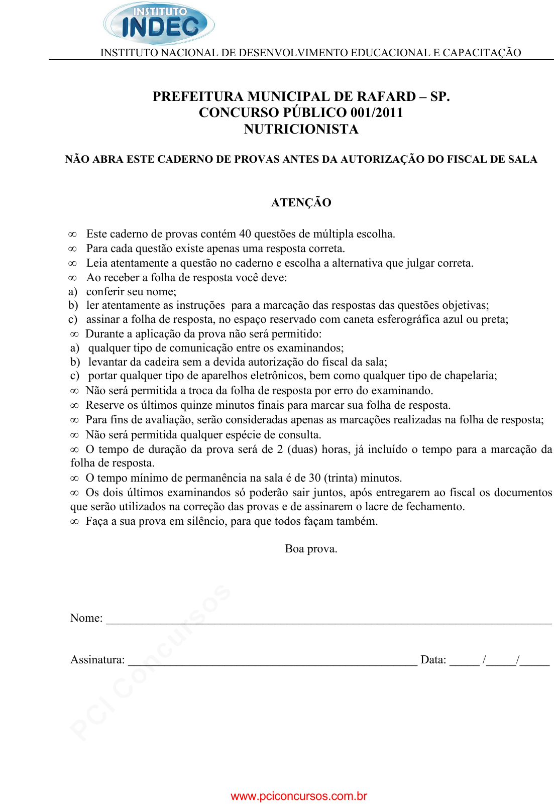 pcimarkpci MDAwMDowMDAwOjAwMDA6MDAwMDowMDAwOmZmZmY6MzZlOTpjMjU5:TW9uLCAxMyBTZXAgMjAyMSAxNzo0MjowNyAtMDMwMA== INSTITUTO NACIONAL DE DESENVOLVIMENTO EDUCACIONAL E CAPACITAÇÃO PREFEITURA MUNICIPAL DE RAFARD – SP. CONCURSO PÚBLICO 001/2011 NUTRICIONISTA NÃO ABRA ESTE CADERNO DE PROVAS ANTES DA AUTORIZAÇÃ O DO FISCAL DE SALA ATENÇÃO • Este caderno de provas contém 40 questões de múltipla escolha. • Para cada questão existe apenas uma resposta correta. • Leia atentamente a questão no caderno e escolha a alternativa que julgar correta. • Ao receber a folha de resposta você deve: a) conferir seu nome; b) ler atentamente as instruções para a marcação das respostas das questões objetivas; c) assinar a folha de resposta, no espaço reservado com caneta esferográfica azul ou preta; • Durante a aplicação da prova não será permitido: a) qualquer tipo de comunicação entre os examinandos; b) levantar da cadeira sem a devida autorização do fiscal da sala; c) portar qualquer tipo de aparelhos eletrônicos, bem como qualquer tipo de chapelaria; • Não será permitida a troca da folha de resposta por erro do examinando. • Reserve os últimos quinze minutos finais para marcar sua folha de resposta. • Para fins de avaliação, serão consideradas apenas as marcações realizadas na folha de resposta; • Não será permitida qualquer espécie de consulta. • O tempo de duração da prova será de 2 (duas) horas, já incluído o tempo para a marcação da folha de resposta. • O tempo mínimo de permanência na sala é de 30 (trinta) minutos. • Os dois últimos examinandos só poderão sair juntos, após entregarem ao fiscal os documentos que serão utilizados na correção das provas e de assinarem o lacre de fechamento. • Faça a sua prova em silêncio, para que todos façam também. Boa prova. Nome: __________________________________________________________________________ Assinatura: ________________________________________________ Data: _____ /_____/_____ www.pciconcursos.com.br pcimarkpci MDAwMDowMDAwOjAwMDA6MDAwMDowMDAwOmZmZmY6MzZlOTpjMjU5:TW9uLCAxMyBTZXAgMjAyMSAxNzo0MjowNyAtMDMwMA== 2 NUTRICIONISTA PORTUGUÊS 1. O “lhe”, pronome pessoal do caso oblíquo átono, pode exercer diferentes funções sintáticas. Analisando a seguinte oração: “...o amor e o ciúme lhe ocupavam a alma...” Podemos afirmar corretamente que a função sintática exercida por esse pronome em destaque é de: a) ( ) Adjunto adnominal c) ( ) Objeto direto b) ( ) Objeto indireto d) ( ) Sujeito 2. No período: “Ninguém, antes que Marcos o fizesse, teve coragem de falar o que foi dito”. Pode-se afirmar corretamente que o termo em destaque exerce a função gramatical de: a) ( ) Artigo definido c) ( ) Pronome pessoal oblíquo átono b) ( ) Pronome demonstrativo d) ( ) Pronome indefinido 3. Observe o seguinte período: “Se eu pudesse, entrava nessa dança, agora”. O tempo e o modo verbal em que se encontra conjugado o verbo em destaque é: a) ( ) Presente do Indicativo c) ( ) Pretérito Imperfeito do Indicativo b) ( ) Pretérito Perfeito do Indicativo d) ( ) Pretérito Mais que Perfeito do Indicativo 4. Em: “Os fiscais de sala orientarão os candidatos durante a prova”. O verbo da oração destacado terá, na Voz Passiva, a seguinte forma: a) ( ) orientaram-se c) ( ) terão orientado b) ( ) haverão de orientar d) ( ) serão orientados 5. Em relação ao trecho: “A reação dos torcedores foi tão chocante como as terríveis cobranças dos pênaltis”. É correto afirmar que a conjunção em destaque estabelece o sentido de: a) ( ) comparação c) ( ) concessão b) ( ) causa d) ( ) conformidade 6. Entre as alternativas abaixo, apenas uma apresenta uma oração com sujeito indeterminado. Indique-a: a) ( ) Pede-se um pouco de silêncio, por favor. c) ( ) Há a marca da vida nas pessoas. b) ( ) Ia um coitado qualquer pela rua. d) ( ) Não se necessita de palpites inúteis. 7. Na oração: “Tocavam não sei que música”. O termo em destaque tem a função sintática de: a) ( ) sujeito c) ( ) adjunto adnominal b) ( ) adjunto adverbial d) ( ) objeto direto 8. Assinale a alternativa que preenche corretamente as lacunas do seguinte período: Catarina...........confusa quanto...........enviar um bilhete ao rapaz. a) ( ) meio - à c) ( ) meia - a b) ( ) meio - a d) ( ) meia - à 9. Assinale a alternativa que preenche corretamente as lacunas do seguinte período: Esta é uma situação.............se deve evitar. a) ( ) que c) ( ) de que b) ( ) em que d) ( ) a que 10. No período: Seria necessário que todos prestassem mais atenção. O termo em destaque exerce a função gramatical de: a) ( ) pronome relativo c) ( ) conjunção coordenativa b) ( ) preposição d) ( ) conjunção integrante www.pciconcursos.com.br pcimarkpci MDAwMDowMDAwOjAwMDA6MDAwMDowMDAwOmZmZmY6MzZlOTpjMjU5:TW9uLCAxMyBTZXAgMjAyMSAxNzo0MjowNyAtMDMwMA== 3 CONHECIMENTOS ESPECÍFICOS 11. A indicação para uma dieta adequada para um paciente com constipação intestinal, deve conter principalmente: a) ( ) Aumentar a ingestão de fibras insolúveis. b) ( ) Diminuir a ingestão de fibras solúveis. c) ( ) Aumentar a ingestão de água e eletrólitos. d) ( ) Aumentar a ingestão de proteínas. 12. A Esteatose Hepática, conhecido também como fígado gordo, tem por característica um depósito excessivo de gordura nos hepatócitos, causada por: a) ( ) Alcoolismo e obesidade. b) ( ) Intoxicações e diabetes. c) ( ) Hepatite, Kwashiorkor e uso de drogas. d) ( ) Todas as alternativas estão corretas. 13. Para o cálculo do quadro de pessoal, é necessário levar em consideração: a) ( ) Número de pessoal fixo, número de pessoal substituto de folga e número de substituto de férias. b) ( ) Número de pessoal para licença médica e licença gestante. c) ( ) Número de pessoal substituto de folga, número de pessoal substituto de férias e número de pessoal para licença médica e licença gestante. d) (