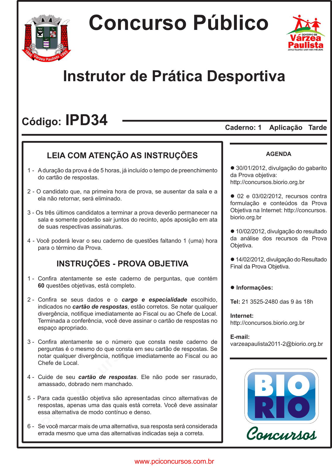pcimarkpci MDAwMDowMDAwOjAwMDA6MDAwMDowMDAwOmZmZmY6MzZlOTpjMjU5:V2VkLCAxNSBTZXAgMjAyMSAwNDoxMTo1NSAtMDMwMA== Concurso Público LEIA COM ATENÇÃO AS INSTRUÇÕES 1 - A duração da prova é de 5 horas, já incluído o tempo de preenchimento do cartão de respostas. 2 - O candidato que, na primeira hora de prova, se ausentar da sala e a ela não retornar, será eliminado. 3 - Os três últimos candidatos a terminar a prova deverão permanecer na sala e somente poderão sair juntos do recinto, após aposição em ata de suas respectivas assinaturas. 4 - Você poderá levar o seu caderno de questões faltando 1 (uma) hora para o término da Prova. INSTRUÇÕES - PROVA OBJETIVA 1 - Confira atentamente se este caderno de perguntas, que contém 60 questões objetivas, está completo. 2 - Confira se seus dados e o cargo e especialidade escolhido, indicados no cartão de respostas, estão corretos. Se notar qualquer divergência, notifique imediatamente ao Fiscal ou ao Chefe de Local. Terminada a conferência, você deve assinar o cartão de respostas no espaço apropriado. 3 - Confira atentamente se o número que consta neste caderno de perguntas é o mesmo do que consta em seu cartão de respostas. Se notar qualquer divergência, notifique imediatamente ao Fiscal ou ao Chefe de Local. 4 - Cuide de seu cartão de respostas. Ele não pode ser rasurado, amassado, dobrado nem manchado. 5 - Para cada questão objetiva são apresentadas cinco alternativas de respostas, apenas uma das quais está correta. Você deve assinalar essa alternativa de modo contínuo e denso. 6 - Se você marcar mais de uma alternativa, sua resposta será considerada errada mesmo que uma das alternativas indicadas seja a correta. Instrutor de Prática Desportiva AGENDA l 30/01/2012, divulgação do gabarito da Prova objetiva: http://concursos.biorio.org.br l 02 e 03/02/2012, recursos contra formulação e conteúdos da Prova Objetiva na Internet: http://concursos. biorio.org.br l 10/02/2012, divulgação do resultado da análise dos recursos da Prova Objetiva. l 14/02/2012, divulgação do Resultado Final da Prova Objetiva. l Informações: Tel: 21 3525-2480 das 9 às 18h Internet: http://concursos.biorio.org.br E-mail: varzeapaulista2011-2@biorio.org.br Caderno: 1 Aplicação TardeCódigo: IPD34 www.pciconcursos.com.br pcimarkpci MDAwMDowMDAwOjAwMDA6MDAwMDowMDAwOmZmZmY6MzZlOTpjMjU5:V2VkLCAxNSBTZXAgMjAyMSAwNDoxMTo1NSAtMDMwMA== INSTRUTOR DE PRÁTICA DESPORTIVA CADERNO 1 2 LÍNGUA PORTUGUESA Texto 1 ON-LINE, OFF-LINE Ann-Sophie, vinte anos, estudante da Copenhagen Business School, respondeu da seguinte maneira as perguntas formuladas por Flemming Wisler: “Não quero que minha vida me controle demais...O mais importante é se sentir à vontade...Ninguém quer ficar parado no mesmo emprego por muito tempo.” Em outras palavras: mantenha abertas suas opções. Não jure fidelidade do tipo “até que a morte nos separe” a qualquer coisa ou a qualquer pessoa. O mundo está cheio de oportunidades maravilhosas, sedutoras e promissoras; é loucura perder qualquer delas tentando se amarrar de pés e mãos a compromissos irrevogáveis. Não admira que o surfe ocupe um dos primeiros lugares de uma lista de habilidades básicas que motivam um jovem a procurar aprender, que ele anseia por dominar acima e além do desejo ultrapassado de “sondar” e “penetrar” o sentido das coisas. Mas, como observou Katie Baldo, orientadora pedagógica da Cooperstown Middle School, do Estado de Nova York, “os adolescentes perdem importantes dicas sociais porque estão fixados em seus Ipods, telefones celulares e videogames. Vejo isso o tempo todo nos corredores do colégio, quando eles não conseguem dizer ‘oi’ nem fazer contato com os olhos.” Fazer contato com o olhar, reconhecendo a proximidade física de outro ser humano, parece perda de tempo: sinaliza a necessidade de gastar uma parcela do tempo precioso, mas horrivelmente escasso, em mergulhos profundos (coisa que a exploração de profundidades certamente exigiria); uma decisão que poderia interromper ou impedir o surfe por tantas outras superfícies não menos – e talvez muito mais – convidativas. Numa vida de contínuas emergências, as relações virtuais derrotam facilmente a “vida real”. Embora os principais estímulos para que os jovens estejam sempre em movimento provenham do mundo off-line, esses estímulos seriam inúteis sem a capacidade dos equipamentos eletrônicos de multiplicar encontros entre indivíduos, tornando-os breves, superficiais e sobretudo descartáveis. As relações virtuais contam com teclas de “excluir” e “remover spams” que protegem contra as consequências inconvenientes (e principalmente consumidoras de tempo) da interação mais profunda. Não posso deixar de recordar aqui Chance, o personagem interpretado por Peter Sellers no filme Muito além do jardim (1979), de Hal Hashby: recém chegado a uma cidade movimentada, depois de passar a vida inteira num tête-à-tête exclusivo com “o mundo mostrado pela televisão”, Chance tenta em vão apagar um irritante e desagradável grupo de freiras de seu campo visual com a ajuda do controle remoto. Para um jovem, o principal atrativo do mundo virtual é a ausência de contradições e objetivos conflitantes que rondam a vida off-line. O mundo on-line, por outro lado, cria uma multiplicação infinita de possibilidades de contatos plausíveis e factíveis. Ele faz isso reduzindo a duração desses contatos e, por conseguinte, enfraquecendo os laços, muitas vezes impondo o tempo – em flagrante oposição à sua contrapartida off-line, que, como é sabido, se apoia no esforço continuado de fortalecer os vínculos, limitando severamente o número de contatos à medida que eles se ampliam e se aprofundam. Essa é uma grande vantagem para homens e mulheres que se atormentam com a ideia de que o passo que deram talvez seja equivocado (apenas talvez), e que talvez (apenas talvez) fosse ta