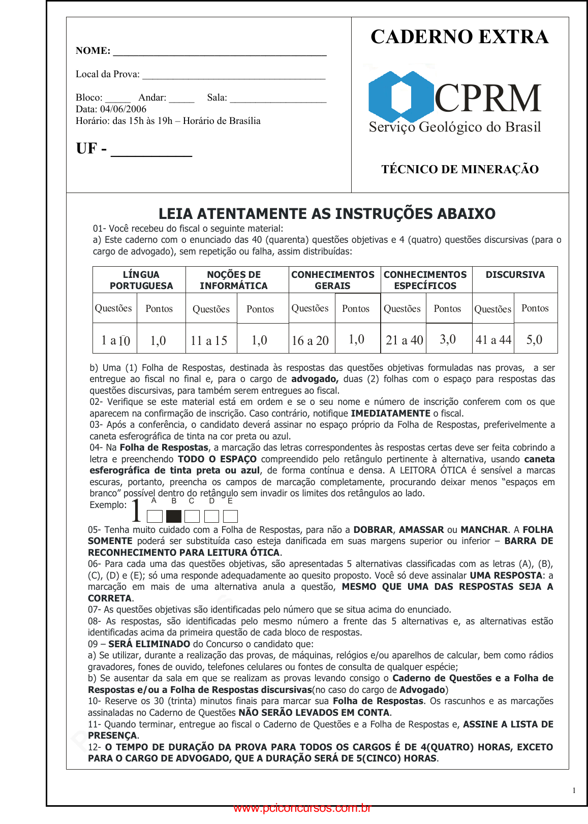 pcimarkpci MDAwMDowMDAwOjAwMDA6MDAwMDowMDAwOmZmZmY6MzZlOTpjMjU5:U2F0LCAxMSBTZXAgMjAyMSAwNToyMzozMCAtMDMwMA== 1 CPRM Serviço Geológico do Brasil LEIA ATENTAMENTE AS INSTRUÇÕES ABAIXO 01- Você recebeu do fiscal o seguinte material: a) Este caderno com o enunciado das 40 (quarenta) questões objetivas e 4 (quatro) questões discursivas (para o cargo de advogado), sem repetição ou falha, assim distribuídas: CONHECIMENTOS GERAIS LÍNGUA PORTUGUESA NOÇÕES DE INFORMÁTICA ESPECÍFICA DISCURSIVA 21 a 40 Questões Questões Questões Questões Questões 1 a 5 Pontos Pontos Pontos Pontos Pontos 1,0 6 a 15 1,0 16 a 20 1,0 3,0 41 a 44 5,0 A B C D E1 05- Tenha muito cuidado com a Folha de Respostas, para não a DOBRAR, AMASSAR ou MANCHAR. A FOLHA SOMENTE poderá ser substituída caso esteja danificada em suas margens superior ou inferior – BARRA DE RECONHECIMENTO PARA LEITURA ÓTICA. 06- Para cada uma das questões objetivas, são apresentadas 5 alternativas classificadas com as letras (A), (B), (C), (D) e (E); só uma responde adequadamente ao quesito proposto. Você só deve assinalar UMA RESPOSTA: a marcação em mais de uma alternativa anula a questão, MESMO QUE UMA DAS RESPOSTAS SEJA A CORRETA. 07- As questões objetivas são identificadas pelo número que se situa acima do enunciado. 08- As respostas, são identificadas pelo mesmo número a frente das 5 alternativas e, as alternativas estão identificadas acima da primeira questão de cada bloco de respostas. 09 – SERÁ ELIMINADO do Concurso o candidato que: a) Se utilizar, durante a realização das provas, de máquinas, relógios e/ou aparelhos de calcular, bem como rádios gravadores, fones de ouvido, telefones celulares ou fontes de consulta de qualquer espécie; b) Se ausentar da sala em que se realizam as provas levando consigo o Caderno de Questões e a Folha de Respostas e/ou a Folha de Respostas discursivas(no caso do cargo de Advogado) 10- Reserve os 30 (trinta) minutos finais para marcar sua Folha de Respostas. Os rascunhos e as marcações assinaladas no Caderno de Questões NÃO SERÃO LEVADOS EM CONTA. 11- Quando terminar, entregue ao fiscal o Caderno de Questões e a Folha de Respostas e, ASSINE A LISTA DE PRESENÇA. 12- O TEMPO DE DURAÇÃO DA PROVA PARA TODOS OS CARGOS É DE 4(QUATRO) HORAS, EXCETO PARA O CARGO DE ADVOGADO, QUE A DURAÇÃO SERÁ DE 5(CINCO) HORAS. b) Uma (1) Folha de Respostas, destinada às respostas das questões objetivas formuladas nas provas, a ser entregue ao fiscal no final e, para o cargo de advogado, duas (2) folhas com o espaço para respostas das questões discursivas, para também serem entregues ao fiscal. 02- Verifique se este material está em ordem e se o seu nome e número de inscrição conferem com os que aparecem na confirmação de inscrição. Caso contrário, notifique IMEDIATAMENTE o fiscal. 03- Após a conferência, o candidato deverá assinar no espaço próprio da Folha de Respostas, preferivelmente a caneta esferográfica de tinta na cor preta ou azul. 04- Na Folha de Respostas, a marcação das letras correspondentes às respostas certas deve ser feita cobrindo a letra e preenchendo TODO O ESPAÇO compreendido pelo retângulo pertinente à alternativa, usando caneta esferográfica de tinta preta ou azul, de forma contínua e densa. A LEITORA ÓTICA é sensível a marcas escuras, portanto, preencha os campos de marcação completamente, procurando deixar menos “espaços em branco” possível dentro do retângulo sem invadir os limites dos retângulos ao lado. Exemplo: LÍNGUA PORTUGUESA 10 11 a 15 16 a 20 NOÇÕES DE INFORMÁTICA CONHECIMENTOS GERAIS CONHECIMENTOS ESPECÍFICOS CADERNO EXTRA TÉCNICO DE MINERAÇÃO NOME: __________________________________________ Local da Prova: ____________________________________ Bloco: _____ Andar: _____ Sala: ___________________ Data: 04/06/2006 Horário: das 15h às 19h – Horário de Brasília UF - __________ www.pciconcursos.com.br pcimarkpci MDAwMDowMDAwOjAwMDA6MDAwMDowMDAwOmZmZmY6MzZlOTpjMjU5:U2F0LCAxMSBTZXAgMjAyMSAwNToyMzozMCAtMDMwMA== TEXTO Os homenzinhos de Grork A ficção científica parte de alguns pressupostos, ou preconceitos, que nunca foram devidamente discutidos. Por exemplo: sempre que uma nave espacial chega à Terra vinda de outro planeta, é um planeta mais adiantado do que o nosso. Os extraterrenos nos intimidam com suas armas fantásticas ou com sua sabedoria exemplar. Pior do que o raio da morte é o seu ar de superioridade moral. A civilização deles é invariavelmente mais organizada e virtuosa do que a da Terra e eles não perdem a oportunidade de nos lembrar disto. Cansado de tanta humilhação, imaginei uma história de ficção diferente. Para começar, o Objeto Voador Não Identificado que chega à Terra, descendo numa planície do Meio-Oeste dos Estados Unidos, chama a atenção por um estranho detalhe: a chaminé. — Vi com estes olhos, xerife. Ele veio numa trajetória irregular, deu alguns pinotes, tentou subir e depois caiu como uma pedra. — Deixando um facho de luz atrás? — Não, um facho de fumaça. Da chaminé. — Chaminé? Impossível. Vai ver o alambique do velho Sam explodiu outra vez e a sua cabana voou. — Não, tinha o formato de um disco voador. Mas com uma chaminé em cima. O xerife chama as autoridades estaduais, que cercam o aparelho. Ninguém ousa se aproximar até que cheguem as tropas federais. Um dos policiais comenta para o outro: — Você notou? A vegetação em volta... — Dizimada. Provavelmente um campo magnético destrutivo que cerca o disco e... — Não. Parece cortada a machadinha. Se não fosse um absurdo eu até diria que eles estão colhendo lenha. Nesse instante, um segmento de um dos painéis do disco, que é todo feito de madeira compensada, é chutado para fora e aparecem três homenzinhos com machadinhas sobre os ombros. Os três saem à procura de árvores para cortar. Estão examinando as pernas de um dos policiais, quando este resolve se identific