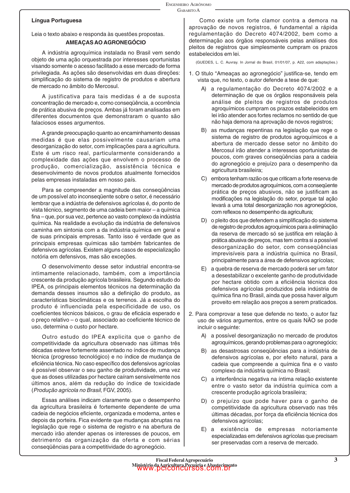 pcimarkpci MDAwMDowMDAwOjAwMDA6MDAwMDowMDAwOmZmZmY6MzZlOTpjMjU5:V2VkLCAxNSBTZXAgMjAyMSAxNjowNjo0OCAtMDMwMA== 3 ENGENHEIRO AGRÔNOMO GABARITO A Fiscal Federal Agropecuário Ministério da Agricultura,Pecuária e Abastecimento Língua Portuguesa Leia o texto abaixo e responda às questões propostas. AMEAÇAS AO AGRONEGÓCIO A indústria agroquímica instalada no Brasil vem sendo objeto de uma ação orquestrada por interesses oportunistas visando somente o acesso facilitado a esse mercado de forma privilegiada. As ações são desenvolvidas em duas direções: simplificação do sistema de registro de produtos e abertura de mercado no âmbito do Mercosul. A justificativa para tais medidas é a de suposta concentração de mercado e, como conseqüência, a ocorrência de prática abusiva de preços. Ambas já foram analisadas em diferentes documentos que demonstraram o quanto são falaciosos esses argumentos. A grande preocupação quanto ao encaminhamento dessas medidas é que elas possivelmente causariam uma desorganização do setor, com implicações para a agricultura. Este é um risco real, particularmente considerando a complexidade das ações que envolvem o processo de produção, comercialização, assistência técnica e desenvolvimento de novos produtos atualmente fornecidos pelas empresas instaladas em nosso país. Para se compreender a magnitude das conseqüências de um possível ato inconseqüente sobre o setor, é necessário lembrar que a indústria de defensivos agrícolas é, do ponto de vista técnico, segmento de uma cadeia bem maior – a química fina – que, por sua vez, pertence ao vasto complexo da indústria química. Na realidade a evolução da indústria de defensivos caminha em sintonia com a da indústria química em geral e de suas principais empresas. Tanto isso é verdade que as principais empresas químicas são também fabricantes de defensivos agrícolas. Existem alguns casos de especialização notória em defensivos, mas são exceções. O desenvolvimento desse setor industrial encontra-se intimamente relacionado, também, com a importância crescente da produção agrícola brasileira. Segundo estudo do IPEA, os principais elementos técnicos na determinação da demanda desses insumos são a definição do produto, as características bioclimáticas e os terrenos. Já a escolha do produto é influenciada pela especificidade de uso, os coeficientes técnicos básicos, o grau de eficácia esperado e o preço relativo – o qual, associado ao coeficiente técnico de uso, determina o custo por hectare. Outro estudo do IPEA explicita que o ganho de competitividade da agricultura observado nas últimas três décadas esteve fortemente assentado no índice de mudança técnica (progresso tecnológico) e no índice de mudança de eficiência técnica. No caso específico dos defensivos agrícolas é possível observar o seu ganho de produtividade, uma vez que as doses utilizadas por hectare caíram sensivelmente nos últimos anos, além da redução do índice de toxicidade (Produção agrícola no Brasil, FGV, 2005). Essas análises indicam claramente que o desempenho da agricultura brasileira é fortemente dependente de uma cadeia de negócios eficiente, organizada e moderna, antes e depois da porteira. Fica evidente que mudanças abruptas na legislação que rege o sistema de registro e na abertura de mercado irão atender apenas os interesses de poucos, em detrimento da organização da oferta e com sérias conseqüências para a competitividade do agronegócio. Como existe um forte clamor contra a demora na aprovação de novos registros, é fundamental a rápida regulamentação do Decreto 4074/2002, bem como a determinação aos órgãos responsáveis pelas análises dos pleitos de registros que simplesmente cumpram os prazos estabelecidos em lei. (GUEDES, L. C. Auvray. In Jornal do Brasil, 01/01/07, p. A22, com adaptações.) 1. O titulo “Ameaças ao agronegócio” justifica-se, tendo em vista que, no texto, o autor defende a tese de que: A) a regulamentação do Decreto 4074/2002 e a determinação de que os órgãos responsáveis pela análise de pleitos de registros de produtos agroquímicos cumpram os prazos estabelecidos em lei irão atender aos fortes reclamos no sentido de que não haja demora na aprovação de novos registros; B) as mudanças repentinas na legislação que rege o sistema de registro de produtos agroquímicos e a abertura de mercado desse setor no âmbito do Mercosul irão atender a interesses oportunistas de poucos, com graves conseqüências para a cadeia do agronegócio e prejuízo para o desempenho da agricultura brasileira; C) embora tenham razão os que criticam a forte reserva de mercado de produtos agroquímicos, com a conseqüente prática de preços abusivos, não se justificam as modificações na legislação do setor, porque tal ação levará a uma total desorganização nos agronegócios, com reflexos no desempenho da agricultura; D) o pleito dos que defendem a simplificação do sistema de registro de produtos agroquímicos para a eliminação da reserva de mercado só se justifica em relação à prática abusiva de preços, mas tem contra si a possível desorganização do setor, com conseqüências imprevisíveis para a indústria química no Brasil, principalmente para a área de defensivos agrícolas; E) a quebra de reserva de mercado poderá ser um fator a desestabilizar o excelente ganho de produtividade por hectare obtido com a eficiência técnica dos defensivos agrícolas produzidos pela indústria de química fina no Brasil, ainda que possa haver algum proveito em relação aos preços a serem praticados. 2. Para comprovar a tese que defende no texto, o autor faz uso de vários argumentos, entre os quais NÃO se pode incluir o seguinte: A) a possível desorganização no mercado de produtos agroquímicos, gerando problemas para o agronegócio; B) as desastrosas conseqüências para a indústri
