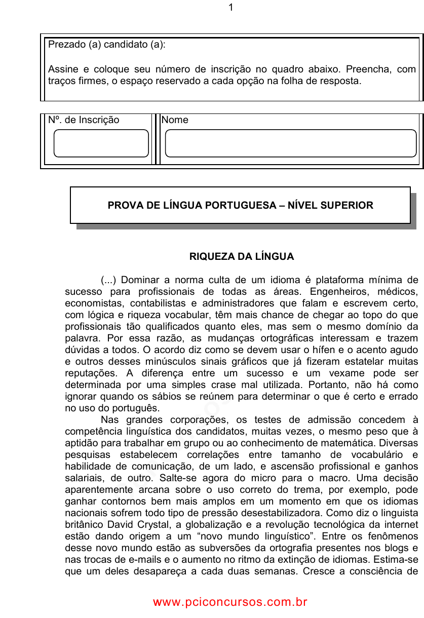 pcimarkpci MDAwMDowMDAwOjAwMDA6MDAwMDowMDAwOmZmZmY6MzZlOTpjMjU5:V2VkLCAxNSBTZXAgMjAyMSAxNzo0MzozOSAtMDMwMA== Prezado (a) candidato (a): Assine e coloque seu número de inscrição no quadro abaixo. Preencha, com traços firmes, o espaço reservado a cada opção na folha de resposta. Nº. de Inscrição Nome RIQUEZA DA LÍNGUA (...) Dominar a norma culta de um idioma é plataforma mínima de sucesso para profissionais de todas as áreas. Engenheiros, médicos, economistas, contabilistas e administradores que falam e escrevem certo, com lógica e riqueza vocabular, têm mais chance de chegar ao topo do que profissionais tão qualificados quanto eles, mas sem o mesmo domínio da palavra. Por essa razão, as mudanças ortográficas interessam e trazem dúvidas a todos. O acordo diz como se devem usar o hífen e o acento agudo e outros desses minúsculos sinais gráficos que já fizeram estatelar muitas reputações. A diferença entre um sucesso e um vexame pode ser determinada por uma simples crase mal utilizada. Portanto, não há como ignorar quando os sábios se reúnem para determinar o que é certo e errado no uso do português. Nas grandes corporações, os testes de admissão concedem à competência linguística dos candidatos, muitas vezes, o mesmo peso que à aptidão para trabalhar em grupo ou ao conhecimento de matemática. Diversas pesquisas estabelecem correlações entre tamanho de vocabulário e habilidade de comunicação, de um lado, e ascensão profissional e ganhos salariais, de outro. Salte-se agora do micro para o macro. Uma decisão aparentemente arcana sobre o uso correto do trema, por exemplo, pode ganhar contornos bem mais amplos em um momento em que os idiomas nacionais sofrem todo tipo de pressão desestabilizadora. Como diz o linguista britânico David Crystal, a globalização e a revolução tecnológica da internet estão dando origem a um “novo mundo linguístico”. Entre os fenômenos desse novo mundo estão as subversões da ortografia presentes nos blogs e nas trocas de e-mails e o aumento no ritmo da extinção de idiomas. Estima-se que um deles desapareça a cada duas semanas. Cresce a consciência de PROVA DE LÍNGUA PORTUGUESA – NÍVEL SUPERIOR 1 0123456789 www.pciconcursos.com.br www.pciconcursos.com.br pcimarkpci MDAwMDowMDAwOjAwMDA6MDAwMDowMDAwOmZmZmY6MzZlOTpjMjU5:V2VkLCAxNSBTZXAgMjAyMSAxNzo0MzozOSAtMDMwMA== que as línguas bem faladas, protegidas por normas cultas, são ferramentas da cultura e também armas da política, além de ser riquezas econômicas. (TEIXEIRA, Jerônimo. Revista Veja, nº 36, 12 de Setembro de 2007, p. 89. Texto adaptado.) QUESTÃO 01 É correto afirmar que, nesse artigo, o autor NÃO: a) explicita a opinião dele com relação ao uso adequado da língua portuguesa. b) argumenta sobre a importância do domínio do vocabulário para o sucesso profissional. c) tece comparações com ambientes diversos de uso linguístico. d) descreve situações detalhadas sobre as mudanças da nova ortografia. QUESTÃO 02 São exemplos de recursos usados pelo autor na construção do texto, EXCETO: a) Emprego de citações longas. b) Uso de elementos persuasivos. c) Exposição de opiniões e fatos relevantes. d) Argumentos calcados em vozes credenciadas. TEXTO II ASCENSÃO PELO VOCABULÁRIO O bom uso da língua influi na carreira. Um estudo feito em 39 empresas americanas mostrou que a chance de ascensão profissional está diretamente ligada ao vocabulário que a pessoa domina. Quanto maior seu repertório, mais competência e segurança ela terá para absorver novas ideias e falar em público. (O’CONNOR, Johnson. Research Foundation e Paul Nation. Revista Veja, nº 36, 12/09/07, p. 88) 2 www.pciconcursos.com.br www.pciconcursos.com.br pcimarkpci MDAwMDowMDAwOjAwMDA6MDAwMDowMDAwOmZmZmY6MzZlOTpjMjU5:V2VkLCAxNSBTZXAgMjAyMSAxNzo0MzozOSAtMDMwMA== QUESTÃO 03 Pode-se afirmar que o texto II: a) Apenas fortalece comentários do texto I. b) Amplia os dados estatísticos do texto II. c) Apresenta, como recurso persuasivo, dados comprobatórios. d) Defende a ideia de que somente profissionais graduados têm ascensão. QUESTÃO 04 A expressão “ Quanto maior seu repertório , mais competência e segurança...” O termo em destaque aponta, principalmente, para o fato de que: a) o domínio da gramática coloca o profissional em situação de prestígio. b) a ampliação lexical potencializa maior segurança e ascensão profissional. c) falar em público se torna sinônimo de bagagem cultural e erudição. d) segurança no desempenho linguístico se traduz como exercício de competência profissional. QUESTÃO 05 Comparando o texto II com o texto I, avalie as afirmativas e assinale V (verdadeiro ) e F (Falso): ( ) No primeiro texto, o articulista é um linguista e tem como público-alvo pessoas que se interessam pela língua e os fenômenos que a constituem. ( ) No texto II, predomina um tom de ironia, em relação ao tema apresentado. ( ) Em ambos os textos, percebem-se pontos de vista divergentes. Marque a alternativa com a sequência CORRETA, de cima para baixo: a) V – F – V. b) V – V – F. c) F – F – V. d) F – F – F. 3 www.pciconcursos.com.br www.pciconcursos.com.br pcimarkpci MDAwMDowMDAwOjAwMDA6MDAwMDowMDAwOmZmZmY6MzZlOTpjMjU5:V2VkLCAxNSBTZXAgMjAyMSAxNzo0MzozOSAtMDMwMA== QUESTÃO 06 Há “pecados” da língua que comprometem a vida social e as pretensões profissionais de qualquer cidadão. Assinale o item, cuja revisão linguística NÃO está adequada à norma culta padrão: a) “Houveram problemas com os internautas dos blogs “. “Houve problemas com os internautas dos blogs “. b) “Se ele dispor de tempo, irá enviar-lhe e-mail “. “Se ele dispuser de tempo, irá enviar-lhe e-mail “. c) “Segue anexo duas cópias do texto ‘Riqueza da Língua’”. “Seguem anexas duas cópias do texto ‘ Riquezas da Língua’”. d) “Esse assunto é entre eu e ela”. “Esse assunto é entre ela e eu”. QUEST