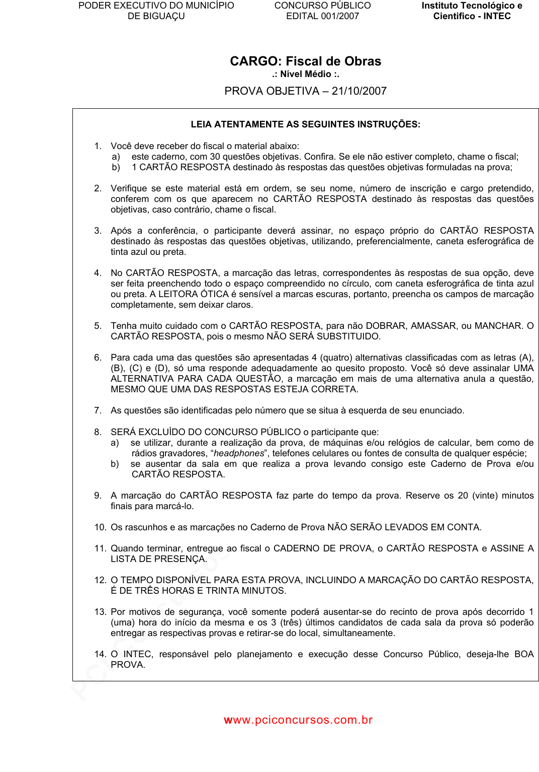 pcimarkpci MDAwMDowMDAwOjAwMDA6MDAwMDowMDAwOmZmZmY6MzZlOTpjMjU5:VGh1LCAxNiBTZXAgMjAyMSAwNDowMDo1NSAtMDMwMA== PODER EXECUTIVO DO MUNICÍPIO DE BIGUAÇU CONCURSO PÚBLICO EDITAL 001/2007 Instituto Tecnológico e Cientifico - INTEC CARGO: Fiscal de Obras .: Nível Médio :. PROVA OBJETIVA – 21/10/2007 LEIA ATENTAMENTE AS SEGUINTES INSTRUÇÕES: 1. Você deve receber do fiscal o material abaixo: a) este caderno, com 30 questões objetivas. Confira. Se ele não estiver completo, chame o fiscal; b) 1 CARTÃO RESPOSTA destinado às respostas das questões objetivas formuladas na prova; 2. Verifique se este material está em ordem, se seu nome, número de inscrição e cargo pretendido, conferem com os que aparecem no CARTÃO RESPOSTA destinado às respostas das questões objetivas, caso contrário, chame o fiscal. 3. Após a conferência, o participante deverá assinar, no espaço próprio do CARTÃO RESPOSTA destinado às respostas das questões objetivas, utilizando, preferencialmente, caneta esferográfica de tinta azul ou preta. 4. No CARTÃO RESPOSTA, a marcação das letras, correspondentes às respostas de sua opção, deve ser feita preenchendo todo o espaço compreendido no círculo, com caneta esferográfica de tinta azul ou preta. A LEITORA ÓTICA é sensível a marcas escuras, portanto, preencha os campos de marcação completamente, sem deixar claros. 5. Tenha muito cuidado com o CARTÃO RESPOSTA, para não DOBRAR, AMASSAR, ou MANCHAR. O CARTÃO RESPOSTA, pois o mesmo NÃO SERÁ SUBSTITUIDO. 6. Para cada uma das questões são apresentadas 4 (quatro) alternativas classificadas com as letras (A), (B), (C) e (D), só uma responde adequadamente ao quesito proposto. Você só deve assinalar UMA ALTERNATIVA PARA CADA QUESTÃO, a marcação em mais de uma alternativa anula a questão, MESMO QUE UMA DAS RESPOSTAS ESTEJA CORRETA. 7. As questões são identificadas pelo número que se situa à esquerda de seu enunciado. 8. SERÁ EXCLUÍDO DO CONCURSO PÚBLICO o participante que: a) se utilizar, durante a realização da prova, de máquinas e/ou relógios de calcular, bem como de rádios gravadores, “headphones”, telefones celulares ou fontes de consulta de qualquer espécie; b) se ausentar da sala em que realiza a prova levando consigo este Caderno de Prova e/ou CARTÃO RESPOSTA. 9. A marcação do CARTÃO RESPOSTA faz parte do tempo da prova. Reserve os 20 (vinte) minutos finais para marcá-lo. 10. Os rascunhos e as marcações no Caderno de Prova NÃO SERÃO LEVADOS EM CONTA. 11. Quando terminar, entregue ao fiscal o CADERNO DE PROVA, o CARTÃO RESPOSTA e ASSINE A LISTA DE PRESENÇA. 12. O TEMPO DISPONÍVEL PARA ESTA PROVA, INCLUINDO A MARCAÇÃO DO CARTÃO RESPOSTA, É DE TRÊS HORAS E TRINTA MINUTOS. 13. Por motivos de segurança, você somente poderá ausentar-se do recinto de prova após decorrido 1 (uma) hora do início da mesma e os 3 (três) últimos candidatos de cada sala da prova só poderão entregar as respectivas provas e retirar-se do local, simultaneamente. 14. O INTEC, responsável pelo planejamento e execução desse Concurso Público, deseja-lhe BOA PROVA. wwwwwwwww.pciconcursos.com.br pcimarkpci MDAwMDowMDAwOjAwMDA6MDAwMDowMDAwOmZmZmY6MzZlOTpjMjU5:VGh1LCAxNiBTZXAgMjAyMSAwNDowMDo1NSAtMDMwMA== Caderno de Provas Concurso Público Edital 001/2007 2 MODELO DO CARTÃO RESPOSTA Segundo o Edital 001/2007, item 9.3: O gabarito oficial das provas objetivas será afixado no mural da Prefeitura Municipal de Biguaçu (Praça Nereu Ramos, 90, Centro, Biguaçu/SC) e tornado disponível no site www.concursosintec.com.br, a partir das 12 (doze) horas do primeiro dia útil subseqüente à sua realização. wwwwwwwww.pciconcursos.com.br pcimarkpci MDAwMDowMDAwOjAwMDA6MDAwMDowMDAwOmZmZmY6MzZlOTpjMjU5:VGh1LCAxNiBTZXAgMjAyMSAwNDowMDo1NSAtMDMwMA== Caderno de Provas Concurso Público Edital 001/2007 CARGO: Fiscal de Obras 3 CONHECIMENTOS GERAIS (15 QUESTÕES) Leia o texto abaixo para responder às questões 1 e 2. Infância Meu pai montava a cavalo, ia para o campo. Minha mãe ficava sentada cosendo. Meu irmão pequeno dormia. Eu sozinho menino entre mangueiras lia a história de Robinson Crusoé Comprida história que não acaba mais. No meio-dia brando de luz uma voz que aprendeu a ninar nos longes da senzala – e nunca se esqueceu chamava para o café. Café preto que nem a preta velha café gostoso café bom Minha mãe ficava sentada cosendo olhando para mim. - Psiu .... Não acorde o menino. Para o berço onde pousou um mosquito. E dava um suspiro ... que fundo! Lá longe meu pai campeava no mato sem fim da fazenda. E eu não sabia que minha história era mais bonita que a de Robinson Crusoé. Carlos Drummond de Andrade 1. Assinale a alternativa correta: a) O menino compara a sua infância às histórias do aventureiro Robinson Crusoé. b) Enquanto a vida do menino transcorria entre mangueiras, a do aventureiro era pacata, não acabava mais. c) A infância do poeta caracteriza-se por momentos de monotonia e de aventura. d) Na época da infância, o poeta refugiava-se nas aventuras de Robinson Crusoé. 2. Assinale a alternativa correta: a) O poeta vale-se de apenas dois tempos verbais ordenados em relação ao momento da fala: pretérito perfeito e pretérito imperfeito. b) As lembranças da infância do menino são expressas por verbos, na sua maioria, conjugados no pretérito imperfeito do indicativo. c) Em “O pai ia para o campo, a mãe cosia e não permitia que ele fizesse barulho para não acordar o irmão pequeno” temos destacados um pronome relativo e uma forma verbal no pretérito perfeito do indicativo. d) Os fatos expressos no poema eram habituais, ocorriam todos os dias. 3. O plural dos substantivos compostos está correto em todas as alternativas, EXCETO: a) mestres-de-cerimônias b) abaixo-assinados c) pés-de-moleques d) guarda-roupas 4. Assinale a alternativa cujo termo destacado está INCORRETAMENTE analisado: a) Ele havia sido abandonado por todos os parentes. (