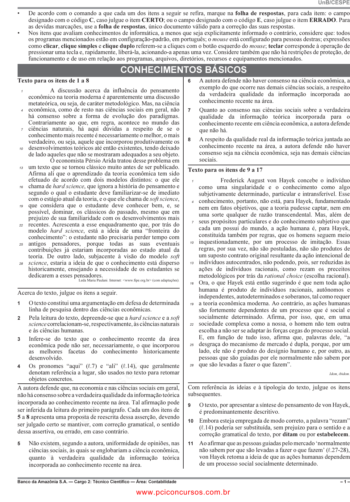 pcimarkpci MDAwMDowMDAwOjAwMDA6MDAwMDowMDAwOmZmZmY6MzZlOTpjMjU5:VGh1LCAxNiBTZXAgMjAyMSAxMzoyNzoyMiAtMDMwMA== UnB/CESPE Banco da Amazônia S.A. — Cargo 2: Técnico Científico — Área: Contabilidade – 1 – • De acordo com o comando a que cada um dos itens a seguir se refira, marque na folha de respostas, para cada item: o campo designado com o código C, caso julgue o item CERTO; ou o campo designado com o código E, caso julgue o item ERRADO. Para as devidas marcações, use a folha de respostas, único documento válido para a correção das suas respostas. • Nos itens que avaliam conhecimentos de informática, a menos que seja explicitamente informado o contrário, considere que: todos os programas mencionados estão em configuração-padrão, em português; o mouse está configurado para pessoas destras; expressões como clicar, clique simples e clique duplo referem-se a cliques com o botão esquerdo do mouse; teclar corresponde à operação de pressionar uma tecla e, rapidamente, liberá-la, acionando-a apenas uma vez. Considere também que não há restrições de proteção, de funcionamento e de uso em relação aos programas, arquivos, diretórios, recursos e equipamentos mencionados. CONHECIMENTOS BÁSICOS Texto para os itens de 1 a 8 A discussão acerca da influência do pensamento1 econômico na teoria moderna é aparentemente uma discussão metateórica, ou seja, de caráter metodológico. Mas, na ciência econômica, como de resto nas ciências sociais em geral, não4 há consenso sobre a forma de evolução dos paradigmas. Contrariamente ao que, em regra, acontece no mundo das ciências naturais, há aqui dúvidas a respeito de se o7 conhecimento mais recente é necessariamente o melhor, o mais verdadeiro, ou seja, aquele que incorporou produtivamente os desenvolvimentos teóricos até então existentes, tendo deixado10 de lado aqueles que não se mostraram adequados a seu objeto. O economista Pérsio Arida tratou desse problema em um texto que se tornou clássico muito antes de ser publicado.13 Afirma ali que o aprendizado da teoria econômica tem sido efetuado de acordo com dois modelos distintos: o que ele chama de hard science, que ignora a história do pensamento e16 segundo o qual o estudante deve familiarizar-se de imediato com o estágio atual da teoria, e o que ele chama de soft science, que considera que o estudante deve conhecer bem, e, se19 possível, dominar, os clássicos do passado, mesmo que em prejuízo de sua familiaridade com os desenvolvimentos mais recentes. Acrescenta a esse enquadramento que, por trás do22 modelo hard science, está a ideia de uma “fronteira do conhecimento”: o estudante não precisaria perder tempo com antigos pensadores, porque todas as suas eventuais25 contribuições já estariam incorporadas ao estado atual da teoria. De outro lado, subjacente à visão do modelo soft science, estaria a ideia de que o conhecimento está disperso28 historicamente, ensejando a necessidade de os estudantes se dedicarem a esses pensadores. Leda Maria Paulani. Internet: <www.fipe.org.br> (com adaptações). Acerca do texto, julgue os itens a seguir. 1 O texto constitui uma argumentação em defesa de determinada linha de pesquisa dentro das ciências econômicas. 2 Pela leitura do texto, depreende-se que a hard science e a soft science correlacionam-se, respectivamente, às ciências naturais e às ciências humanas. 3 Infere-se do texto que o conhecimento recente da área econômica pode não ser, necessariamente, o que incorporou as melhores facetas do conhecimento historicamente desenvolvido. 4 Os pronomes “aqui” (R.7) e “ali” (R.14), que geralmente denotam referência a lugar, são usados no texto para retomar objetos concretos. A autora defende que, na economia e nas ciências sociais em geral, não há consenso sobre a verdadeira qualidade da informação teórica incorporada ao conhecimento recente na área. Tal afirmação pode ser inferida da leitura do primeiro parágrafo. Cada um dos itens de 5 a 8 apresenta uma proposta de reescrita dessa asserção, devendo ser julgado certo se mantiver, com correção gramatical, o sentido dessa assertiva, ou errado, em caso contrário. 5 Não existem, segundo a autora, uniformidade de opiniões, nas ciências sociais, às quais se englobariam a ciência econômica, quanto à verdadeira qualidade da informação teórica incorporada ao conhecimento recente na área. 6 A autora defende não haver consenso na ciência econômica, a exemplo do que ocorre nas demais ciências sociais, a respeito da verdadeira qualidade da informação incorporada ao conhecimento recente na área. 7 Quanto ao consenso nas ciências sociais sobre a verdadeira qualidade da informação teórica incorporada para o conhecimento recente em ciência econômica, a autora defende que não há. 8 A respeito da qualidade real da informação teórica juntada ao conhecimento recente na área, a autora defende não haver consenso seja na ciência econômica, seja nas demais ciências sociais. Texto para os itens de 9 a 17 Frederick August von Hayek concebe o indivíduo1 como uma singularidade e o conhecimento como algo subjetivamente determinado, particular e intransferível. Esse conhecimento, portanto, não está, para Hayek, fundamentado4 nem em fatos objetivos, que a teoria pudesse captar, nem em uma sorte qualquer de razão transcendental. Mas, além de seus propósitos particulares e do conhecimento subjetivo que7 cada um possui do mundo, a ação humana é, para Hayek, constituída também por regras, que os homens seguem meio inquestionadamente, por um processo de imitação. Essas10 regras, por sua vez, não são postuladas, não são produtos de um suposto contrato original resultante da ação intencional de indivíduos autocentrados, não podendo, pois, ser reduzidas às13 ações de indivíduos racionais, como rezam os preceitos metodológicos por trás da rational choice (escolha racional). Ora, o q