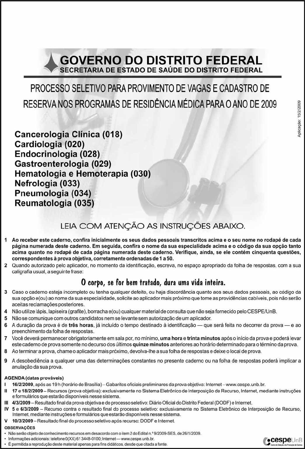 UnB/CESPE – SES/DF Prova 3 – opções: 018, 020, 028, 029, 030, 033, 034 e 035 – 1 – Nas questões de 1 a 50, marque, em cada uma, a única opção correta, de acordo com o respectivo comando. Para as devidas marcações, use a folha de respostas, único documento válido para a correção das suas provas. PROVA OBJETIVA Texto para questões de 1 a 4 Um homem de 52 anos de idade recorreu ao pronto- socorro de um hospital geral, queixando-se de intensa dor epigástrica com irradiação para a região dorsal e vômitos, que tiveram início cerca de 10 horas após o almoço. A avaliação clínica mostrou frequência cardíaca de 112 bpm, pressão arterial de 110 mmHg × 75 mmHg. Os exames cardiovascular e respiratório não apresentaram alterações. O exame do abdome mostrou ruídos hidroaéreos normais, moderada dor na região epigástrica, ausência de hepatoesplenomegalia, ausência dos sinais de Cullen, de Blumberg, de Jobert, de Giordano e de Torres Homem. A avaliação laboratorial mostrou 16.500 leucócitos/mm3, hematócrito de 48% no hemograma, amilase sérica = 1.520 unidades por litro (U/L) — valores de referência: 20-125 U/L —, lipase sérica = 2.800 U/L (valores de referência: 20-125 U/L), transaminase pirúvica = 180 U/L (valores de referência: 10-40 U/L) e desidrogenase láctica = 760 U/L (valores de referência: 100-190 U/L), cálcio sérico, albumina, triglicerídios, eletrólitos, ureia e creatinina dentro da normalidade. O eletrocardiograma convencional mostrou apenas taquicardia sinusal. QUESTÃO 1 A principal hipótese diagnóstica do paciente descrito no texto é o (a) A infarto do miocárdio. B apendicite aguda. C pancreatite aguda. D abscesso hepático. E câncer gástrico. QUESTÃO 2 Considerando a principal hipótese diagnóstica, as condições clínicas que representam fatores de risco para a doença em questão incluem I ingestão de álcool. II pâncreas divisum. III amebíase. IV uso crônico de azatioprina. V citomegalovirose. A quantidade de itens certos é igual a A 1. B 2. C 3. D 4. E 5. QUESTÃO 3 No quadro clínico descrito no texto, a ausência de peritonite pode ser clinicamente inferida, pois não está presente o sinal de A Jobert. B Cullen. C Giordano. D Torres Homem. E Blumberg. QUESTÃO 4 Tendo em conta o caso clínico descrito no texto, as potenciais complicações clínicas que podem ocorrer no paciente incluem o(a) I síndrome do desconforto respiratório do adulto. II insuficiência renal aguda. III ascite. IV diabetes melito permanente. V síndrome de resposta inflamatória sistêmica. A quantidade de itens certos é igual a A 1. B 2. C 3. D 4. E 5. QUESTÃO 5 Em uma consulta ambulatorial de clínica médica, verificou-se, durante o exame físico, em um paciente com 22 anos de idade, assintomático cardiovascular, a presença de discreto abaulamento e impulsão sistólica da região paraesternal esquerda baixa, ritmo cardíaco regular em 2 tempos, com hiperfonese e desdobramento amplo e fixo da segunda bulha cardíaca (que não varia com as manobras de Rivero-Carvallo e de Valsalva) no foco pulmonar, sopro sistólico ejetivo no segundo espaço intercostal esquerdo, sem irradiação, ausência de cliques e estalidos. O eletrocardiograma convencional e a radiografia de tórax mostraram, respectivamente, ritmo sinusal, eixo do QRS desviado para a direita, leve sobrecarga do ventrículo direito e bloqueio completo pelo ramo direito do feixe de His; as imagens radiológicas evidenciaram vasos pulmonares periféricos e centrais dilatados, aumento moderado da área cardíaca à custa das câmaras direitas e botão aórtico pequeno. Nesse caso clínico, a principal hipótese diagnóstica é de A hipertensão arterial pulmonar. B comunicação interatrial. C estenose na valva pulmonar, grave. D comunicação interventricular. E persistência do canal arterial. UnB/CESPE – SES/DF Prova 3 – opções: 018, 020, 028, 029, 030, 033, 034 e 035 – 2 – QUESTÃO 6 Com relação à hipercalcemia, julgue os itens a seguir. I Pode ser causada por hipoparatireodismo. II Associa-se ao desenvolvimento de diabete insípido nefrogênico. III Em pacientes com essa anormalidade, é possível observar encurtamento do intervalo QT, no eletrocardiograma. IV O espasmo laríngeo e o sinal de Trousseau são manifestações clínicas associadas a esse distúrbio. V O uso de beta-2 agonistas por via inalatória é útil no tratamento agudo dessa alteração eletrolítica, até que a causa primária seja controlada. Estão certos apenas os itens A I e II. B I e III. C II e III. D III e IV E IV e V. QUESTÃO 7 Acerca das pneumonias adquiridas na comunidade (PAC) em pacientes imunocompetentes, assinale a opção correta. A Têm como agentes etiológicos mais frequentes os germes atípicos e o Streptococcus pneumoniae. B Pacientes com idade inferior a 50 anos, sem comorbidades, com sinais vitais pouco alterados e sem distúrbios sensoriais devem ser tratados em regime de internação. C Naqueles pacientes com diagnóstico de PAC com relação entre pressão parcial de oxigênio no sangue arterial (PaO 2 ) e fração inspiratória de oxigênio (FiO 2 ) — PaO 2 /FiO 2 — menor do que 250 e acometimento de três lobos pulmonares podem ser conduzidos sob tratamento ambulatorial. D Em pacientes com PAC, e que tenham diagnóstico de doença pulmonar obstrutiva crônica e história do uso de antibióticos e(ou) corticosteroides nos últimos três meses, deve-se evitar o uso de fluoroquinolona respiratória, devido ao risco de agravamento da hipoxemia. E Nesse tipo de pneumonia, a acentuação do infiltrado radiológico nas primeiras 48 horas é forte indicativo de falha terapêutica, independentemente da evolução clínica. QUESTÃO 8 Um paciente de 24 anos de idade procurou o ambulatório de clínica médica devido a adinamia, febre baixa e manchas não- pruriginosas na pele. Na avaliação clínica, foram observadas pápulas eritematoacastanhadas lisas localiz