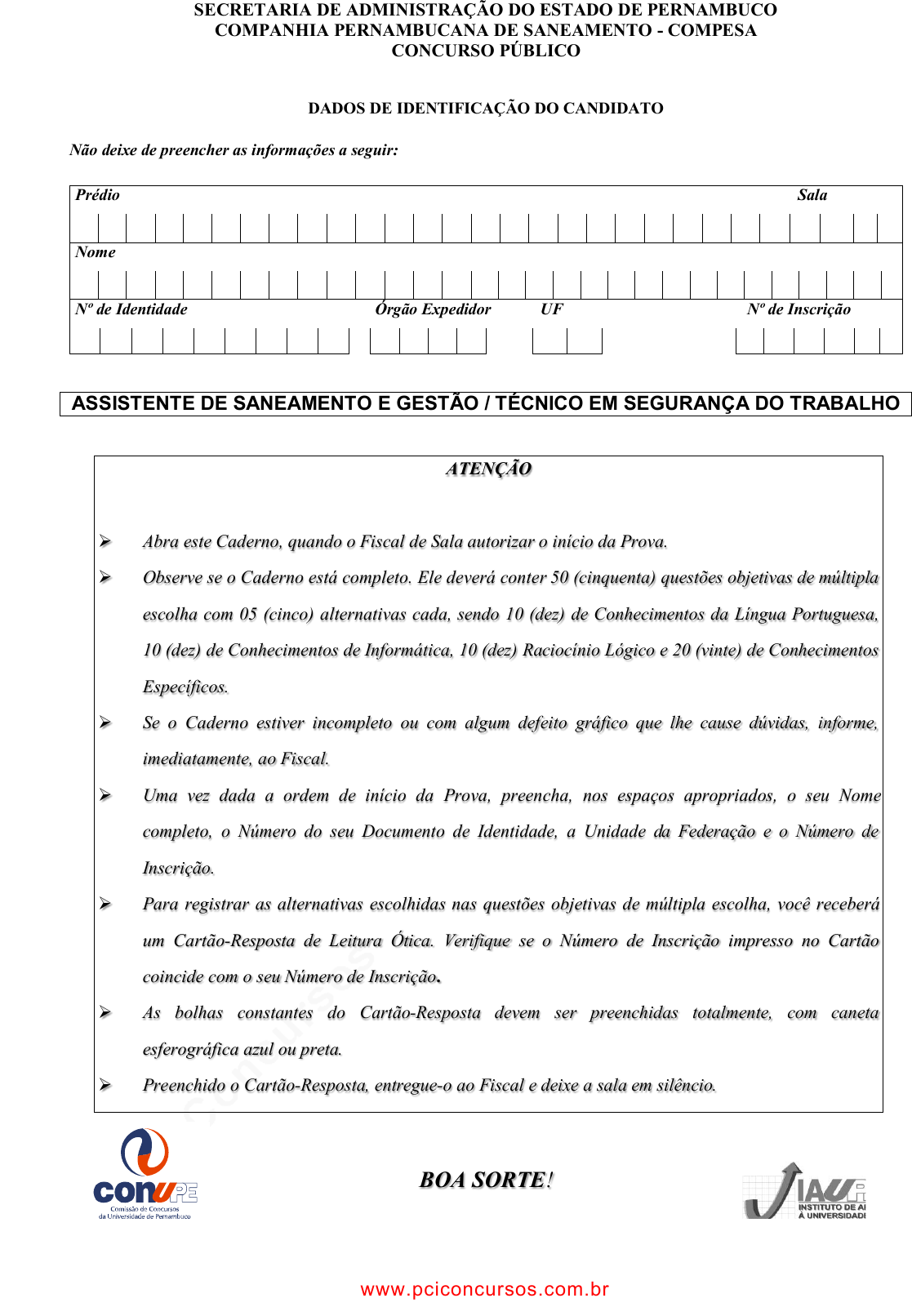 pcimarkpci MDAwMDowMDAwOjAwMDA6MDAwMDowMDAwOmZmZmY6MzZlOTpjMjU5:U2F0LCAxMSBTZXAgMjAyMSAxOTozOTozNyAtMDMwMA== SECRETARIA DE ADMINISTRAÇÃO DO ESTADO DE PERNAMBUCO COMPANHIA PERNAMBUCANA DE SANEAMENTO - COMPESA CONCURSO PÚBLICO DADOS DE IDENTIFICAÇÃO DO CANDIDATO Não deixe de preencher as informações a seguir: Prédio Sala Nome Nº de Identidade Órgão Expedidor UF Nº de Inscrição ASSISTENTE DE SANEAMENTO E GESTÃO / TÉCNICO EM SEGURANÇA DO TRABALHO ATENÇÃO Abra este Caderno, quando o Fiscal de Sala autorizar o início da Prova. Observe se o Caderno está completo. Ele deverá conter 50 (cinquenta) questões objetivas de múltipla escolha com 05 (cinco) alternativas cada, sendo 10 (dez) de Conhecimentos da Língua Portuguesa, 10 (dez) de Conhecimentos de Informática, 10 (dez) Raciocínio Lógico e 20 (vinte) de Conhecimentos Específicos. Se o Caderno estiver incompleto ou com algum defeito gráfico que lhe cause dúvidas, informe, imediatamente, ao Fiscal. Uma vez dada a ordem de início da Prova, preencha, nos espaços apropriados, o seu Nome completo, o Número do seu Documento de Identidade, a Unidade da Federação e o Número de Inscrição. Para registrar as alternativas escolhidas nas questões objetivas de múltipla escolha, você receberá um Cartão-Resposta de Leitura Ótica. Verifique se o Número de Inscrição impresso no Cartão coincide com o seu Número de Inscrição. As bolhas constantes do Cartão-Resposta devem ser preenchidas totalmente, com caneta esferográfica azul ou preta. Preenchido o Cartão-Resposta, entregue-o ao Fiscal e deixe a sala em silêncio. BOA SORTE! www.pciconcursos.com.br pcimarkpci MDAwMDowMDAwOjAwMDA6MDAwMDowMDAwOmZmZmY6MzZlOTpjMjU5:U2F0LCAxMSBTZXAgMjAyMSAxOTozOTozNyAtMDMwMA== 2 CONHECIMENTOS DA LÍNGUA PORTUGUESA TEXTO 01 para as questões de 01 a 03. ÁGUA (Kátia Silva) Sou cristalina e fresca, salgada e doce. Todos dependem de mim; Sou Vida. Existo nas nuvens em forma de gotas, e, quando caio, me chamam de chuva. Existo nos rios, nos lagos, nos mares, nas geleiras e até nos lençóis subterrâneos. Corro nos leitos e pulo de altas quedas; muitas vezes me chamam de cachoeira. Banho-te todos os dias e mato tua sede; alegro as plantas quando as rego, e balanço os barcos nos mares. Você acha que sou abundante, por isso me desperdiça. Você me polui, me maltrata; estou morrendo e você nem percebe, esquece. Estou ficando escassa, ontem fui muito abundante, amanhã serei motivo de guerras. Por isso, não me mate, não me maltrate e nem me jogue fora. Me salve, sou essencial a sua vida. Disponível em: http://www.r2cpress.com.br 01. Se o título do poema fosse substituído por “canais”, estaria CORRETO o trecho contido na alternativa A) Somos cristalinos e frescos, salgado e doce. B) Você acha que somos abundantes, por isso me desperdiça. C) Estamos ficando escassas, ontem fomos muito abundantes. D) Não nos maltrate e nem nos jogue fora. E) E, quando caio, nos chamam de chuva. 02. Em apenas uma das alternativas abaixo, a justificativa em relação ao emprego da vírgula está CORRETA. Assinale- a. A) “...e, quando caio, me chamam de chuva.” – as vírgulas isolam orações coordenadas. B) “Você me polui, me maltrata” – a vírgula se justifica por isolar a oração principal da subordinada. C) “Existo nos rios, nos lagos, nos mares”- as vírgulas separam elementos de mesma função sintática. D) “Você acha que sou abundante, por isso me desperdiça” – neste caso, a vírgula é facultativa. E) “Sou cristalina e fresca, salgada e doce” – a vírgula isola termos explicativos. 03. Sobre Regência Verbal, analise os itens abaixo: I. “Por isso, não me mate, não me maltrate e nem me jogue fora.” – todos os verbos deste trecho não pedem complemento. II. “Existo nos rios, nos lagos, nos mares, nas geleiras e até nos lençóis subterrâneos” – o verbo deste trecho exige complementos regidos de preposição. III. “Todos dependem de mim” – o verbo deste trecho exige complemento regido de preposição. IV. “Corro nos leitos e pulo de altas quedas” – ambos os verbos existentes neste trecho exigem complemento regido de preposição. V. “Banho-te todos os dias e mato tua sede” – neste trecho, ambos os verbos exigem complemento sem ser regido de preposição. Está CORRETO o que se afirma em A) III e V. B) III, IV e V. C) II, IV e V. D) I, II e IV. E) III e IV. www.pciconcursos.com.br pcimarkpci MDAwMDowMDAwOjAwMDA6MDAwMDowMDAwOmZmZmY6MzZlOTpjMjU5:U2F0LCAxMSBTZXAgMjAyMSAxOTozOTozNyAtMDMwMA== 3 TEXTO 02 para as questões de 04 a 07. No Dia Mundial da Água, fotos mostram disparidades no consumo O acesso à água potável ainda é um desafio diário para grande parte das populações do mundo. Apesar das inúmeras fontes naturais de água no mundo – rios e lagos, em geleiras e aquíferos, chuva e neve –, a quantidade de água que diferentes países conseguem extrair para fornecer a seus cidadãos varia bastante. Um estudo da FAO (Organização das Nações Unidas para a Agricultura e a Alimentação) identificou países onde a demanda por água excede a oferta natural do recurso. Segundo a organização, essas nações fazem maior pressão sobre as fontes de água doce. No topo da lista dos que mais utilizam o recurso, está a península árabe, onde a demanda por água doce excede em 500% a disponibilidade na região. Isso significa custos adicionais para que a água seja trazida de fora – por caminhões-pipa ou aquedutos ou por meio da dessalinização. De acordo com os dados da FAO, o norte da África é outra área sob pressão, em que a Líbia e o Egito particularmente são afetados. A região possui somente metade da água doce que os países consomem. Disponível em: http // novotempo.com/ecologia/2011. 04. Após a leitura do texto 02, conclui-se que A) a água potável é de largo alcance para quase todas as populações mundiais. B) existe um padrão determinado p