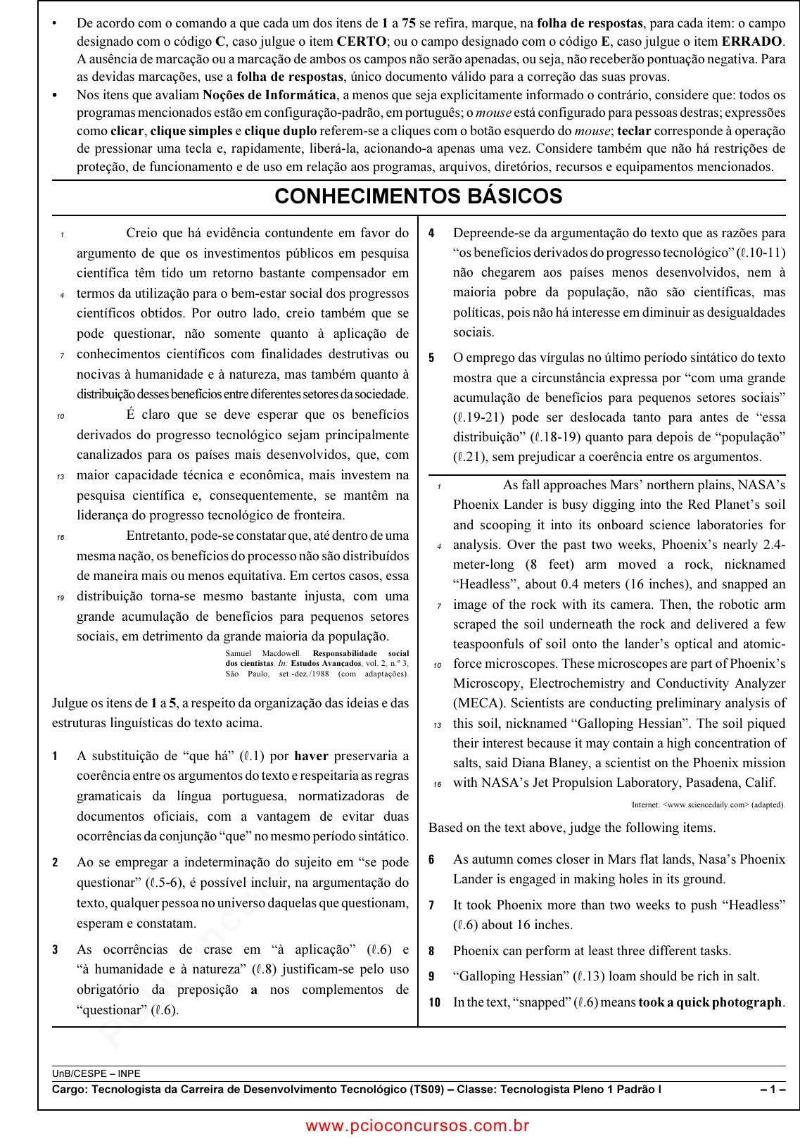 CARGO: TECNOLOGISTA DA CARREIRA DE DESENVOLVIMENTOTECNOLÓGICO (TS09) –