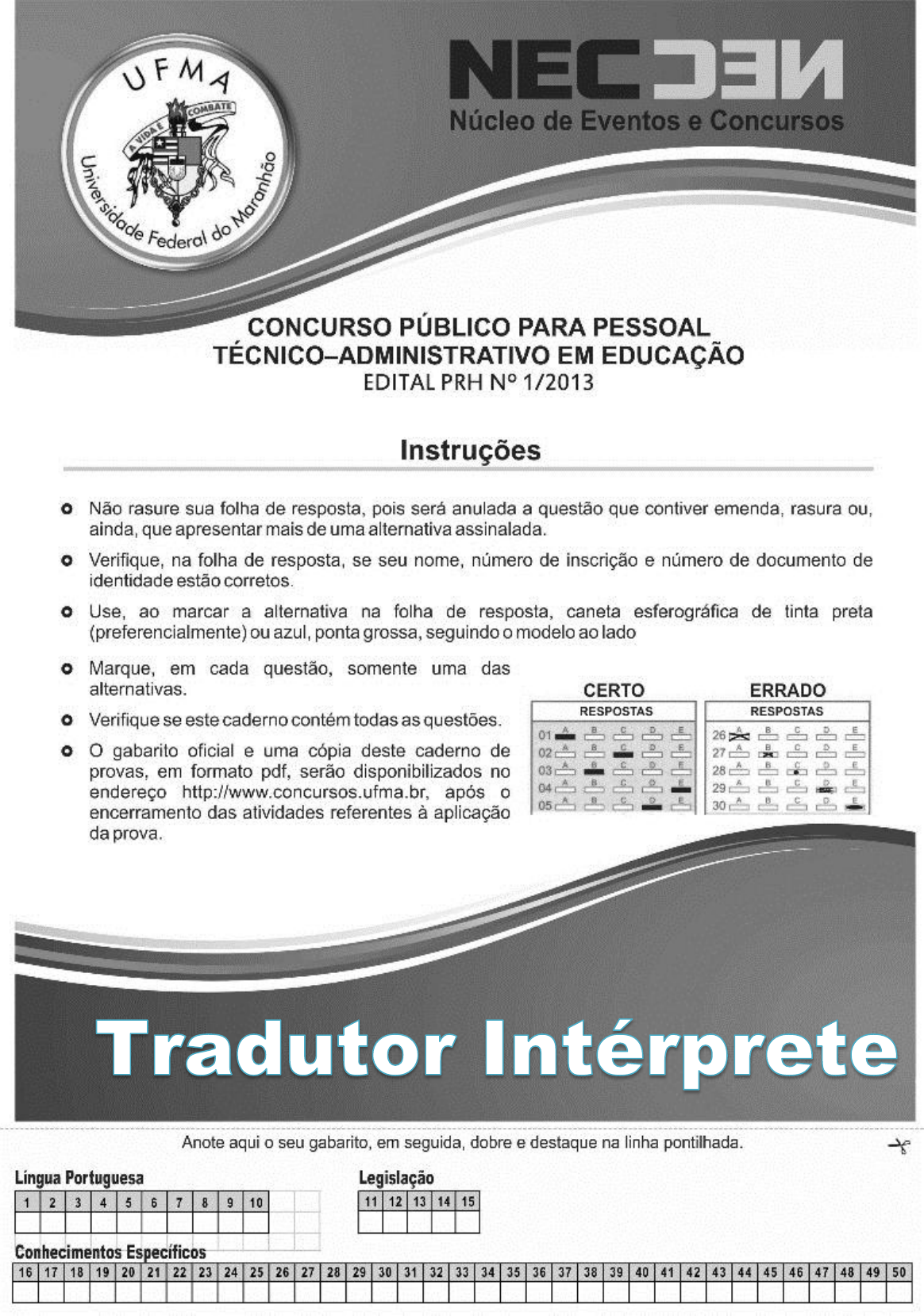 TRADUTOR INTÉRPRETE 1 www.pciconcursos.com.br TRADUTOR INTÉRPRETE 2 LÍNGUA PORTUGUESA 1 1 De acordo com esta charge, é correto afirmar: matutando.com a) O texto é uma crítica ao sistema de transportes do Oriente Médio. b) Os acidentes de trânsito no Brasil só se equiparam à Guerra do Iraque. c) Os problemas no trânsito brasileiro são tão graves quanto os horrores de uma guerra. d) Os personagens não entenderam a notícia que leram. e) Os problemas do trânsito no Brasil são irreparáveis. 2 A coesão e a coerência estão inteiramente adequadas em qual das opções? a) Após ser picado pelo mosquito, era onde o jogador deveria ter recorrido a um médico. b) Apesar de a Empresa responsável tratar da represa local, portanto a qualidade da água melhorou consideravelmente. c) O Atlético foi o time que fez a melhor campanha do Brasileirão em 2013. Deveria, no entanto, ser o campeão este ano. d) Antes de a imprensa tecer críticas severas sobre as medidas econômicas tomadas ultimamente pelo Governo, deveria procurar as razões que, por isso, as motivaram. e) O ministro apontou a necessidade de manterem os preços dos alimentos estáveis, pois receia que a inflação aumente. 3 É exemplo de texto narrativo: a) Texto é uma unidade de sentido produzida sempre para um fim. b) A água é uma substância química, composta de hidrogênio e oxigênio, essencial para todas as formas de vida da Terra. c) O prazer de ler resulta de motivações diárias e recorrentes, que aos poucos pode se tornar um gosto, uma opção. d) Sentado na beira da cama o Rei chorou suas duas últimas lágrimas, as que tinha guardado para maior tristeza. (Marina Colassanti. Uma ideia toda azul. 1979). e) Para manter a saúde e a qualidade de vida na terceira idade, é muito importante que o envelhecimento seja acompanhado por condições que levem ao bem-estar físico, mental, psicológico e emocional. (http://www.atituderimacomsaude.com.br) 4 Em: “Havia muita água naquele pote”, a palavra “muita” é: a) adjetivo b) pronome c) substantivo d) advérbio e) numeral 5 A oração que apresenta um complemento verbal igual ao da construção “Todos falavam de futebol” é: a) Ela saiu com duas amigas. b) Eles chamaram o juiz de impostor. c) Os democratas venceram as eleições. d) Eles irão aos jogos da Copa. e) As crianças acordaram tristes. 6 “Ele viu perdida a situação”. A palavra grifada é exemplo de: a) predicativo do objeto b) predicativo do sujeito c) adjunto adverbial d) objeto direto e) complemento nominal 7 Não há problema de concordância ou regência na alternativa: a) Fazem dois anos que os moradores daquele bairro foram despejados. b) As crianças pareciam gostarem da algazarra. c) Havia sempre atores que não se importavam em expor sua vida íntima. d) Haviam passageiros que não davam a mínima importância aos seus vizinhos, falando em voz alta ao celular. e) Vai sempre existir uma marca que não se pode confiar. 8 Qual parágrafo apresenta a pontuação correta? a) Pesquisa divulgada no final de 2009 pela Confederação Nacional de Transpores (CNT), sobre o estado de conservação das estradas revela, em forma de números assustadores uma realidade bastante conhecida dos motoristas: 69% das vias que cortam o País estão em péssimo, ruim ou regular estado de manutenção. b) Pesquisa divulgada no final de 2009 pela Confederação Nacional de Transpores (CNT) sobre o estado de conservação das estradas revela, em forma de números assustadores, uma realidade bastante conhecida dos motoristas: 69% das vias que cortam o País estão em péssimo, ruim ou regular estado de manutenção (Guia Cartoplam- Rodovias Brasil, editorial, 2011). c) Pesquisa divulgada no final de 2009 pela Confederação Nacional de Transpores (CNT) sobre o estado, de conservação das estradas www.pciconcursos.com.br http://www.atituderimacomsaude.com.br/ http://www.google.com.br/imgres?start=200&sa=X&espv=210&es_sm=93&biw=1241&bih=605&tbm=isch&tbnid=SdEYKZFxHR_clM:&imgrefurl=http://www.matutando.com/charge-liberdade-de-expressao-e-de-imprensa/&docid=S4_D-WG8Nhfe3M&imgurl=http://www.matutando.com/wp-content/uploads/2009/07/transito-brasil.jpg&w=450&h=266&ei=P4XWUp7gOoTXkQec0oHwCg&zoom=1&ved=0CFYQhBwwGzjIAQ TRADUTOR INTÉRPRETE 3 revela, em forma de números assustadores, uma realidade bastante conhecida dos motoristas: 69% das vias que cortam o País estão em péssimo, ruim ou regular estado de manutenção. d) Pesquisa divulgada no final de 2009 pela Confederação Nacional de Transpores (CNT) sobre o estado de conservação das estradas revela, em forma de números assustadores, uma realidade bastante conhecida dos motoristas: 69% das vias que cortam o País, estão em péssimo, ruim ou regular estado de manutenção. e) Pesquisa divulgada no final de 2009 pela Confederação Nacional de Transpores (CNT) sobre o estado de conservação das estradas revela em forma de números assustadores uma realidade bastante conhecida dos motoristas 69% das vias que, cortam o País estão em péssimo ruim ou regular, estado de manutenção. 9 Leia o poema abaixo e responda ao que se pede: Destino atroz Um poeta sofre três vezes: Primeiro quando ele os sente, depois quando os escreve e, por último, quando declamam seus versos. (Mário Quintana) Nesse texto, o verbo declamam, no último verso, tem sujeito: a) desinencial b) simples c) composto d) elíptico e) indeterminado 10 É exemplo de oração subordinada substantiva subjetiva: a) As pernas tremiam porque eles tinham temor. b) Peço que envies o documento urgente. c) Pessoa que mente não terá apoio. d) É necessário que compareças ao evento. e) Amparai os homens que sofrem. LEGISLAÇÃO 11 De acordo com a Lei nº 8.666/1993, constitui hipótese de inexigibilidade de licitação a) contratação de serviços de publicidade, desde que comprovada a notória especialização do contratado. b) contratação de profissional do setor artístico, desde que c