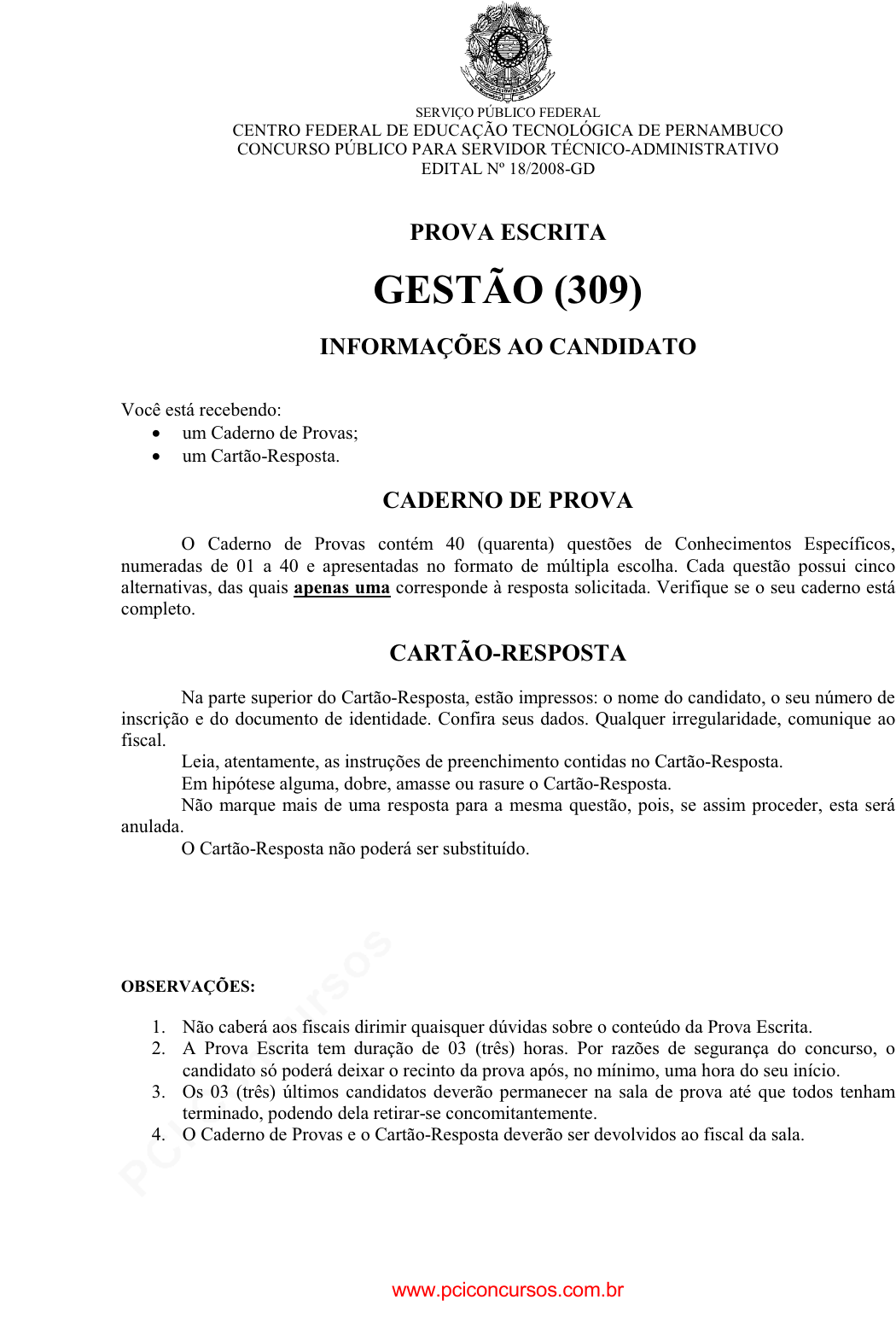 pcimarkpci MDAwMDowMDAwOjAwMDA6MDAwMDowMDAwOmZmZmY6MzZlOTpjMjU5:U3VuLCAxMiBTZXAgMjAyMSAxMDoxNjowOSAtMDMwMA== SERVIÇO PÚBLICO FEDERAL CENTRO FEDERAL DE EDUCAÇÃO TECNOLÓGICA DE PERNAMBUCO CONCURSO PÚBLICO PARA SERVIDOR TÉCNICO-ADMINISTRATIVO EDITAL Nº 18/2008-GD PROVA ESCRITA GESTÃO (309) INFORMAÇÕES AO CANDIDATO Você está recebendo: • um Caderno de Provas; • um Cartão-Resposta. CADERNO DE PROVA O Caderno de Provas contém 40 (quarenta) questões de Conhecimentos Específicos, numeradas de 01 a 40 e apresentadas no formato de múltipla escolha. Cada questão possui cinco alternativas, das quais apenas uma corresponde à resposta solicitada. Verifique se o seu caderno está completo. CARTÃO-RESPOSTA Na parte superior do Cartão-Resposta, estão impressos: o nome do candidato, o seu número de inscrição e do documento de identidade. Confira seus dados. Qualquer irregularidade, comunique ao fiscal. Leia, atentamente, as instruções de preenchimento contidas no Cartão-Resposta. Em hipótese alguma, dobre, amasse ou rasure o Cartão-Resposta. Não marque mais de uma resposta para a mesma questão, pois, se assim proceder, esta será anulada. O Cartão-Resposta não poderá ser substituído. OBSERVAÇÕES: 1. Não caberá aos fiscais dirimir quaisquer dúvidas sobre o conteúdo da Prova Escrita. 2. A Prova Escrita tem duração de 03 (três) horas. Por razões de segurança do concurso, o candidato só poderá deixar o recinto da prova após, no mínimo, uma hora do seu início. 3. Os 03 (três) últimos candidatos deverão permanecer na sala de prova até que todos tenham terminado, podendo dela retirar-se concomitantemente. 4. O Caderno de Provas e o Cartão-Resposta deverão ser devolvidos ao fiscal da sala. www.pciconcursos.com.br pcimarkpci MDAwMDowMDAwOjAwMDA6MDAwMDowMDAwOmZmZmY6MzZlOTpjMjU5:U3VuLCAxMiBTZXAgMjAyMSAxMDoxNjowOSAtMDMwMA== GESTÃO (309) 01. As atividades logísticas consideradas de apoio são aquelas adicionais, que dão suporte ao desempenho das atividades primárias. Assinale a alternativa correta no que se refere às atividades de apoio. a) Transporte, manutenção de estoques, processamento de dados, armazenagem, embalagem e suprimentos. b) Transporte, amazenagem, processamento de dados, planejamento, embalagem e suprimentos. c) Armazenagem, processamento de dados transporte, embalagem, suprimentos e planejamento. d) Armazenagem, manuseio de materiais, embalagem, suprimentos, planejamento e sistema de informação. e) Transporte, armazenagem, manuseio de materiais, embalagem, suprimentos, planejamento e sistema de informação. 02. A normatização de materiais consiste a) no processo de estabelecer normas e procedimentos sobre indicação da maneira correta de execução das tarefas, rotinas e trabalhos relacionados com as necessidades de itens materiais para a organização empresarial. b) em estabelecer definições nos requisitos globais sobre os procedimentos para uma correta execução das tarefas, rotinas e trabalhos relacionados com as necessidades de itens materiais para a organização como um todo. c) em padronizar processos através de normas e procedimentos sobre indicação da maneira correta de execução das tarefas, rotinas e trabalhos relacionados com as necessidades materiais para organização empresarial. d) no processo de padronização de materiais através de normas e procedimentos sobre indicação da maneira correta de execução das tarefas, rotinas e trabalhos relacionados com as necessidades empresariais. e) na padronização de materiais através de normas e procedimentos sobre indicação da maneira correta de execução das tarefas, rotinas e trabalhos relacionados com as necessidades de itens materiais para a organização empresarial. 03. A respeito dos diversos fatores que envolvem as estruturas de custos dos modais de transporte, considere as seguintes proposições: I. Ferroviário: alto custo fixo em equipamentos, terminais, vias férreas, etc. Custo variável baixo. II. Rodoviário: custo fixo baixo (rodovias estabelecidas e construídas com fundos públicos). Custo variável médio. III. Aquaviário: custo fixo médio (navios e equipamentos). Custo variável baixo (capacidade para transportar grande quantidade de tonelagem). IV. Dutoviário: custo fixo mais elevado (direito de acesso, construção, requisitos para controles das estações e capacidade de bombeamento). Custo variável alto (alto custo de manutenção com mão-de-obra). V. Aeroviário: custo fixo alto (aeronaves e manuseio e sistemas de cargas) Alto custo variável (combustível, mão-de- obra, manutenção, etc.). Estão corretas, apenas: a) IV e V. b) I, II, IV e V. c) I, II, III e V. d) I, II, III e IV. e) III, IV e V. 04. Analise as afirmativas abaixo, no que se refere à administração de materiais. I. A atividade de Cadastramento visa cadastrar os materiais necessários à manutenção e ao desenvolvimento da empresa, o que implica o reconhecimento perfeito de sua classificação, estabelecimento de codificação e determinação da especificação, objetivando a emissão de catálogo para utilização dos envolvidos nos procedimentos de Administração de Materiais. II. A atividade de Gestão visa ao gerenciamento dos estoques por meio de técnicas que não permitam manter o equilíbrio com o consumo, definindo parâmetros e níveis de ressuprimento e acompanhando sua evolução. III. A atividade de Compras tem, por finalidade, suprir as necessidades da empresa mediante a aquisição de materiais e/ou serviços, emanadas das solicitações dos usuários, objetivando identificar, no mercado, as melhores condições comerciais e técnicas. IV. A atividade de Recebimento visa garantir o rápido desembaraço dos materiais adquiridos pela empresa, zelando para que as saídas reflitam a quantidade estabelecida, na época certa, conforme o preço contratado e a quantidade especificada nas encomendas. V. A atividade de Almoxarifado visa garantir 