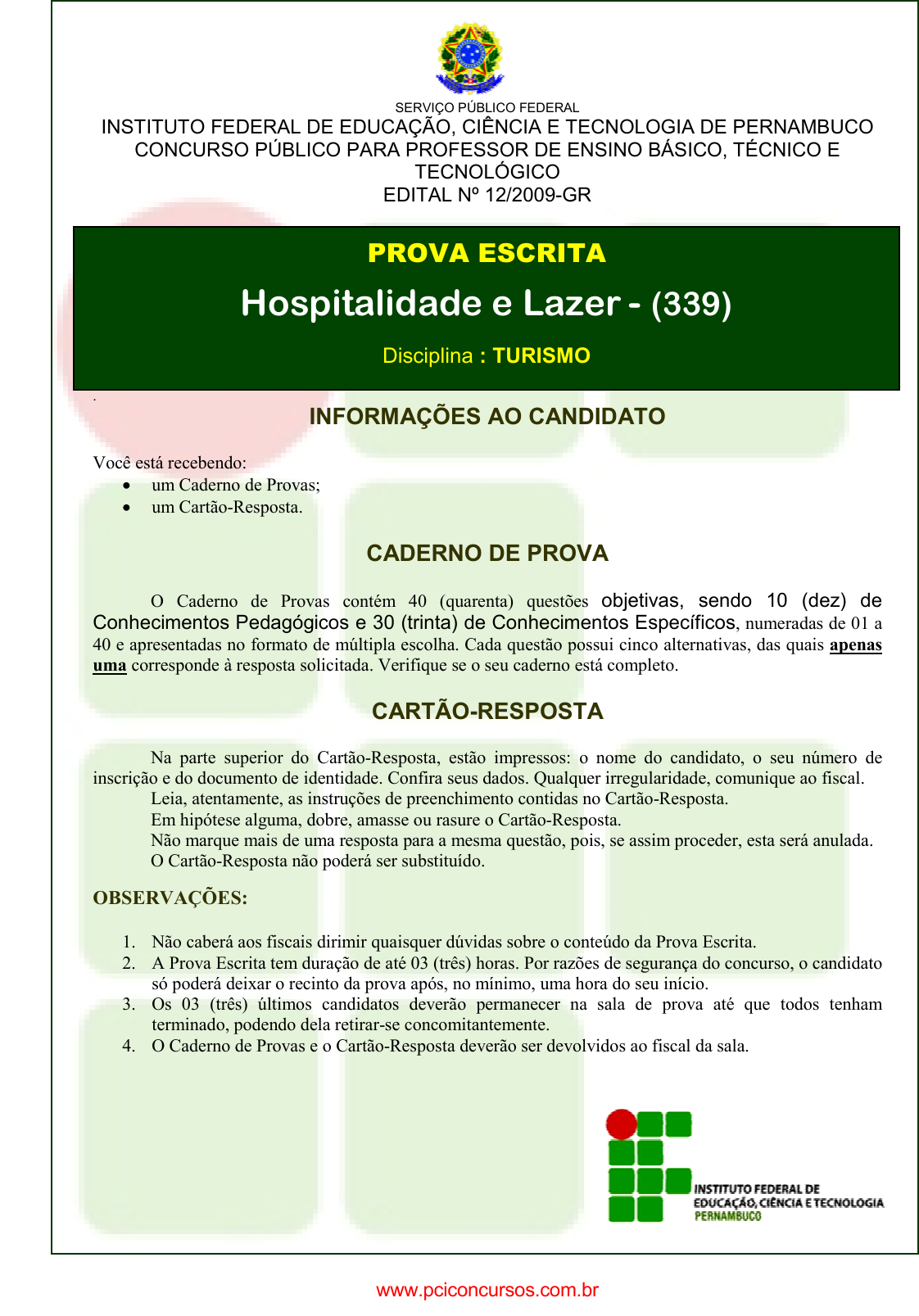pcimarkpci MDAwMDowMDAwOjAwMDA6MDAwMDowMDAwOmZmZmY6MzZlOTpjMjU5:U3VuLCAxMiBTZXAgMjAyMSAxMTo0MDoyNyAtMDMwMA== SERVIÇO PÚBLICO FEDERAL INSTITUTO FEDERAL DE EDUCAÇÃO, CIÊNCIA E TECNOLOGIA DE PERNAMBUCO CONCURSO PÚBLICO PARA PROFESSOR DE ENSINO BÁSICO, TÉCNICO E TECNOLÓGICO EDITAL Nº 12/2009-GR . INFORMAÇÕES AO CANDIDATO Você está recebendo: • um Caderno de Provas; • um Cartão-Resposta. CADERNO DE PROVA O Caderno de Provas contém 40 (quarenta) questões objetivas, sendo 10 (dez) de Conhecimentos Pedagógicos e 30 (trinta) de Conhecimentos Específicos, numeradas de 01 a 40 e apresentadas no formato de múltipla escolha. Cada questão possui cinco alternativas, das quais apenas uma corresponde à resposta solicitada. Verifique se o seu caderno está completo. CARTÃO-RESPOSTA Na parte superior do Cartão-Resposta, estão impressos: o nome do candidato, o seu número de inscrição e do documento de identidade. Confira seus dados. Qualquer irregularidade, comunique ao fiscal. Leia, atentamente, as instruções de preenchimento contidas no Cartão-Resposta. Em hipótese alguma, dobre, amasse ou rasure o Cartão-Resposta. Não marque mais de uma resposta para a mesma questão, pois, se assim proceder, esta será anulada. O Cartão-Resposta não poderá ser substituído. OBSERVAÇÕES: 1. Não caberá aos fiscais dirimir quaisquer dúvidas sobre o conteúdo da Prova Escrita. 2. A Prova Escrita tem duração de até 03 (três) horas. Por razões de segurança do concurso, o candidato só poderá deixar o recinto da prova após, no mínimo, uma hora do seu início. 3. Os 03 (três) últimos candidatos deverão permanecer na sala de prova até que todos tenham terminado, podendo dela retirar-se concomitantemente. 4. O Caderno de Provas e o Cartão-Resposta deverão ser devolvidos ao fiscal da sala. PROVA ESCRITA Hospitalidade e Lazer - (339) Disciplina : TURISMO www.pciconcursos.com.br pcimarkpci MDAwMDowMDAwOjAwMDA6MDAwMDowMDAwOmZmZmY6MzZlOTpjMjU5:U3VuLCAxMiBTZXAgMjAyMSAxMTo0MDoyNyAtMDMwMA== CONHECIMENTO PEDAGÓGICO 1. “A Pedagogia Renovada agrupa correntes que advogam a renovação escolar, apoiando-se à Pedagogia Tradicional”(LIBÂNEO, 2005). É característica desse movimento: a) Ação de agentes externos na formação discente. b) Predomínio da palavra do professor. c) Transmissão do saber constituído. d) Valorização do objeto de conhecimento. e) Valorização da criança dotada de liberdade, iniciativa e interesses próprios. 2. As tendências pedagógicas originam-se de movimentos sociais e filosóficos, num dado momento histórico, e acabam por propiciar a união das práticas didático-pedagógicas com os desejos e aspirações da sociedade de forma a favorecer o conhecimento, sem, contudo, querer ser uma verdade única e absoluta. Seu conhecimento se reveste de especial importância para o professor que deseja construir sua prática. Em relação às diversas tendências pedagógicas, relacione a primeira coluna com a segunda. (1) Escola Tradicional (2) Escola Nova (3) Escola Libertadora (4) Escola Crítica-Social (5) Escola Dualista ( ) ( ) ( ) ( ) ( ) A escola é vista como instrumento de reprodução das condições sociais impostas pela organização capitalista. É mais valorizado o processo de aprendizagem e não diretamente o ensino. O ensino consiste no confronto entre os conhecimentos sistematizados com as experiências sócio-culturais e a vida concreta dos alunos. O trabalho escolar não se assenta, prioritariamente, nos conteúdos de ensino já sistematizados, ocorrem discussões e ações práticas sobre aspectos da realidade social imediata. Transmissão da cultura geral, formação do raciocínio, treino da mente e da vontade. A seqüência CORRETA de números, de cima para baixo, é: a) 3, 1, 5, 2, 4 b) 5, 2, 4, 3, 1 c) 3, 1, 4, 2, 5 d) 3, 5, 2, 4, 1 e) 4, 3, 2, 1, 5 3. Considerando que os diferentes tipos de relação existentes entre as disciplinas permitem adotar determinadas terminologias, a Interdisciplinaridade pode ser conceituada como: a) A confrontação de disciplinas que fazem emergir novos dados que se articulam entre si, oferecendo uma nova visão da realidade. b) A interação de duas ou mais disciplinas com transferências de informações entre elas, podendo originar um novo campo de conhecimento. c) A intercomunicação entre as disciplinas, tratando efetivamente de um tema/objetivo comum. d) A justaposição das disciplinas de forma somativa, de modo a acumular os conteúdos curriculares. e) A organização de conteúdos escolares em matérias independentes, sem vinculação de conhecimento. 4. “Currículo é um termo muitas vezes utilizado para se referir aos programas de conteúdos de cada disciplina” (Parâmetros Curriculares Nacionais). Currículo significa também a) discussões e elaborações de conteúdo. b) diversos contextos da Pedagogia. c) expressão de princípios e metas do projeto educativo. d) flexibilidade de conteúdos propostos. e) organização da matéria a ser estudada. 5. Segundo Vasconcelos, um dos pontos de maior ênfase para os professores, em escolas com problemas de gestão, é a falta de uma linha comum de atuação. Isso ocorre devido à ausência de um: a) Conselho escolar b) Compromisso da escola c) Planejamento estratégico d) Planejamento participativo e) Projeto político pedagógico www.pciconcursos.com.br pcimarkpci MDAwMDowMDAwOjAwMDA6MDAwMDowMDAwOmZmZmY6MzZlOTpjMjU5:U3VuLCAxMiBTZXAgMjAyMSAxMTo0MDoyNyAtMDMwMA== 6. Assinale a alternativa que apresenta os elementos caracterizadores da avaliação escolar, numa perspectiva diagnóstica. a) Ferramenta de mensuração quantitativa e registro da trajetória escolar. b) Instrumento disciplinador de condutas cognitivas e sociais no contexto da escola. c) Instrumento de reconhecimento dos progressos e dificuldades e que auxilia nas decisões em relação às atividades didáticas. d) Mecanismo de controle e registro do aproveitamento escolar d