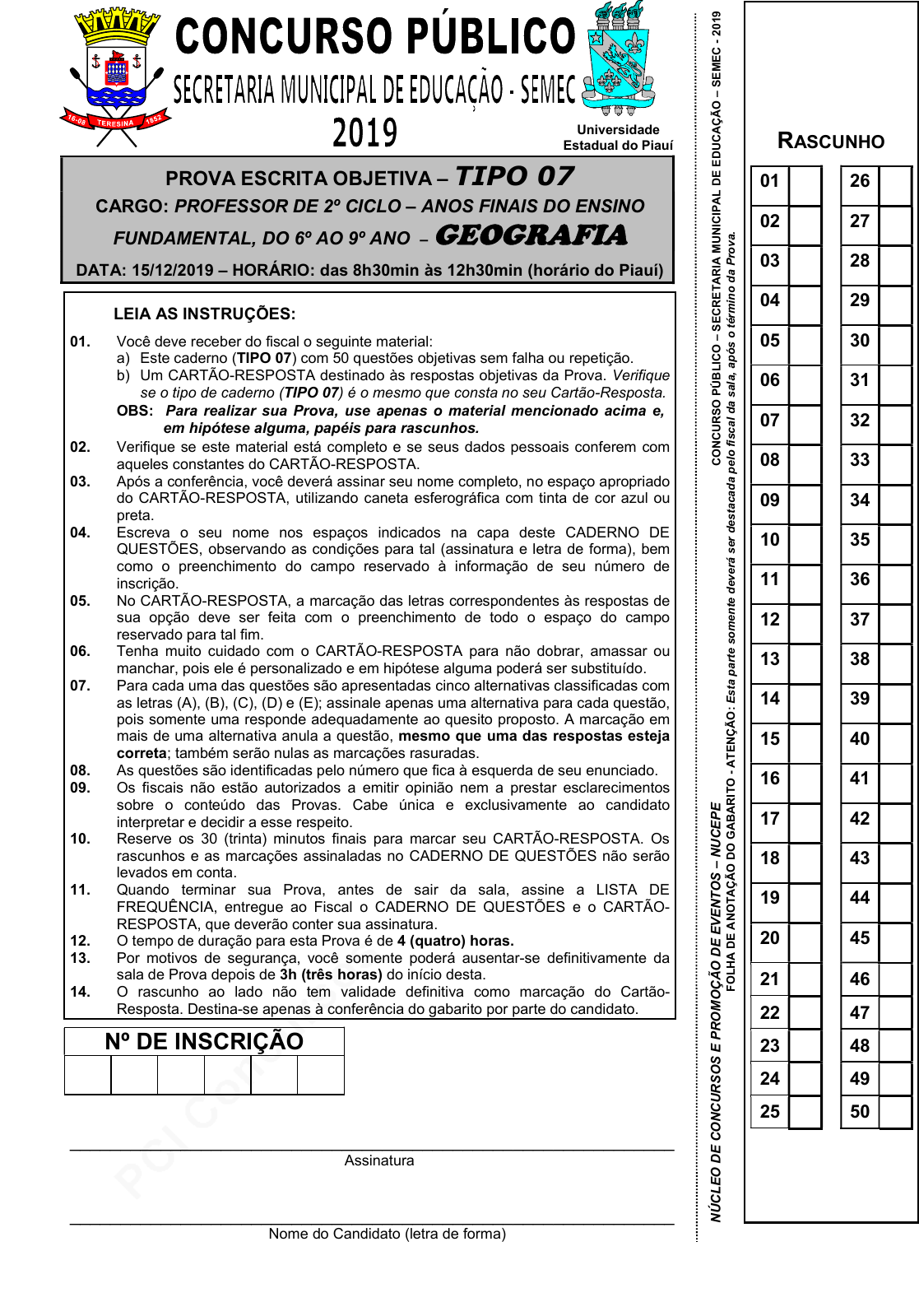 pcimarkpci MDAwMDowMDAwOjAwMDA6MDAwMDowMDAwOmZmZmY6MzZlOTpjMjU5:U3VuLCAxMiBTZXAgMjAyMSAxMzowOTowOSAtMDMwMA== PROVA ESCRITA OBJETIVA – TIPO 07 CARGO: PROFESSOR DE 2º CICLO – ANOS FINAIS DO ENSINO FUNDAMENTAL, DO 6º AO 9º ANO – GEOGRAFIA DATA: 15/12/2019 – HORÁRIO: das 8h30min às 12h30min (horário do Piauí) LEIA AS INSTRUÇÕES: 01. Você deve receber do fiscal o seguinte material: a) Este caderno (TIPO 07) com 50 questões objetivas sem falha ou repetição. b) Um CARTÃO-RESPOSTA destinado às respostas objetivas da Prova. Verifique se o tipo de caderno (TIPO 07) é o mesmo que consta no seu Cartão-Resposta. OBS: Para realizar sua Prova, use apenas o material mencionado acima e, em hipótese alguma, papéis para rascunhos. 02. Verifique se este material está completo e se seus dados pessoais conferem com aqueles constantes do CARTÃO-RESPOSTA. 03. Após a conferência, você deverá assinar seu nome completo, no espaço apropriado do CARTÃO-RESPOSTA, utilizando caneta esferográfica com tinta de cor azul ou preta. 04. Escreva o seu nome nos espaços indicados na capa deste CADERNO DE QUESTÕES, observando as condições para tal (assinatura e letra de forma), bem como o preenchimento do campo reservado à informação de seu número de inscrição. 05. No CARTÃO-RESPOSTA, a marcação das letras correspondentes às respostas de sua opção deve ser feita com o preenchimento de todo o espaço do campo reservado para tal fim. 06. Tenha muito cuidado com o CARTÃO-RESPOSTA para não dobrar, amassar ou manchar, pois ele é personalizado e em hipótese alguma poderá ser substituído. 07. Para cada uma das questões são apresentadas cinco alternativas classificadas com as letras (A), (B), (C), (D) e (E); assinale apenas uma alternativa para cada questão, pois somente uma responde adequadamente ao quesito proposto. A marcação em mais de uma alternativa anula a questão, mesmo que uma das respostas esteja correta; também serão nulas as marcações rasuradas. 08. As questões são identificadas pelo número que fica à esquerda de seu enunciado. 09. Os fiscais não estão autorizados a emitir opinião nem a prestar esclarecimentos sobre o conteúdo das Provas. Cabe única e exclusivamente ao candidato interpretar e decidir a esse respeito. 10. Reserve os 30 (trinta) minutos finais para marcar seu CARTÃO-RESPOSTA. Os rascunhos e as marcações assinaladas no CADERNO DE QUESTÕES não serão levados em conta. 11. Quando terminar sua Prova, antes de sair da sala, assine a LISTA DE FREQUÊNCIA, entregue ao Fiscal o CADERNO DE QUESTÕES e o CARTÃO- RESPOSTA, que deverão conter sua assinatura. 12. O tempo de duração para esta Prova é de 4 (quatro) horas. 13. Por motivos de segurança, você somente poderá ausentar-se definitivamente da sala de Prova depois de 3h (três horas) do início desta. 14. O rascunho ao lado não tem validade definitiva como marcação do Cartão- Resposta. Destina-se apenas à conferência do gabarito por parte do candidato. Nº DE INSCRIÇÃO ____________________________________________________________ Assinatura ____________________________________________________________ Nome do Candidato (letra de forma) Universidade Estadual do Piauí RASCUNHO 01 26 02 27 03 28 04 29 05 30 06 31 07 32 08 33 09 34 10 35 11 36 12 37 13 38 14 39 15 40 16 41 17 42 18 43 19 44 20 45 21 46 22 47 23 48 24 49 25 50 N Ú C L E O D E C O N C U R S O S E P R O M O Ç Ã O D E E V E N T O S – N U C E P E C O N C U R S O P Ú B L IC O – S E C R E T A R IA M U N IC IP A L D E E D U C A Ç Ã O – S E M E C - 2 0 1 9 F O L H A D E A N O T A Ç Ã O D O G A B A R IT O - A T E N Ç Ã O : E s ta p ar te s o m e n te d e ve rá s er d e st ac a d a p el o f is c a l d a s al a, a p ó s o t ér m in o d a P ro v a. pcimarkpci MDAwMDowMDAwOjAwMDA6MDAwMDowMDAwOmZmZmY6MzZlOTpjMjU5:U3VuLCAxMiBTZXAgMjAyMSAxMzowOTowOSAtMDMwMA== CONCURSO PÚBLICO – SECRETARIA MUNICIPAL DE EDUCAÇÃO - SEMEC – 2019 2 N º D E I N S C R I Ç Ã O C O N C U R SO P Ú B L IC O – S E C R E T A R IA M U N IC IP A L D E E D U C A Ç Ã O - S E M E C – 2 01 9 pcimarkpci MDAwMDowMDAwOjAwMDA6MDAwMDowMDAwOmZmZmY6MzZlOTpjMjU5:U3VuLCAxMiBTZXAgMjAyMSAxMzowOTowOSAtMDMwMA== CONCURSO PÚBLICO – SECRETARIA MUNICIPAL DE EDUCAÇÃO - SEMEC – 2019 3 GEOGRAFIA 01. Se nos situarmos do ponto de vista da evolução histórica dos instrumentos de trabalho, em um enfoque vertical, constataremos que a natureza do espaço social tem mudado. Se preferirmos um enfoque horizontal, isto é, dentro de cada espaço, encontraremos uma distribuição irregular de modelos mais avançados dos instrumentos de trabalho, mas também a coabitação de modelos antigos e modernos e em muito raros lugares há a homogeneidade de instrumentos de trabalho de acordo com, ou do ponto de vista de sua “idade”. Os lugares, então, se diferenciam: de um lado, pelo grau de modernização dos recursos; de outro lado, pela forma com que se combinam as diferentes modalidades de recursos. SANTOS, M. Por uma geografia nova: da crítica da Geografia a uma Geografia Crítica. São Paulo: Edusp, 2004. Tendo por base a abordagem teórica sobre o espaço geográfico, deve-se entender que a) o espaço é constituído a partir da produção de próteses, de acordo com cada momento histórico específico e, após cada momento de construção, funciona como receptáculo inerte das relações sociais vigentes. b) o espaço geográfico é constituído ao longo da história, a partir das funcionalidades por ele demandadas em dado momento histórico e social, formando um complexo de tempos e processos desiguais acumulados. c) a organização do espaço geográfico se dá a partir do trabalho atual, que se desenha levando em conta o trabalho preexistente materializado em formas espaciais pretéritas, através das quais as funções espaciais se perpetuam. d) a produção do espaço ocorre na combinação do trabalho preexistente, materializado em for