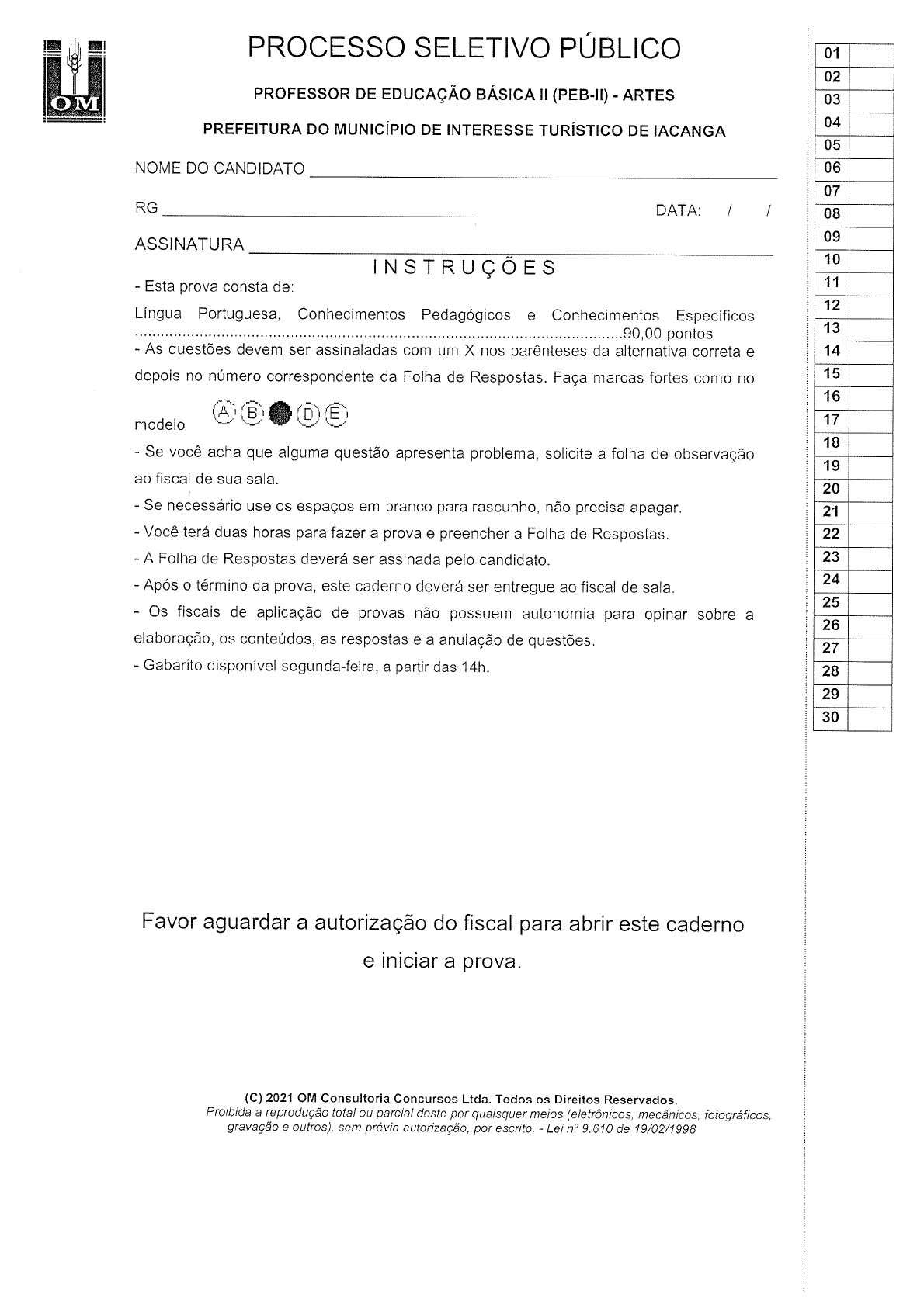 pcimarkpci MDAwMDowMDAwOjAwMDA6MDAwMDowMDAwOmZmZmY6MzZlOTpjMjU5:U3VuLCAxMiBTZXAgMjAyMSAxNzowNTozMCAtMDMwMA== pcimarkpci MDAwMDowMDAwOjAwMDA6MDAwMDowMDAwOmZmZmY6MzZlOTpjMjU5:U3VuLCAxMiBTZXAgMjAyMSAxNzowNTozMCAtMDMwMA== pcimarkpci MDAwMDowMDAwOjAwMDA6MDAwMDowMDAwOmZmZmY6MzZlOTpjMjU5:U3VuLCAxMiBTZXAgMjAyMSAxNzowNTozMCAtMDMwMA== pcimarkpci MDAwMDowMDAwOjAwMDA6MDAwMDowMDAwOmZmZmY6MzZlOTpjMjU5:U3VuLCAxMiBTZXAgMjAyMSAxNzowNTozMCAtMDMwMA== pcimarkpci MDAwMDowMDAwOjAwMDA6MDAwMDowMDAwOmZmZmY6MzZlOTpjMjU5:U3VuLCAxMiBTZXAgMjAyMSAxNzowNTozMCAtMDMwMA== pcimarkpci MDAwMDowMDAwOjAwMDA6MDAwMDowMDAwOmZmZmY6MzZlOTpjMjU5:U3VuLCAxMiBTZXAgMjAyMSAxNzowNToyNiAtMDMwMA== PREFEITURA DO MUNICÍPIO DE INTERESSE TURÍSTICO DE IACANGA EDITAL DE PROCESSO SELETIVO PÚBLICO N.º 01/2020 DATA DE REALIZAÇÃO DAS PROVAS: ......... 24 de janeiro de 2021 LOCAL: .............................................................. EMEF JOAQUIM CALDAS DE SOUZA G A B A R I T O S PARTE COMUM PROFESSOR DE EDUCAÇÃO BÁSICA I (PEB-I) PROFESSOR DE EDUCAÇÃO BÁSICA INFANTIL (PEB I) LÍNGUA PORTUGUESA, MATEMÁTICA E ATUALIDADES Questão A B C D 01 02 03 04 05 06 07 08 09 10 11 12 13 14 15 16 17 18 19 20 pcimarkpci MDAwMDowMDAwOjAwMDA6MDAwMDowMDAwOmZmZmY6MzZlOTpjMjU5:U3VuLCAxMiBTZXAgMjAyMSAxNzowNToyNiAtMDMwMA== PREFEITURA DO MUNICÍPIO DE INTERESSE TURÍSTICO DE IACANGA EDITAL DE PROCESSO SELETIVO PÚBLICO N.º 01/2020 PARTE ESPECÍFICA PROFESSOR DE EDUCAÇÃO BÁSICA I (PEB-I) CONHECIMENTOS ESPECÍFICOS Questão A B C D 21 22 23 24 25 26 27 28 29 30 1. a prova de Professor de Educação Básica I (PEB-I) constou de: - 30 (trinta) questões de Língua Portuguesa, Matemática e Conhecimentos Específicos valendo 3,00 (três) pontos cada uma; 2. valor total da prova: 90,0 (noventa) pontos. pcimarkpci MDAwMDowMDAwOjAwMDA6MDAwMDowMDAwOmZmZmY6MzZlOTpjMjU5:U3VuLCAxMiBTZXAgMjAyMSAxNzowNToyNiAtMDMwMA== PREFEITURA DO MUNICÍPIO DE INTERESSE TURÍSTICO DE IACANGA EDITAL DE PROCESSO SELETIVO PÚBLICO N.º 01/2020 PARTE ESPECÍFICA PROFESSOR DE EDUCAÇÃO BÁSICA INFANTIL (PEB I) CONHECIMENTOS ESPECÍFICOS Questão A B C D 21 22 23 24 25 26 27 28 29 30 1. a prova de Professor de Educação Básica Infantil (PEB-I) constou de: - 30 (trinta) questões de Língua Portuguesa, Matemática e Conhecimentos Específicos valendo 3,00 (três) pontos cada uma; 2. valor total da prova: 90,0 (noventa) pontos. pcimarkpci MDAwMDowMDAwOjAwMDA6MDAwMDowMDAwOmZmZmY6MzZlOTpjMjU5:U3VuLCAxMiBTZXAgMjAyMSAxNzowNToyNiAtMDMwMA== PREFEITURA DO MUNICÍPIO DE INTERESSE TURÍSTICO DE IACANGA EDITAL DE PROCESSO SELETIVO PÚBLICO N.º 01/2020 PARTE COMUM PROFESSOR DE EDUCAÇÃO BÁSICA II (PEB-II) - ARTES PROFESSOR DE EDUCAÇÃO BÁSICA II (PEB-II) - CIÊNCIAS PROFESSOR DE EDUCAÇÃO BÁSICA II (PEB-II) - EDUCAÇÃO FÍSICA PROFESSOR DE EDUCAÇÃO BÁSICA II (PEB-II) - GEOGRAFIA PROFESSOR DE EDUCAÇÃO BÁSICA II (PEB-II) - HISTÓRIA PROFESSOR DE EDUCAÇÃO BÁSICA II (PEB-II) - INGLÊS PROFESSOR DE EDUCAÇÃO BÁSICA II (PEB-II) - LÍNGUA PORTUGUESA PROFESSOR DE EDUCAÇÃO BÁSICA II (PEB-II) - MATEMÁTICA PROFESSOR DE ATENDIMENTO EDUCACIONAL ESPECIALIZADO (PAEE) LÍNGUA PORTUGUESA, CONHECIMENTOS PEDAGÓGICOS Questão A B C D 01 02 03 04 05 06 07 08 09 10 11 12 13 14 15 pcimarkpci MDAwMDowMDAwOjAwMDA6MDAwMDowMDAwOmZmZmY6MzZlOTpjMjU5:U3VuLCAxMiBTZXAgMjAyMSAxNzowNToyNiAtMDMwMA== PREFEITURA DO MUNICÍPIO DE INTERESSE TURÍSTICO DE IACANGA EDITAL DE PROCESSO SELETIVO PÚBLICO N.º 01/2020 PARTE ESPECÍFICA PROFESSOR DE EDUCAÇÃO BÁSICA II (PEB-II) - ARTES CONHECIMENTOS ESPECÍFICOS Questão A B C D 16 17 18 19 20 21 22 23 24 25 26 27 28 29 30 1. a prova de Professor de Educação Básica Il (PEB-II) - Artes constou de: - 30 (trinta) questões de Língua Portuguesa, Conhecimentos Pedagógicos e Conhecimentos Específicos valendo 3,00 (três) pontos cada uma; 2. valor total da prova: 90,0 (noventa) pontos. pcimarkpci MDAwMDowMDAwOjAwMDA6MDAwMDowMDAwOmZmZmY6MzZlOTpjMjU5:U3VuLCAxMiBTZXAgMjAyMSAxNzowNToyNiAtMDMwMA== PREFEITURA DO MUNICÍPIO DE INTERESSE TURÍSTICO DE IACANGA EDITAL DE PROCESSO SELETIVO PÚBLICO N.º 01/2020 PARTE ESPECÍFICA PROFESSOR DE EDUCAÇÃO BÁSICA II (PEB-II) - CIÊNCIAS CONHECIMENTOS ESPECÍFICOS Questão A B C D 16 17 18 19 20 21 22 23 24 25 26 27 28 29 30 1. a prova de Professor de Educação Básica Il (PEB-II) - Ciências constou de: - 30 (trinta) questões de Língua Portuguesa, Conhecimentos Pedagógicos e Conhecimentos Específicos valendo 3,00 (três) pontos cada uma; 2. valor total da prova: 90,0 (noventa) pontos. pcimarkpci MDAwMDowMDAwOjAwMDA6MDAwMDowMDAwOmZmZmY6MzZlOTpjMjU5:U3VuLCAxMiBTZXAgMjAyMSAxNzowNToyNiAtMDMwMA== PREFEITURA DO MUNICÍPIO DE INTERESSE TURÍSTICO DE IACANGA EDITAL DE PROCESSO SELETIVO PÚBLICO N.º 01/2020 PARTE ESPECÍFICA PROFESSOR DE EDUCAÇÃO BÁSICA II (PEB-II) - EDUCAÇÃO FÍSICA CONHECIMENTOS ESPECÍFICOS Questão A B C D 16 17 18 19 20 21 22 23 24 25 26 27 28 29 30 1. a prova de Professor de Educação Básica Il (PEB-II) - Educação Física constou de: - 30 (trinta) questões de Língua Portuguesa, Conhecimentos Pedagógicos e Conhecimentos Específicos valendo 3,00 (três) pontos cada uma; 2. valor total da prova: 90,0 (noventa) pontos. pcimarkpci MDAwMDowMDAwOjAwMDA6MDAwMDowMDAwOmZmZmY6MzZlOTpjMjU5:U3VuLCAxMiBTZXAgMjAyMSAxNzowNToyNiAtMDMwMA== PREFEITURA DO MUNICÍPIO DE INTERESSE TURÍSTICO DE IACANGA EDITAL DE PROCESSO SELETIVO PÚBLICO N.º 01/2020 PARTE ESPECÍFICA PROFESSOR DE EDUCAÇÃO BÁSICA II (PEB-II) - GEOGRAFIA CONHECIMENTOS ESPECÍFICOS Questão A B C D 16 17 18 19 20 21 22 23 24 25 26 27 28 29 30 1. a prova de Professor de Educação Básica Il (PEB-II) - Geografia constou de: - 30 (trinta) questões de Língua Portuguesa, Conhecimentos Pedagógicos e Conhecimentos Específicos valendo 3,00 (três) pontos cada uma; 2. valor total da prova: 90,0 (noventa) pontos. pcimarkpci MDAwMDowMDAwOjAwMDA6MDAwMDowMDAwOmZmZmY6MzZlOTpjMjU5:U3VuLCAxMiBTZXAgMjAyMSAxNzowNToyNiAtMDMwMA== PREFEITURA DO MUNICÍPIO DE INTER