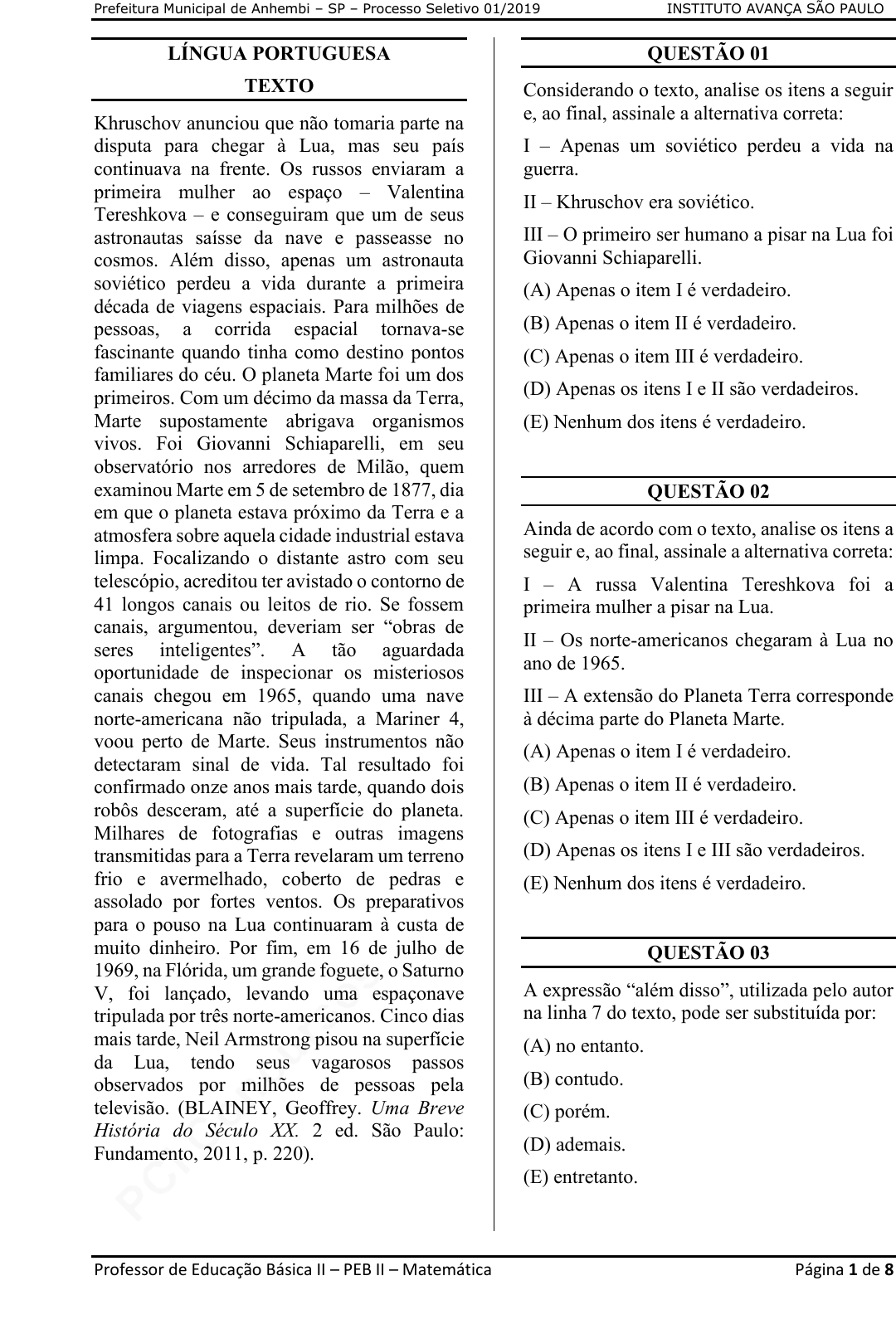 Prefeitura Municipal de Anhembi – SP – Processo Seletivo 01/2019 INSTITUTO AVANÇA SÃO PAULO