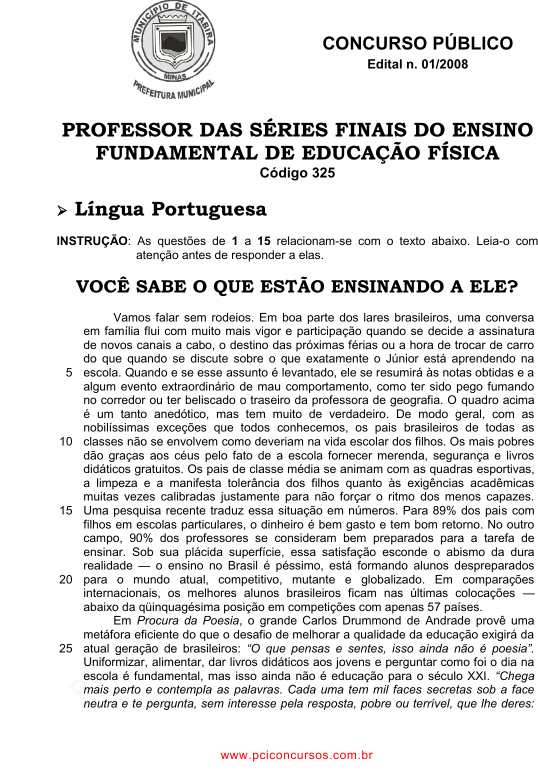 pcimarkpci MDAwMDowMDAwOjAwMDA6MDAwMDowMDAwOmZmZmY6MzZlOTpjMjU5:U3VuLCAxMiBTZXAgMjAyMSAxODo0OTo0NiAtMDMwMA== CONCURSO PÚBLICO Edital n. 01/2008 PROFESSOR DAS SÉRIES FINAIS DO ENSINO FUNDAMENTAL DE EDUCAÇÃO FÍSICA Código 325 Língua Portuguesa INSTRUÇÃO: As questões de 1 a 15 relacionam-se com o texto abaixo. Leia-o com atenção antes de responder a elas. VOCÊ SABE O QUE ESTÃO ENSINANDO A ELE? 5 10 15 20 25 Vamos falar sem rodeios. Em boa parte dos lares brasileiros, uma conversa em família flui com muito mais vigor e participação quando se decide a assinatura de novos canais a cabo, o destino das próximas férias ou a hora de trocar de carro do que quando se discute sobre o que exatamente o Júnior está aprendendo na escola. Quando e se esse assunto é levantado, ele se resumirá às notas obtidas e a algum evento extraordinário de mau comportamento, como ter sido pego fumando no corredor ou ter beliscado o traseiro da professora de geografia. O quadro acima é um tanto anedótico, mas tem muito de verdadeiro. De modo geral, com as nobilíssimas exceções que todos conhecemos, os pais brasileiros de todas as classes não se envolvem como deveriam na vida escolar dos filhos. Os mais pobres dão graças aos céus pelo fato de a escola fornecer merenda, segurança e livros didáticos gratuitos. Os pais de classe média se animam com as quadras esportivas, a limpeza e a manifesta tolerância dos filhos quanto às exigências acadêmicas muitas vezes calibradas justamente para não forçar o ritmo dos menos capazes. Uma pesquisa recente traduz essa situação em números. Para 89% dos pais com filhos em escolas particulares, o dinheiro é bem gasto e tem bom retorno. No outro campo, 90% dos professores se consideram bem preparados para a tarefa de ensinar. Sob sua plácida superfície, essa satisfação esconde o abismo da dura realidade o ensino no Brasil é péssimo, está formando alunos despreparados para o mundo atual, competitivo, mutante e globalizado. Em comparações internacionais, os melhores alunos brasileiros ficam nas últimas colocações abaixo da qüinquagésima posição em competições com apenas 57 países. Em Procura da Poesia, o grande Carlos Drummond de Andrade provê uma metáfora eficiente do que o desafio de melhorar a qualidade da educação exigirá da atual geração de brasileiros: Uniformizar, alimentar, dar livros didáticos aos jovens e perguntar como foi o dia na escola é fundamental, mas isso ainda não é educação para o século XXI. mais perto e contempla as palavras. Cada uma tem mil faces secretas sob a face neutra e te pergunta, sem interesse pela resposta, pobre ou terrível, que lhe deres: www.pciconcursos.com.br pcimarkpci MDAwMDowMDAwOjAwMDA6MDAwMDowMDAwOmZmZmY6MzZlOTpjMjU5:U3VuLCAxMiBTZXAgMjAyMSAxODo0OTo0NiAtMDMwMA== 2 30 35 40 45 , continua nosso maior poeta, morto em 1987. Outra metáfora exata. Os jovens estudantes são como as palavras, com mil faces secretas sob a face neutra e esperando as chaves que lhes abram os portais de uma vida pessoal e profissional plena. Isso só se conseguirá quando o otimismo com o desempenho do sistema, que é também compartilhado pelos alunos, for transformado em radical inconformismo. A fagulha de mudança pode ser acendida com a constatação de que as escolas que pais, alunos e professores tanto elogiam são as mesmas que devolvem à sociedade jovens incapazes de ler e entender um texto, que se embaralham com as ordens de grandeza e confiam cegamente em suas calculadoras digitais para não apenas fazer contas mas substituir o pensamento lógico. Mais uma vez abusa-se do recurso da generalização para que o mérito individual de alguns poucos não dilua a constatação de que o complexo educacional brasileiro é medíocre e não se enxerga como tal. Quando um conselho de notáveis americanos fez a célebre condenação americanos estava plenamente satisfeita com suas escolas. A comissão viu mais longe e soou o alarme. Agora no Brasil o mesmo senso de realidade e urgência se faz necessário, como resume Cláudio de Moura Castro, ensaísta, pesquisador e VEJA, 20 ago. 2008. p. 74. (Texto adaptado) Questão 1 A alternativa que NÃO contém uma afirmativa condizente com o texto é A) A escola se adapta, muitas vezes, ao aluno, para não forçá-lo nem exigir muito dele. B) Os pais em geral estão pouco engajados e se satisfazem com aspectos periféricos à educação. C) Falta autocrítica ao sistema educacional brasileiro. D) Os jovens têm responsabilidade direta pelas mazelas da educação. Questão 2 A alternativa que contém o provérbio popular que melhor retrata a visão que o texto apresenta da educação brasileira é A) O pior cego é o que não quer ver. B) Pau que nasce torto morre torto. C) Quem desdenha quer comprar. D) Quem espera sempre alcança. Questão 3 ticulares, o dinheiro é bem gasto e tem bom retorno. No outro campo, 90% dos professores se consideram bem preparados para a 15-18) www.pciconcursos.com.br pcimarkpci MDAwMDowMDAwOjAwMDA6MDAwMDowMDAwOmZmZmY6MzZlOTpjMjU5:U3VuLCAxMiBTZXAgMjAyMSAxODo0OTo0NiAtMDMwMA== 3 Em relação aos dados apresentados pela pesquisa, o texto tem uma posição A) ambígua. B) cética. C) otimista. D) ufanista. Questão 4 Em relação às melhorias na educação, a metáfora utilizada por Carlos Drummond de Andrade pode ser associada de forma direta à necessidade de A) atitudes, soluções. B) debates, reflexões. C) interação entre pais, alunos e professores. D) destinação de vultosos recursos materiais. Questão 5 [...] ( parece ter sido concebido pelo pior inimigo dos Estados Unidos ... ), [...] (linhas 44- 45) As aspas utilizadas no trecho entre parênteses se justificam por A) destacar o trecho chamando a atenção para a relevância do conteúdo. B) se tratar de uma transcrição. C) tecer um comentário desabonador para a educação americana. D) revelar, com certa ironia, uma opinião oposta à do autor. Questão 6 scolas qu
