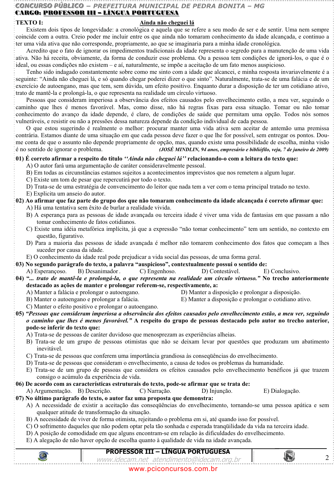 pcimarkpci MDAwMDowMDAwOjAwMDA6MDAwMDowMDAwOmZmZmY6MzZlOTpjMjU5:TW9uLCAxMyBTZXAgMjAyMSAwMjoxMDo1OSAtMDMwMA== CCCOOONNNCCCUUURRRSSSOOO PPPÚÚÚBBBLLLIIICCCOOO � PREFEITURA MUNICIPAL DE PEDRA BONITA – MG PROFESSOR III – LÍNGUA PORTUGUESA www.idecam.net atendimento@idecam.org.br 2 CCCAAARRRGGGOOO::: PROFESSOR III – LÍNGUA PORTUGUESAPPRROOFFEESSSSOORR IIIIII –– LLÍÍNNGGUUAA PPOORRTTUUGGUUEESSAA TEXTO I: Ainda não cheguei lá Existem dois tipos de longevidade: a cronológica e aquela que se refere a seu modo de ser e de sentir. Uma nem sempre coincide com a outra. Creio poder me incluir entre os que ainda não tomaram conhecimento da idade alcançada, e continuo a ter uma vida ativa que não corresponde, propriamente, ao que se imaginaria para a minha idade cronológica. Acredito que o fato de ignorar os impedimentos tradicionais da idade representa o segredo para a manutenção de uma vida ativa. Não há receita, obviamente, da forma de conduzir esse problema. Ou a pessoa tem condições de ignorá-los, o que é o ideal, ou essas condições não existem – e aí, naturalmente, se impõe a aceitação de um fato menos auspicioso. Tenho sido indagado constantemente sobre como me sinto com a idade que alcancei, e minha resposta invariavelmente é a seguinte: “Ainda não cheguei lá, e só quando chegar poderei dizer o que sinto”. Naturalmente, trata-se de uma falácia e de um exercício de autoengano, mas que tem, sem dúvida, um efeito positivo. Enquanto durar a disposição de ter um cotidiano ativo, trato de mantê-la e prolongá-la, o que representa na realidade um círculo virtuoso. Pessoas que consideram imperiosa a observância dos efeitos causados pelo envelhecimento estão, a meu ver, seguindo o caminho que lhes é menos favorável. Mas, como disse, não há regras fixas para essa situação. Tomar ou não tomar conhecimento do avanço da idade depende, é claro, de condições de saúde que permitam uma opção. Todos nós somos vulneráveis, e resistir ou não a pressões dessa natureza depende da condição individual de cada pessoa. O que estou sugerindo é realmente o melhor: procurar manter uma vida ativa sem aceitar de antemão uma premissa contrária. Estamos diante de uma situação em que cada pessoa deve fazer o que lhe for possível, sem entregar os pontos. Dou- me conta de que o assunto não depende propriamente de opção, mas, quando existe uma possibilidade de escolha, minha visão é no sentido de ignorar o problema. (JOSÉ MINDLIN, 94 anos, empresário e bibliófilo, veja, 7 de janeiro de 2009) 01) É correto afirmar a respeito do título ‘‘Ainda não cheguei lá’’ relacionando-o com a leitura do texto que: A) O autor fará uma argumentação de caráter consideravelmente pessoal. B) Em todas as circunstâncias estamos sujeitos a acontecimentos imprevistos que nos remetem a algum lugar. C) Existe um tom de pesar que repercutirá por todo o texto. D) Trata-se de uma estratégia de convencimento do leitor que nada tem a ver com o tema principal tratado no texto. E) Explicita um anseio do autor. 02) Ao afirmar que faz parte do grupo dos que não tomaram conhecimento da idade alcançada é correto afirmar que: A) Há uma tentativa sem êxito de burlar a realidade vivida. B) A esperança para as pessoas de idade avançada ou terceira idade é viver uma vida de fantasias em que passam a não tomar conhecimento de fatos cotidianos. C) Existe uma idéia metafórica implícita, já que a expressão “não tomar conhecimento” tem um sentido, no contexto em questão, figurativo. D) Para a maioria das pessoas de idade avançada é melhor não tomarem conhecimento dos fatos que começam a lhes suceder por causa da idade. E) O conhecimento da idade real pode prejudicar a vida social das pessoas, de uma forma geral. 03) No segundo parágrafo do texto, a palavra “auspicioso”, contextualmente possui o sentido de: A) Esperançoso. B) Desanimador . C) Engenhoso. D) Contestável. E) Conclusivo. 04) “... trato de mantê-la e prolongá-la, o que representa na realidade um círculo virtuoso.” No trecho anteriormente destacado as ações de manter e prolongar referem-se, respectivamente, a: A) Manter a falácia e prolongar o autoengano. D) Manter a disposição e prolongar a disposição. B) Manter o autoengano e prolongar a falácia. E) Manter a disposição e prolongar o cotidiano ativo. C) Manter o efeito positivo e prolongar o autoengano. 05) “Pessoas que consideram imperiosa a observância dos efeitos causados pelo envelhecimento estão, a meu ver, seguindo o caminho que lhes é menos favorável.” A respeito do grupo de pessoas destacado pelo autor no trecho anterior, pode-se inferir do texto que: A) Trata-se de pessoas de caráter duvidoso que menosprezam as experiências alheias. B) Trata-se de um grupo de pessoas otimistas que não se deixam levar por questões que produzam um abatimento inevitável. C) Trata-se de pessoas que conferem uma importância grandiosa às conseqüências do envelhecimento. D) Trata-se de pessoas que consideram o envelhecimento, a causa de todos os problemas da humanidade. E) Trata-se de um grupo de pessoas que considera os efeitos causados pelo envelhecimento benéficos já que trazem consigo o acúmulo da experiência de vida. 06) De acordo com as características estruturais do texto, pode-se afirmar que se trata de: A) Argumentação. B) Descrição. C) Narração. D) Injunção. E) Dialogação. 07) No último parágrafo do texto, o autor faz uma proposta que demonstra: A) A necessidade de existir a aceitação das conseqüências do envelhecimento, tornando-se uma pessoa apática e sem qualquer atitude de transformação da situação. B) A necessidade de viver de forma otimista, rejeitando o problema em si, até quando isso for possível. C) O sofrimento daqueles que não podem optar pela tão sonhada e esperada tranqüilidade da vida na terceira idade. D) A posição de comodidade em que alguns encontr