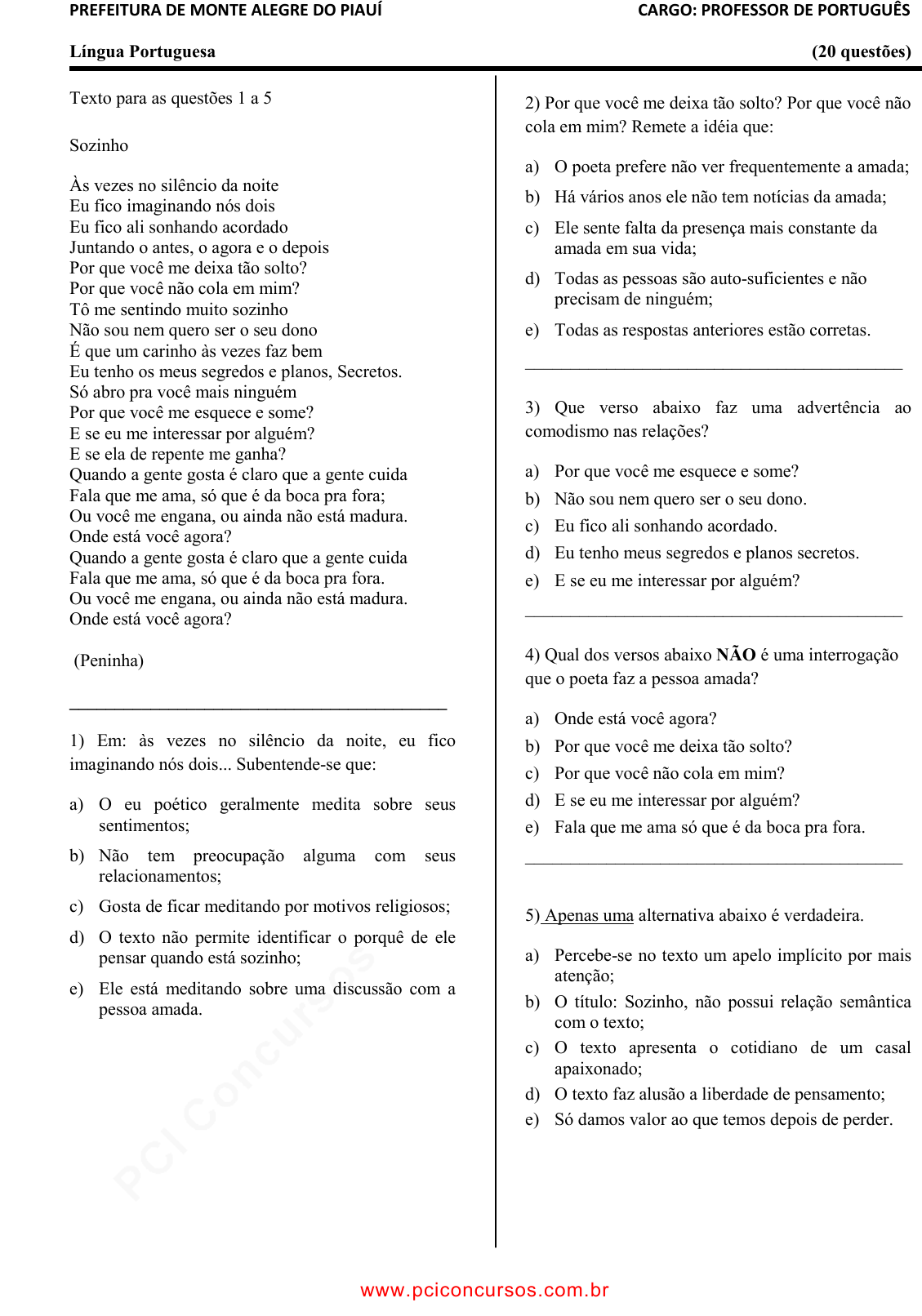 pcimarkpci MDAwMDowMDAwOjAwMDA6MDAwMDowMDAwOmZmZmY6MzZlOTpjMjU5:TW9uLCAxMyBTZXAgMjAyMSAwNDoxMzo0MiAtMDMwMA== PREFEITURA DE MONTE ALEGRE DO PIAUÍ CARGO: PROFESSOR DE PORTUGUÊS Língua Portuguesa Texto para as questões 1 a 5 Sozinho Às vezes no silêncio da noite Eu fico imaginando nós dois Eu fico ali sonhando acordado Juntando o antes, o agora e o depois Por que você me deixa tão solto? Por que você não cola em mim? Tô me sentindo muito sozinho Não sou nem quero ser o seu dono É que um carinho às vezes faz bem Eu tenho os meus segredos e planos, Secretos. Só abro pra você mais ninguém Por que você me esquece e some? E se eu me interessar por alguém? E se ela de repente me ganha? Quando a gente gosta é claro que a gente cuida Fala que me ama, só que é da boca pra fora; Ou você me engana, ou ainda não está madura. Onde está você agora? Quando a gente gosta é claro que a gente cuida Fala que me ama, só que é da boca pra fora. Ou você me engana, ou ainda não está madura. Onde está você agora? (Peninha) __________________________________________ 1) Em: às vezes no silêncio da noite, eu fico imaginando nós dois... Subentende-se que: a) O eu poético geralmente medita sobre seus sentimentos; b) Não tem preocupação alguma com seus relacionamentos; c) Gosta de ficar meditando por motivos religiosos; d) O texto não permite identificar o porquê de ele pensar quando está sozinho; e) Ele está meditando sobre uma discussão com a pessoa amada. (20 questões) 2) Por que você me deixa tão solto? Por que você não cola em mim? Remete a idéia que: a) O poeta prefere não ver frequentemente a amada; b) Há vários anos ele não tem notícias da amada; c) Ele sente falta da presença mais constante da amada em sua vida; d) Todas as pessoas são auto-suficientes e não precisam de ninguém; e) Todas as respostas anteriores estão corretas. __________________________________________ 3) Que verso abaixo faz uma advertência ao comodismo nas relações? a) Por que você me esquece e some? b) Não sou nem quero ser o seu dono. c) Eu fico ali sonhando acordado. d) Eu tenho meus segredos e planos secretos. e) E se eu me interessar por alguém? __________________________________________ 4) Qual dos versos abaixo NÃO é uma interrogação que o poeta faz a pessoa amada? a) Onde está você agora? b) Por que você me deixa tão solto? c) Por que você não cola em mim? d) E se eu me interessar por alguém? e) Fala que me ama só que é da boca pra fora. __________________________________________ 5) Apenas uma alternativa abaixo é verdadeira. a) Percebe-se no texto um apelo implícito por mais atenção; b) O título: Sozinho, não possui relação semântica com o texto; c) O texto apresenta o cotidiano de um casal apaixonado; d) O texto faz alusão a liberdade de pensamento; e) Só damos valor ao que temos depois de perder. www.pciconcursos.com.br pcimarkpci MDAwMDowMDAwOjAwMDA6MDAwMDowMDAwOmZmZmY6MzZlOTpjMjU5:TW9uLCAxMyBTZXAgMjAyMSAwNDoxMzo0MiAtMDMwMA== PREFEITURA DE MONTE ALEGRE DO PIAUÍ CARGO: PROFESSOR DE PORTUGUÊS 6) Assinale a única alternativa que apresenta substantivos concretos. a) Silêncio e agora; b) Boca e desejos; c) Planos e maduro; d) Gente e boca; e) Silêncio e de repente __________________________________________ 7) Sejam as frases abaixo: “Participe da campanha contra a criminalidade do jornal da Manhã”. “Encontra-se à venda um massageador para pés de madeira”. “10 de janeiro: início do Campeonato de Futebol Inglês”. A dificuldade de compreensão das sentenças reside: a) No emprego inadequado da preposição; b) Na ordem inadequada dos termos; c) Na falta de concordância gramatical entre os termos; d) Na impropriedade vocabular da locução adjetiva; e) No uso inadequado da regência de alguns verbos. __________________________________________ 8) Assinale a alternativa cuja frase não é ambígua. a) Encontrei-o correndo porque estava perdido; b) Ele saiu com sua irmã; c) Vi o assalto do banco; d) Esta rua tem sentido duplo; e) A velha abriu a porta branca. __________________________________________ 9) Assinale a alternativa em que a palavra deveria ter recebido acento gráfico: a) Paiçandu; b) Taxi; c) Gratuito; d) Rubrica; e) Entorno. 10) Assinale a palavra que está graficamente acentuada pela mesma regra que determina o acento em inadimplência. a) Mágoa; b) Há; c) Sabiá; d) Heróico; e) Baú. __________________________________________ 11) Marque a colocação pronominal que foge aos padrões da norma culta da língua: a) Se não me engano, nada lhes prometi; b) Nunca mais convidei-o para sair; c) Não se vá, espere-me; d) Faça-me um favor; e) Perdoar-lhe-ei um dia. __________________________________________ 12) Assinale a frase incorreta quanto à colocação pronominal: a) Nada nos foi informado ainda; b) Dirigiram-se para a igreja; c) Deus te abençoe! d) É melhor você não se sentar; e) Realizará-se amanhã a solenidade. __________________________________________ 13) O sentido da frase - Nada do que é humano me é alheio. - é equivalente ao desta outra construção: a) O que não diz respeito ao Homem não deixa de me interessar; b) Tudo o que se refere ao Homem diz respeito a mim; c) Como sou humano, não me alheio a nada; d) Para ser humano, mantenho interesse por tudo; e) A nada me sinto alheio que não seja humano. __________________________________________ 14) A alternativa em que o verbo destacado foi conjugado incorretamente é: a) Se eu dispor de algum dinheiro, comprarei um carro; b) Eles propunham que saíssemos às seis horas. c) Se ele não contradissesse tudo o que ouve, estaria em situação melhor; d) Mesmo que não valha tanto dinheiro, levarei o vaso; e) Se não reouvesse tudo que perdeu, estaria falido. www.pciconcursos.com.br pcimarkpci MDAwMDowMDAwOjAwMDA6MDAwMDowMDAwOmZmZmY6MzZlOTpjMjU5:TW9uLCAxMyBTZXAgMjAyMSAwNDoxMzo0MiAtMDMwMA== PREFEITURA DE MONTE ALEGRE DO PIAUÍ CARGO: PROFESSOR D