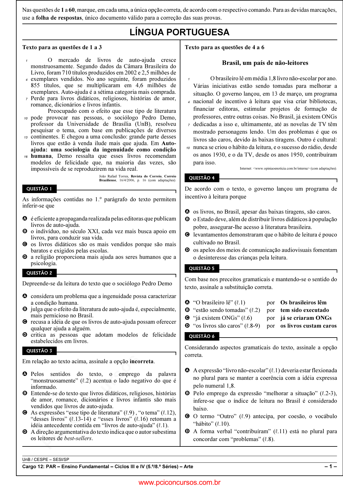 pcimarkpci MDAwMDowMDAwOjAwMDA6MDAwMDowMDAwOmZmZmY6MzZlOTpjMjU5:TW9uLCAxMyBTZXAgMjAyMSAwNjowNzoyMCAtMDMwMA== UnB / CESPE – SESI/SP Cargo 12: PAR – Ensino Fundamental – Ciclos III e IV (5.ª/8.ª Séries) – Arte – 1 – Nas questões de 1 a 60, marque, em cada uma, a única opção�correta, de acordo com o respectivo comando. Para as devidas marcações, use a folha de respostas, único documento válido para a correção das suas provas. LÍNGUA PORTUGUESA Texto para as questões de 1 a 3 O mercado de livros de auto-ajuda cresce1 monstruosamente. Segundo dados da Câmara Brasileira do Livro, foram 710 títulos produzidos em 2002 e 2,5 milhões de exemplares vendidos. No ano seguinte, foram produzidos4 855 títulos, que se multiplicaram em 4,6 milhões de exemplares. Auto-ajuda é a sétima categoria mais comprada. Perde para livros didáticos, religiosos, histórias de amor,7 romance, dicionários e livros infantis. Preocupado com o efeito que esse tipo de literatura pode provocar nas pessoas, o sociólogo Pedro Demo,10 professor da Universidade de Brasília (UnB), resolveu pesquisar o tema, com base em publicações de diversos continentes. E chegou a uma conclusão: grande parte desses13 livros que estão à venda ilude mais que ajuda. Em Auto- ajuda: uma sociologia da ingenuidade como condição humana, Demo ressalta que esses livros recomendam16 modelos de felicidade que, na maioria das vezes, são impossíveis de se reproduzirem na vida real. João Rafael Torres, Revista do Correio, Correio Braziliense, 16/4/2006, p. 16 (com adaptações). �������� As informações contidas no 1.º parágrafo do texto permitem inferir-se que A é eficiente a propaganda realizada pelas editoras que publicam livros de auto-ajuda. B o indivíduo, no século XXI, cada vez mais busca apoio em livros, para conduzir sua vida. C os livros didáticos são os mais vendidos porque são mais baratos e exigidos pelas escolas. D a religião proporciona mais ajuda aos seres humanos que a psicologia. �������� Depreende-se da leitura do texto que o sociólogo Pedro Demo A considera um problema que a ingenuidade possa caracterizar a condição humana. B julga que o efeito da literatura de auto-ajuda é, especialmente, mais pernicioso no Brasil. C recusa a idéia de que os livros de auto-ajuda possam oferecer qualquer ajuda a alguém. D critica as pessoas que adotam modelos de felicidade estabelecidos em livros. ��������� Em relação ao texto acima, assinale a opção incorreta. A Pelos sentidos do texto, o emprego da palavra “monstruosamente” (R.2) acentua o lado negativo do que é informado. B Entende-se do texto que livros didáticos, religiosos, histórias de amor, romance, dicionários e livros infantis são mais vendidos que livros de auto-ajuda. C As expressões “esse tipo de literatura” (R.9) , “o tema” (R.12), “desses livros” (R.13-14) e “esses livros” (R.16) retomam a idéia antecedente contida em “livros de auto-ajuda” (R.1). D A direção argumentativa do texto indica que o autor subestima os leitores de best-sellers. Texto para as questões de 4 a 6 Brasil, um país de não-leitores O brasileiro lê em média 1,8 livro não-escolar por ano.1 Várias iniciativas estão sendo tomadas para melhorar a situação. O governo lançou, em 13 de março, um programa nacional de incentivo à leitura que visa criar bibliotecas,4 financiar editoras, estimular projetos de formação de professores, entre outras coisas. No Brasil, já existem ONGs dedicadas a isso e, ultimamente, até as novelas de TV têm7 mostrado personagens lendo. Um dos problemas é que os livros são caros, devido às baixas tiragens. Outro é cultural: nunca se criou o hábito da leitura, e o sucesso do rádio, desde10 os anos 1930, e o da TV, desde os anos 1950, contribuíram para isso. Internet: <www.opiniaoenoticia.com.br/interna> (com adaptações). ��������� De acordo com o texto, o governo lançou um programa de incentivo à leitura porque A os livros, no Brasil, apesar das baixas tiragens, são caros. B o Estado deve, além de distribuir livros didáticos à população pobre, assegurar-lhe acesso à literatura brasileira. C levantamentos demonstraram que o hábito de leitura é pouco cultivado no Brasil. D os apelos dos meios de comunicação audiovisuais fomentam o desinteresse das crianças pela leitura. �������� Com base nos preceitos gramaticais e mantendo-se o sentido do texto, assinale a substituição correta. A “O brasileiro lê” (R.1) por Os brasileiros lêm B “estão sendo tomadas” (R.2) por tem sido executado C “já existem ONGs” (R.6) por já se criaram ONGs D “os livros são caros” (R.8-9) por os livros custam caros ��������� Considerando aspectos gramaticais do texto, assinale a opção correta. A A expressão “livro não-escolar” (R.1) deveria estar flexionada no plural para se manter a coerência com a idéia expressa pelo numeral 1,8. B Pelo emprego da expressão “melhorar a situação” (R.2-3), infere-se que o índice de leitura no Brasil é considerado baixo. C O termo “Outro” (R.9) antecipa, por coesão, o vocábulo “hábito” (R.10). D A forma verbal “contribuíram” (R.11) está no plural para concordar com “problemas” (R.8). www.pciconcursos.com.br pcimarkpci MDAwMDowMDAwOjAwMDA6MDAwMDowMDAwOmZmZmY6MzZlOTpjMjU5:TW9uLCAxMyBTZXAgMjAyMSAwNjowNzoyMCAtMDMwMA== UnB / CESPE – SESI/SP Cargo 12: PAR – Ensino Fundamental – Ciclos III e IV (5.ª/8.ª Séries) – Arte – 2 – ��������� No projeto Expedição Vaga-Lume, cada Biblioteca implantada contém 300 volumes, entre livros de literatura infantil, infanto-juvenil e livros de apoio para professores. Os livros foram escolhidos cuidadosamente, com a ajuda de educadores e importantes autores infantis, como Patrícia Secco e Ruth Rocha. A lista inclui autores consagrados, como 
