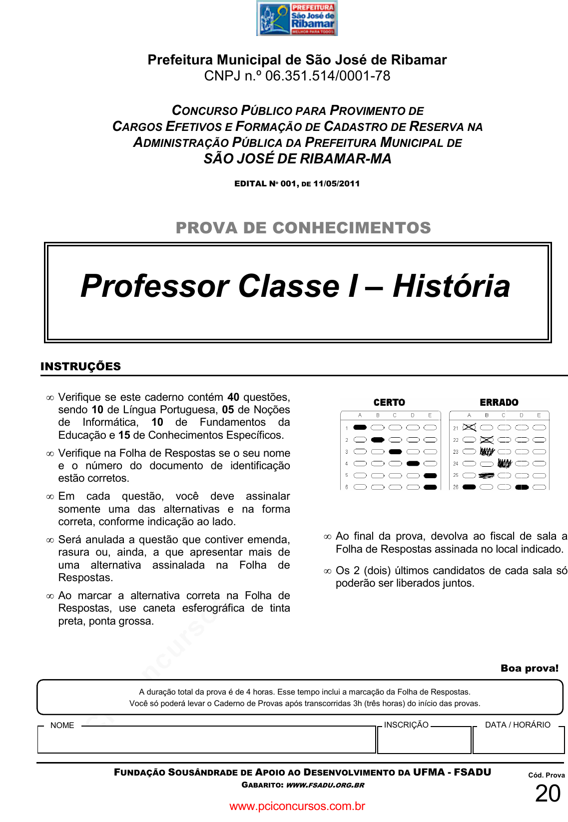 pcimarkpci MDAwMDowMDAwOjAwMDA6MDAwMDowMDAwOmZmZmY6MzZlOTpjMjU5:TW9uLCAxMyBTZXAgMjAyMSAwNjo1MzowNyAtMDMwMA== Prefeitura Municipal de São José de Ribamar CNPJ n.º 06.351.514/0001-78 CONCURSO PÚBLICO PARA PROVIMENTO DE CARGOS EFETIVOS E FORMAÇÃO DE CADASTRO DE RESERVA NA ADMINISTRAÇÃO PÚBLICA DA PREFEITURA MUNICIPAL DE SÃO JOSÉ DE RIBAMAR-MA EDITAL Nº 001, DE 11/05/2011 PROVA DE CONHECIMENTOS Professor Classe I – História INSTRUÇÕES • Verifique se este caderno contém 40 questões, sendo 10 de Língua Portuguesa, 05 de Noções de Informática, 10 de Fundamentos da Educação e 15 de Conhecimentos Específicos. • Verifique na Folha de Respostas se o seu nome e o número do documento de identificação estão corretos. • Em cada questão, você deve assinalar somente uma das alternativas e na forma correta, conforme indicação ao lado. • Será anulada a questão que contiver emenda, rasura ou, ainda, a que apresentar mais de uma alternativa assinalada na Folha de Respostas. • Ao marcar a alternativa correta na Folha de Respostas, use caneta esferográfica de tinta preta, ponta grossa. • Ao final da prova, devolva ao fiscal de sala a Folha de Respostas assinada no local indicado. • Os 2 (dois) últimos candidatos de cada sala só poderão ser liberados juntos. Boa prova! NOME INSCRIÇÃO DATA / HORÁRIO A duração total da prova é de 4 horas. Esse tempo inclui a marcação da Folha de Respostas. Você só poderá levar o Caderno de Provas após transcorridas 3h (três horas) do início das provas. FUNDAÇÃO SOUSÂNDRADE DE APOIO AO DESENVOLVIMENTO DA UFMA - FSADU GABARITO: WWW.FSADU.ORG.BR Cód. Prova 20 www.pciconcursos.com.br pcimarkpci MDAwMDowMDAwOjAwMDA6MDAwMDowMDAwOmZmZmY6MzZlOTpjMjU5:TW9uLCAxMyBTZXAgMjAyMSAwNjo1MzowNyAtMDMwMA== www.pciconcursos.com.br pcimarkpci MDAwMDowMDAwOjAwMDA6MDAwMDowMDAwOmZmZmY6MzZlOTpjMjU5:TW9uLCAxMyBTZXAgMjAyMSAwNjo1MzowNyAtMDMwMA== Concurso Público para Prefeitura Municipal de São José de Ribamar Professor Classe I – História 1 Língua Portuguesa Leia o texto a seguir e responda às questões de 01 a 03. Com franqueza, não me animo a dizer que você não vá. Eu, que sempre andei no rumo de minhas venetas, e tantas vezes troquei o sossego de uma casa pelo assanhamento triste dos ventos da vagabundagem, eu não direi que fique. Em minhas andanças, eu quase nunca soube se estava fugindo de alguma coisa ou caçando outra. Você talvez esteja fugindo de si mesma, e a si mesma caçando; nesta brincadeira boba passamos todos, os inquietos, a maior parte da vida — e às vezes reparamos que é ela que se vai, está sempre indo, e nós (às vezes) estamos apenas quietos, vazios, parados, ficando. Assim estou eu. A viajante. Rubem Braga. IN: http://www.releituras.com/rubembraga_mae.asp. Acesso em 23/05/2011. 01 O termo destacado em “reparamos que é ela que se vai”, terceiro parágrafo, refere-se a: a) brincadeira. b) si mesma. c) coisa. d) vida. e) outra. 02 Leia o trecho a seguir e as proposições sobre as relações linguísticas apontadas. “... nesta brincadeira boba passamos todos, os inquietos, a maior parte da vida — e às vezes reparamos que é ela que se vai...” I. nesta é um pronome catafórico, elemento coesivo no texto. II. os inquietos retoma e nomeia os seres expressos anteriormente pelo termo todos . III. A expressão às vezes recebe crase por causa da regência do verbo reparar. Está CORRETO o que se afirma, apenas, em: a) I. b) III. c) II. d) II e III. e) I e II. 03 Assinale a opção cujo termo ou expressão em destaque possui a mesma função sintática que a expressão destacada em “Com franqueza , não me animo a dizer que você não vá.” a) “Em minhas andanças , eu quase nunca soube se estava fugindo...” b) “Você talvez esteja fugindo de si mesma , e a si mesma caçando...” c) “... nesta brincadeira boba passamos todos, os inquietos , a maior parte da vida...” d) “... eu não direi que fique.” e) “... e nós (às vezes) estamos apenas quietos ...” 04 Assinale a opção que contém ERRO na concordância verbal. a) Ao certo, faz quatro meses que morreu o assassino mais temido desta região. b) Eu não caibo mais nas roupas que cabia. c) Fazem vinte anos que não te vejo. d) Aquele jogador namora uma atriz muito conhecida. e) Virei vê-lo pela manhã. 05 De acordo com a gramática normativa, na língua portuguesa a concordância consiste em se adaptar a palavra determinante ao gênero, número e pessoa da palavra determinada. A partir da concepção acima, pode-se dizer que NÃO há erro de concordância nominal na alternativa: a) Não adianta dizer que ele está quites com seus débitos. b) Desse modo, elas só pensam em si mesmas. c) Anexo seguem as fotos dos estádios. d) Saíram do bolso do contribuinte bastante impostos. e) Seriam necessário essas reivindicações tão óbvias? www.pciconcursos.com.br pcimarkpci MDAwMDowMDAwOjAwMDA6MDAwMDowMDAwOmZmZmY6MzZlOTpjMjU5:TW9uLCAxMyBTZXAgMjAyMSAwNjo1MzowNyAtMDMwMA== Concurso Público para Prefeitura Municipal de São José de Ribamar Professor Classe I – História 2 06 Examine abaixo um trecho a completar. A medida de ________ à iniciativa privada as obras de ampliação e reforma dos aeroportos demorou tanto que não há nenhuma garantia de que ela vá surtir efeito até a Copa do Mundo de 2014 [...]. (Época, 2 de maio de 2011) Com relação à regência, a forma verbal que preenche adequadamente a lacuna acima, considerando a norma padrão da língua e a coerência como princípio de interpretabilidade textual, é: a) pressionar b) completar c) entregar d) preferir e) escolher 07 Pode-se afirmar, de acordo com a norma padrão da língua portuguesa, que um colunista em uma matéria da Revista Veja (2011) teria ERRADO se houvesse assim escrito o trecho presente na alternativa: a) Cinco anos depois, ele se encontra acossado pela suspeita de enriquecimento ilícito e, novamente, sem apoio de seu partido, o PT. b) P