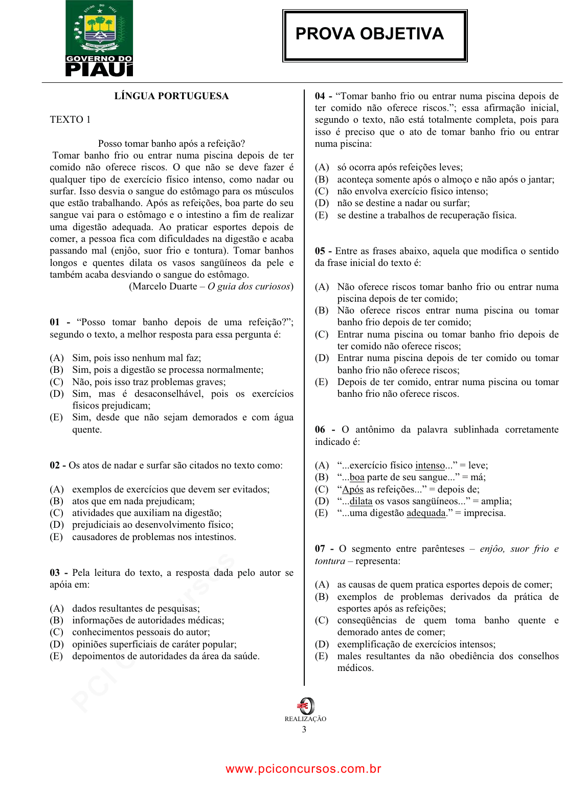 pcimarkpci MDAwMDowMDAwOjAwMDA6MDAwMDowMDAwOmZmZmY6MzZlOTpjMjU5:TW9uLCAxMyBTZXAgMjAyMSAxOTozMjoyOCAtMDMwMA== 3 REALIZAÇÃO PROVA OBJETIVA LÍNGUA PORTUGUESA TEXTO 1 Posso tomar banho após a refeição? Tomar banho frio ou entrar numa piscina depois de ter comido não oferece riscos. O que não se deve fazer é qualquer tipo de exercício físico intenso, como nadar ou surfar. Isso desvia o sangue do estômago para os músculos que estão trabalhando. Após as refeições, boa parte do seu sangue vai para o estômago e o intestino a fim de realizar uma digestão adequada. Ao praticar esportes depois de comer, a pessoa fica com dificuldades na digestão e acaba passando mal (enjôo, suor frio e tontura). Tomar banhos longos e quentes dilata os vasos sangüíneos da pele e também acaba desviando o sangue do estômago. (Marcelo Duarte – O guia dos curiosos) 01 - “Posso tomar banho depois de uma refeição?”; segundo o texto, a melhor resposta para essa pergunta é: (A) Sim, pois isso nenhum mal faz; (B) Sim, pois a digestão se processa normalmente; (C) Não, pois isso traz problemas graves; (D) Sim, mas é desaconselhável, pois os exercícios físicos prejudicam; (E) Sim, desde que não sejam demorados e com água quente. 02 - Os atos de nadar e surfar são citados no texto como: (A) exemplos de exercícios que devem ser evitados; (B) atos que em nada prejudicam; (C) atividades que auxiliam na digestão; (D) prejudiciais ao desenvolvimento físico; (E) causadores de problemas nos intestinos. 03 - Pela leitura do texto, a resposta dada pelo autor se apóia em: (A) dados resultantes de pesquisas; (B) informações de autoridades médicas; (C) conhecimentos pessoais do autor; (D) opiniões superficiais de caráter popular; (E) depoimentos de autoridades da área da saúde. 04 - “Tomar banho frio ou entrar numa piscina depois de ter comido não oferece riscos.”; essa afirmação inicial, segundo o texto, não está totalmente completa, pois para isso é preciso que o ato de tomar banho frio ou entrar numa piscina: (A) só ocorra após refeições leves; (B) aconteça somente após o almoço e não após o jantar; (C) não envolva exercício físico intenso; (D) não se destine a nadar ou surfar; (E) se destine a trabalhos de recuperação física. 05 - Entre as frases abaixo, aquela que modifica o sentido da frase inicial do texto é: (A) Não oferece riscos tomar banho frio ou entrar numa piscina depois de ter comido; (B) Não oferece riscos entrar numa piscina ou tomar banho frio depois de ter comido; (C) Entrar numa piscina ou tomar banho frio depois de ter comido não oferece riscos; (D) Entrar numa piscina depois de ter comido ou tomar banho frio não oferece riscos; (E) Depois de ter comido, entrar numa piscina ou tomar banho frio não oferece riscos. 06 - O antônimo da palavra sublinhada corretamente indicado é: (A) “...exercício físico intenso...” = leve; (B) “...boa parte de seu sangue...” = má; (C) “Após as refeições...” = depois de; (D) “...dilata os vasos sangüíneos...” = amplia; (E) “...uma digestão adequada.” = imprecisa. 07 - O segmento entre parênteses – enjôo, suor frio e tontura – representa: (A) as causas de quem pratica esportes depois de comer; (B) exemplos de problemas derivados da prática de esportes após as refeições; (C) conseqüências de quem toma banho quente e demorado antes de comer; (D) exemplificação de exercícios intensos; (E) males resultantes da não obediência dos conselhos médicos. www.pciconcursos.com.br pcimarkpci MDAwMDowMDAwOjAwMDA6MDAwMDowMDAwOmZmZmY6MzZlOTpjMjU5:TW9uLCAxMyBTZXAgMjAyMSAxOTozMjoyOCAtMDMwMA== 4 REALIZAÇÃO PROVA OBJETIVA 08 - As dificuldades na digestão, fisicamente falando, derivam do (da): (A) os músculos estarem trabalhando; (B) enjôo, suor frio e tontura; (C) mudança de temperatura do corpo; (D) desvio do sangue de sua tarefa digestiva; (E) excesso de sangue no aparelho digestivo. 09 - “Após as refeições, boa parte do SEU sangue...”; o possessivo sublinhado tem como referente: (A) o autor; (B) o autor e o leitor; (C) o leitor; (D) qualquer pessoa; (E) quem pratica esportes. 10 - O segmento em que a correspondência entre o segmento sublinhado e o seu valor semântico NÃO está correta é: (A) “Posso tomar banho depois de uma refeição?” = após; (B) “...a fim de realizar uma digestão adequada.” = com a finalidade de; (C) “...como nadar ou surfar.” = tal qual; (D) “...vai para o estômago...” = na direção de; (E) “Ao praticar esportes...” = depois de. SISTEMA ÚNICO DE SAÚDE 11 - Entre as diretrizes do Sistema Único de Saúde inscritas no Capítulo 2, Seção 2 (da Saúde), artigo 198 da Constituição Federal de 1988, inclui-se: (A) participação da comunidade; (B) prioridade para o atendimento hospitalar; (C) centralização das ações de saúde no governo federal; (D) financiamento privado da saúde; (E) regulação do setor de saúde suplementar. 12 - Segundo a lei 8.080 de 19/09/90 (Lei Orgânica da Saúde), são critérios para o estabelecimento de valores a serem transferidos a estados, Distrito Federal e municípios: (A) desempenho técnico, econômico e financeiro no período atual; (B) perfil epidemiológico da população a ser coberta; (C) participação paritária dos usuários no conselho de saúde; (D) eficiência na arrecadação de impostos; (E) prioridade para o atendimento hospitalar. 13 - As funções de controle e avaliação em saúde devem ser realizadas por/pelo(s): (A) conselhos de comunidade; (B) governador do estado; (C) presidente da república; (D) todos os níveis do sistema de saúde; (E) órgãos próprios das Secretarias de Saúde. 14 - Quanto à acessibilidade da população aos bens e serviços de saúde, analise as seguintes assertivas: www.pciconcursos.com.br pcimarkpci MDAwMDowMDAwOjAwMDA6MDAwMDowMDAwOmZmZmY6MzZlOTpjMjU5:TW9uLCAxMyBTZXAgMjAyMSAxOTozMjoyOCAtMDMwMA== 5 REALIZAÇÃO PROVA OBJETIVA 1 - 