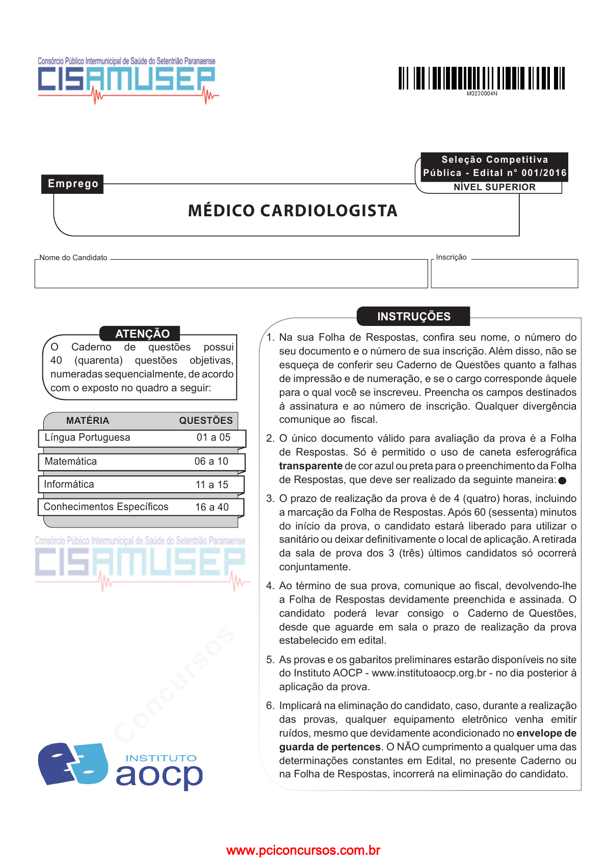 pcimarkpci MDAwMDowMDAwOjAwMDA6MDAwMDowMDAwOmZmZmY6MzZlOTpjMjU5:VHVlLCAxNCBTZXAgMjAyMSAwNjoyMzoxMCAtMDMwMA== INSTRUÇÕES QUESTÕESMATÉRIA Matemática 06 a 10 Língua Portuguesa 01 a 05 Informática 11 a 15 Conhecimentos Específicos 16 a 40 Nome do Candidato Inscrição ATENÇÃO O Caderno de questões possui 40 (quarenta) questões objetivas, numeradas sequencialmente, de acordo com o exposto no quadro a seguir: Emprego MÉDICO CARDIOLOGISTA Seleção Competit iva Pública - Edital n° 001/2016 NÍVEL SUPERIOR 1. Na sua Folha de Respostas, confira seu nome, o número do seu documento e o número de sua inscrição. Além disso, não se esqueça de conferir seu Caderno de Questões quanto a falhas de impressão e de numeração, e se o cargo corresponde àquele para o qual você se inscreveu. Preencha os campos destinados à assinatura e ao número de inscrição. Qualquer divergência comunique ao fiscal. 2. O único documento válido para avaliação da prova é a Folha de Respostas. Só é permitido o uso de caneta esferográfica transparente de cor azul ou preta para o preenchimento da Folha de Respostas, que deve ser realizado da seguinte maneira: 3. O prazo de realização da prova é de 4 (quatro) horas, incluindo a marcação da Folha de Respostas. Após 60 (sessenta) minutos do início da prova, o candidato estará liberado para utilizar o sanitário ou deixar definitivamente o local de aplicação. A retirada da sala de prova dos 3 (três) últimos candidatos só ocorrerá conjuntamente. 4. Ao término de sua prova, comunique ao fiscal, devolvendo-lhe a Folha de Respostas devidamente preenchida e assinada. O candidato poderá levar consigo o Caderno de Questões, desde que aguarde em sala o prazo de realização da prova estabelecido em edital. 5. As provas e os gabaritos preliminares estarão disponíveis no site do Instituto AOCP - www.institutoaocp.org.br - no dia posterior à aplicação da prova. 6. Implicará na eliminação do candidato, caso, durante a realização das provas, qualquer equipamento eletrônico venha emitir ruídos, mesmo que devidamente acondicionado no envelope de guarda de pertences. O NÃO cumprimento a qualquer uma das determinações constantes em Edital, no presente Caderno ou na Folha de Respostas, incorrerá na eliminação do candidato. www.pciconcursos.com.br pcimarkpci MDAwMDowMDAwOjAwMDA6MDAwMDowMDAwOmZmZmY6MzZlOTpjMjU5:VHVlLCAxNCBTZXAgMjAyMSAwNjoyMzoxMCAtMDMwMA== O gabarito oficial preliminar e o caderno de questões da prova objetiva estarão disponíveis no endereço eletrônico www.institutoaocp.org.br no dia seguinte à aplicação da prova. ------------------------------------------------------------------------------ (destaque aqui) ----------------------------------------------------------------------------- Folha para anotação das respostas do candidato Questão Resp. 01 02 03 04 05 06 07 08 09 10 11 12 13 14 15 16 17 18 19 20 21 22 23 24 25 26 27 28 29 30Questão Resp. 31 32 33 34 35 36 37 38 39 40 www.pciconcursos.com.br pcimarkpci MDAwMDowMDAwOjAwMDA6MDAwMDowMDAwOmZmZmY6MzZlOTpjMjU5:VHVlLCAxNCBTZXAgMjAyMSAwNjoyMzoxMCAtMDMwMA== 3 Cargo: Médico Cardiologista L Í N G U A P O R T U G U E S A Bélgica teria ignorado alerta turco sobre autor de atentado em Bruxelas Um dos responsáveis pelos atentados suicidas a bomba em Bruxelas foi deportado no ano passado da Turquia, e a Bélgica, na sequência, teria ignorado um alerta de que o homem era um militante, disse o presidente turco, Tayyip Erdogan, nesta quarta-feira (23). O gabinete de Erdogan identificou o homem como Ibrahim El Bakraoui, um dos dois irmãos que a Bélgica apresentou como responsáveis pelos ataques que mataram pelo menos 31 pessoas em Bruxelas na terça-feira (22), ações pelas quais o grupo Estado Islâmico assumiu a responsabilidade. Autoridades belgas não responderam aos pedidos para comentar a notícia. Em casos anteriores, autoridades disseram que sem evidência de crime, como por exemplo ter lutado na Síria, eles não podiam prender pessoas deportadas da Turquia. Entre esses casos estava Brahim Abdeslam, um dos homens-bomba em Paris em novembro, que também foi enviado de volta para a Bélgica da Turquia em 2015. Em entrevista à imprensa, Erdogan disse que Bakraoui foi detido na província de Gaziantep, no sul da Turquia, perto da fronteira síria, e foi depois deportado para a Holanda. A Turquia também notificou as autoridades holandesas, afirmou Erdogan. Fonte: adaptado de http://ultimosegundo.ig.com.br/mundo/2016-03-23/ turquia-diz-ter-deportado-autor-de-ataque-em-2015-e-que-belgica-igno- rou-alerta.html. Acesso em 25/03/2016. QUESTÃO 01 Em relação ao conteúdo do texto, assinale a alternativa correta. (A) A Bélgica teria se alertado quanto à possibilidade de ataque terrorista assim que Ibrahim El Bakraoui foi deportado para o país. (B) O texto tem como assunto principal o atentado ocorrido na Bélgica, em março deste ano, porém, em determinado trecho, há menção a outro atentado ocorrido também na Europa, em 2015. (C) Todos os terroristas citados no texto foram deportados para a Holanda. (D) Ainda está sendo investigado se o Estado Islâmico é responsável pelo atentado citado no texto. (E) O ataque na Bélgica matou exatamente 31 pessoas. QUESTÃO 02 A respeito da crase presente no trecho “Em entrevista à imprensa”, no início do último parágrafo, assinale a alternativa correta. (A) A crase justifica-se pelo fato de que os vocábulos “entrevista” e “imprensa” são palavras de gênero feminino. (B) O sinal indicativo de crase é facultativo nesse caso, pois a preposição “a” é facultativa após o nome “entrevista”. (C) A crase justifica-se pelo fato de que o nome “entrevista” exige complemento regido pela preposição “a”, e o complemento “imprensa” admite o artigo feminino “a”. (D) A crase justifica-se pelo fato de que “à imprensa” é uma locução adverbial. (E) O sinal indicativo de crase