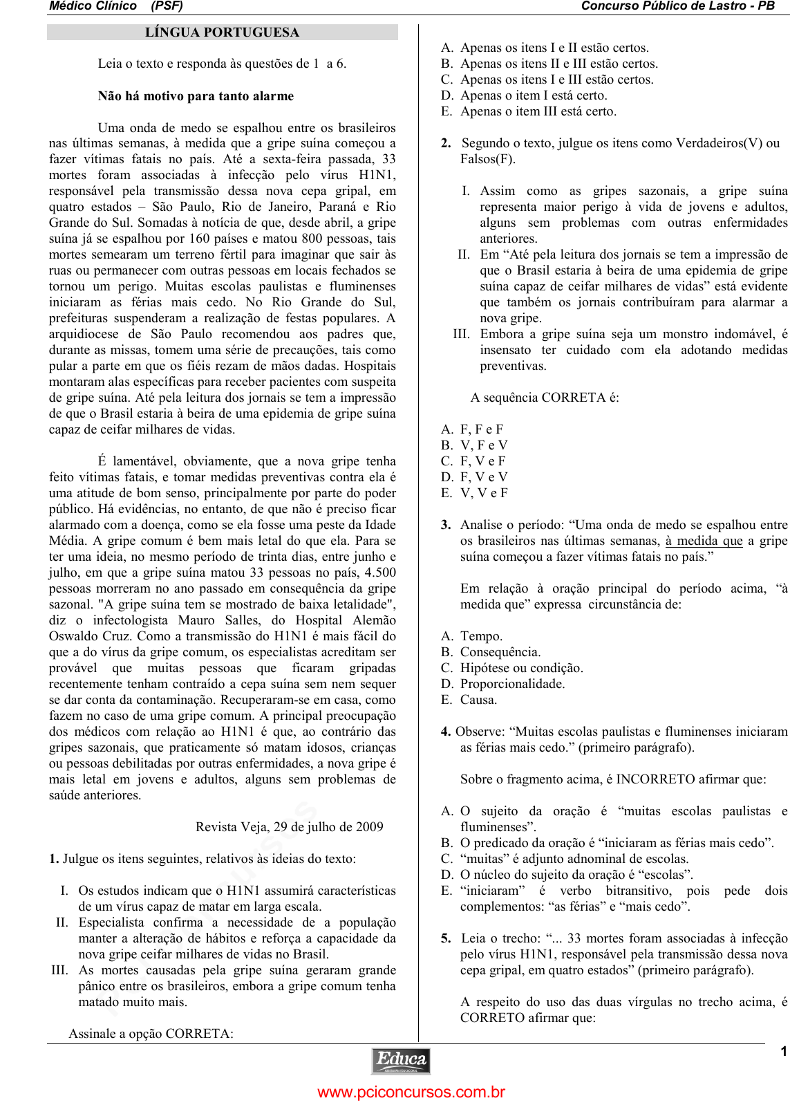 pcimarkpci MDAwMDowMDAwOjAwMDA6MDAwMDowMDAwOmZmZmY6MzZlOTpjMjU5:VHVlLCAxNCBTZXAgMjAyMSAwNzo0MjowNCAtMDMwMA== Médico Clínico (PSF) Concurso Público de Lastro - PB 1 LÍNGUA PORTUGUESA Leia o texto e responda às questões de 1 a 6. Não há motivo para tanto alarme Uma onda de medo se espalhou entre os brasileiros nas últimas semanas, à medida que a gripe suína começou a fazer vítimas fatais no país. Até a sexta-feira passada, 33 mortes foram associadas à infecção pelo vírus H1N1, responsável pela transmissão dessa nova cepa gripal, em quatro estados – São Paulo, Rio de Janeiro, Paraná e Rio Grande do Sul. Somadas à notícia de que, desde abril, a gripe suína já se espalhou por 160 países e matou 800 pessoas, tais mortes semearam um terreno fértil para imaginar que sair às ruas ou permanecer com outras pessoas em locais fechados se tornou um perigo. Muitas escolas paulistas e fluminenses iniciaram as férias mais cedo. No Rio Grande do Sul, prefeituras suspenderam a realização de festas populares. A arquidiocese de São Paulo recomendou aos padres que, durante as missas, tomem uma série de precauções, tais como pular a parte em que os fiéis rezam de mãos dadas. Hospitais montaram alas específicas para receber pacientes com suspeita de gripe suína. Até pela leitura dos jornais se tem a impressão de que o Brasil estaria à beira de uma epidemia de gripe suína capaz de ceifar milhares de vidas. É lamentável, obviamente, que a nova gripe tenha feito vítimas fatais, e tomar medidas preventivas contra ela é uma atitude de bom senso, principalmente por parte do poder público. Há evidências, no entanto, de que não é preciso ficar alarmado com a doença, como se ela fosse uma peste da Idade Média. A gripe comum é bem mais letal do que ela. Para se ter uma ideia, no mesmo período de trinta dias, entre junho e julho, em que a gripe suína matou 33 pessoas no país, 4.500 pessoas morreram no ano passado em consequência da gripe sazonal. "A gripe suína tem se mostrado de baixa letalidade", diz o infectologista Mauro Salles, do Hospital Alemão Oswaldo Cruz. Como a transmissão do H1N1 é mais fácil do que a do vírus da gripe comum, os especialistas acreditam ser provável que muitas pessoas que ficaram gripadas recentemente tenham contraído a cepa suína sem nem sequer se dar conta da contaminação. Recuperaram-se em casa, como fazem no caso de uma gripe comum. A principal preocupação dos médicos com relação ao H1N1 é que, ao contrário das gripes sazonais, que praticamente só matam idosos, crianças ou pessoas debilitadas por outras enfermidades, a nova gripe é mais letal em jovens e adultos, alguns sem problemas de saúde anteriores. Revista Veja, 29 de julho de 2009 1. Julgue os itens seguintes, relativos às ideias do texto: I. Os estudos indicam que o H1N1 assumirá características de um vírus capaz de matar em larga escala. II. Especialista confirma a necessidade de a população manter a alteração de hábitos e reforça a capacidade da nova gripe ceifar milhares de vidas no Brasil. III. As mortes causadas pela gripe suína geraram grande pânico entre os brasileiros, embora a gripe comum tenha matado muito mais. Assinale a opção CORRETA: A. Apenas os itens I e II estão certos. B. Apenas os itens II e III estão certos. C. Apenas os itens I e III estão certos. D. Apenas o item I está certo. E. Apenas o item III está certo. 2. Segundo o texto, julgue os itens como Verdadeiros(V) ou Falsos(F). I. Assim como as gripes sazonais, a gripe suína representa maior perigo à vida de jovens e adultos, alguns sem problemas com outras enfermidades anteriores. II. Em “Até pela leitura dos jornais se tem a impressão de que o Brasil estaria à beira de uma epidemia de gripe suína capaz de ceifar milhares de vidas” está evidente que também os jornais contribuíram para alarmar a nova gripe. III. Embora a gripe suína seja um monstro indomável, é insensato ter cuidado com ela adotando medidas preventivas. A sequência CORRETA é: A. F, F e F B. V, F e V C. F, V e F D. F, V e V E. V, V e F 3. Analise o período: “Uma onda de medo se espalhou entre os brasileiros nas últimas semanas, à medida que a gripe suína começou a fazer vítimas fatais no país.” Em relação à oração principal do período acima, “à medida que” expressa circunstância de: A. Tempo. B. Consequência. C. Hipótese ou condição. D. Proporcionalidade. E. Causa. 4. Observe: “Muitas escolas paulistas e fluminenses iniciaram as férias mais cedo.” (primeiro parágrafo). Sobre o fragmento acima, é INCORRETO afirmar que: A. O sujeito da oração é “muitas escolas paulistas e fluminenses”. B. O predicado da oração é “iniciaram as férias mais cedo”. C. “muitas” é adjunto adnominal de escolas. D. O núcleo do sujeito da oração é “escolas”. E. “iniciaram” é verbo bitransitivo, pois pede dois complementos: “as férias” e “mais cedo”. 5. Leia o trecho: “... 33 mortes foram associadas à infecção pelo vírus H1N1, responsável pela transmissão dessa nova cepa gripal, em quatro estados” (primeiro parágrafo). A respeito do uso das duas vírgulas no trecho acima, é CORRETO afirmar que: www.pciconcursos.com.br pcimarkpci MDAwMDowMDAwOjAwMDA6MDAwMDowMDAwOmZmZmY6MzZlOTpjMjU5:VHVlLCAxNCBTZXAgMjAyMSAwNzo0MjowNCAtMDMwMA== Médico Clínico (PSF) Concurso Público de Lastro - PB 2 A. A primeira vírgula está mal empregada porque não se separa sujeito do verbo. B. A segunda vírgula está mal empregada porque separa orações coordenadas. C. As duas vírgulas estão bem empregadas porque separam termos independentes da oração chamados de vocativo. D. As duas vírgulas estão bem empregadas porque separam termos com valor explicativo. E. As duas vírgulas estão mal empregadas porque não se separa os adjuntos adnominais dos substantivos a que se referem. 6. A respeito do sujeito, é CORRETO afirmar que na oração
