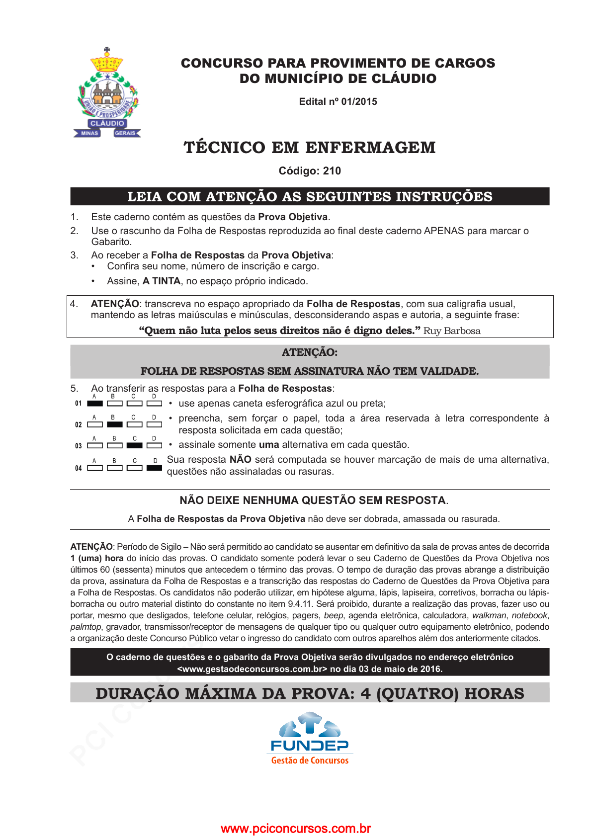 pcimarkpci MDAwMDowMDAwOjAwMDA6MDAwMDowMDAwOmZmZmY6MzZlOTpjMjU5:U2F0LCAxMSBTZXAgMjAyMSAwMzowMDozNSAtMDMwMA== CONCURSO PARA PROVIMENTO DE CARGOS DO MUNICÍPIO DE CLÁUDIO Edital nº 01/2015 TÉCNICO EM ENFERMAGEM Código: 210 LEIA COM ATENÇÃO AS SEGUINTES INSTRUÇÕES 1. Este caderno contém as questões da Prova Objetiva. 2. Use o rascunho da Folha de Respostas reproduzida ao final deste caderno APENAS para marcar o Gabarito. 3. Ao receber a Folha de Respostas da Prova Objetiva: • Confira seu nome, número de inscrição e cargo. • Assine, A TINTA, no espaço próprio indicado. 4. ATENÇÃO: transcreva no espaço apropriado da Folha de Respostas, com sua caligrafia usual, mantendo as letras maiúsculas e minúsculas, desconsiderando aspas e autoria, a seguinte frase: “Quem não luta pelos seus direitos não é digno deles.” Ruy Barbosa ATENÇÃO: FOLHA DE RESPOSTAS SEM ASSINATURA NÃO TEM VALIDADE. 5. Ao transferir as respostas para a Folha de Respostas: • use apenas caneta esferográfica azul ou preta; • preencha, sem forçar o papel, toda a área reservada à letra correspondente à resposta solicitada em cada questão; • assinale somente uma alternativa em cada questão. Sua resposta NÃO será computada se houver marcação de mais de uma alternativa, questões não assinaladas ou rasuras. NÃO DEIXE NENHUMA QUESTÃO SEM RESPOSTA. A Folha de Respostas da Prova Objetiva não deve ser dobrada, amassada ou rasurada. ATENÇÃO: Período de Sigilo – Não será permitido ao candidato se ausentar em definitivo da sala de provas antes de decorrida 1 (uma) hora do início das provas. O candidato somente poderá levar o seu Caderno de Questões da Prova Objetiva nos últimos 60 (sessenta) minutos que antecedem o término das provas. O tempo de duração das provas abrange a distribuição da prova, assinatura da Folha de Respostas e a transcrição das respostas do Caderno de Questões da Prova Objetiva para a Folha de Respostas. Os candidatos não poderão utilizar, em hipótese alguma, lápis, lapiseira, corretivos, borracha ou lápis- borracha ou outro material distinto do constante no item 9.4.11. Será proibido, durante a realização das provas, fazer uso ou portar, mesmo que desligados, telefone celular, relógios, pagers, beep, agenda eletrônica, calculadora, walkman, notebook, palmtop, gravador, transmissor/receptor de mensagens de qualquer tipo ou qualquer outro equipamento eletrônico, podendo a organização deste Concurso Público vetar o ingresso do candidato com outros aparelhos além dos anteriormente citados. O caderno de questões e o gabarito da Prova Objetiva serão divulgados no endereço eletrônico <www.gestaodeconcursos.com.br> no dia 03 de maio de 2016. DURAÇÃO MÁXIMA DA PROVA: 4 (QUATRO) HORAS www.pciconcursos.com.br pcimarkpci MDAwMDowMDAwOjAwMDA6MDAwMDowMDAwOmZmZmY6MzZlOTpjMjU5:U2F0LCAxMSBTZXAgMjAyMSAwMzowMDozNSAtMDMwMA== ATENÇÃO Sr.(a) Candidato(a), Antes de começar a fazer a prova, confira se este caderno contém, ao todo, 40 (quarenta) questões de múltipla escolha, cada uma constituída de 4 (quatro) alternativas de respostas, assim distribuídas: 15 (quinze) questões de Língua Portuguesa, 10 (dez) questões de Matemática e Raciocínio Lógico, 5 (cinco) questões de Conhecimentos gerais / Atualidades e 10 (dez) questões de Conhecimentos Específicos, todas perfeitamente legíveis. Havendo algum problema, informe imediatamente ao aplicador de provas para que ele tome as providências necessárias. Caso não observe essa recomendação, não lhe caberá qualquer reclamação ou recursos posteriores. www.pciconcursos.com.br pcimarkpci MDAwMDowMDAwOjAwMDA6MDAwMDowMDAwOmZmZmY6MzZlOTpjMjU5:U2F0LCAxMSBTZXAgMjAyMSAwMzowMDozNSAtMDMwMA== 3 LÍNGUA PORTUGUESA INSTRUÇÃO: Leia o texto a seguir para responder às questões de 1 a 15. Classe média global Na primeira década do século 21, houve forte redução da pobreza global. Em 2001, 29% da população mundial estava nessa faixa de renda. Em 2011, o porcentual havia diminuído para 15%, com a saída de 669 milhões de pessoas dessa situação. No entanto, recente estudo do Pew Research Center indica que o surgimento de uma massiva classe média global ainda é uma realidade distante. A maioria da população do planeta (56%) continua sendo de baixa renda. Atualmente, apenas 13% da população mundial está na faixa de renda média. A partir de dados de 111 países, que em 2001 representavam 88% dos habitantes do planeta, o estudo examina as mudanças na distribuição da renda pela população mundial entre 2001 e 2011, com especial foco na classe média global. A análise divide a população mundial em cinco grupos a partir da renda diária per capita – pobre (até US$2), baixa renda (US$2 a US$10), renda média (US$10 a US$20), renda média alta (US$20 a US$50) e alta renda (acima de US$50). O foco na classe média deve-se ao reconhecimento de sua importância para o desenvolvimento econômico e social dos países, tanto os desenvolvidos quanto os que estão em desenvolvimento. Quando as pessoas são capazes de consumir e economizar mais, elas estão mais aptas a promover mudanças sociais e políticas de longo prazo. O estudo menciona também a evidência empírica de que, juntamente com a educação, a renda é um dos fatores determinantes para a qualidade das instituições políticas. E segundo o Pew Research Center, é a partir da renda de US$10 por dia que as pessoas ficam numa situação de segurança econômica mínima, que as protege de retornar com facilidade à pobreza. Na primeira década do século 21, 385 milhões de pessoas ingressaram na faixa de renda média. Esse crescimento, no entanto, se concentrou em três regiões – China, América Latina e Europa Oriental. Entre 2001 e 2011, 203 milhões de chineses alcançaram a faixa de US$10 a US$20 de renda por dia. Já na América Latina, foram 63 milhões de pessoas a mais nessa faixa de renda, aumento este proporcionad