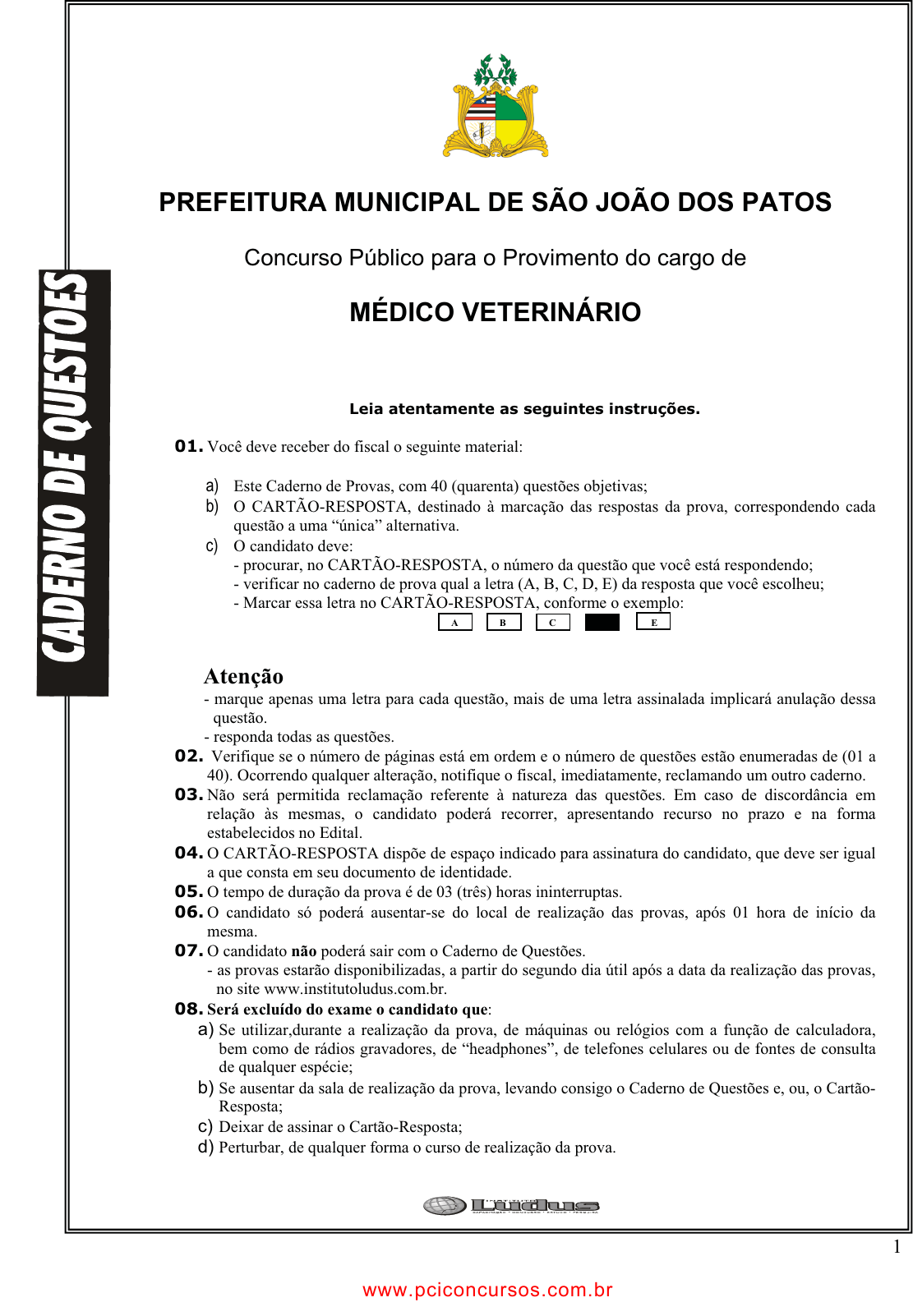 pcimarkpci MDAwMDowMDAwOjAwMDA6MDAwMDowMDAwOmZmZmY6MzZlOTpjMjU5:VHVlLCAxNCBTZXAgMjAyMSAxOTo1OTo1MyAtMDMwMA== 1 Leia atentamente as seguintes instruções. 01. Você deve receber do fiscal o seguinte material: a) Este Caderno de Provas, com 40 (quarenta) questões objetivas; b) O CARTÃO-RESPOSTA, destinado à marcação das respostas da prova, correspondendo cada questão a uma “única” alternativa. c) O candidato deve: - procurar, no CARTÃO-RESPOSTA, o número da questão que você está respondendo; - verificar no caderno de prova qual a letra (A, B, C, D, E) da resposta que você escolheu; - Marcar essa letra no CARTÃO-RESPOSTA, conforme o exemplo: D E A CB Atenção - marque apenas uma letra para cada questão, mais de uma letra assinalada implicará anulação dessa questão. - responda todas as questões. 02. Verifique se o número de páginas está em ordem e o número de questões estão enumeradas de (01 a 40). Ocorrendo qualquer alteração, notifique o fiscal, imediatamente, reclamando um outro caderno. 03. Não será permitida reclamação referente à natureza das questões. Em caso de discordância em relação às mesmas, o candidato poderá recorrer, apresentando recurso no prazo e na forma estabelecidos no Edital. 04. O CARTÃO-RESPOSTA dispõe de espaço indicado para assinatura do candidato, que deve ser igual a que consta em seu documento de identidade. 05. O tempo de duração da prova é de 03 (três) horas ininterruptas. 06. O candidato só poderá ausentar-se do local de realização das provas, após 01 hora de início da mesma. 07. O candidato não poderá sair com o Caderno de Questões. - as provas estarão disponibilizadas, a partir do segundo dia útil após a data da realização das provas, no site www.institutoludus.com.br. 08. Será excluído do exame o candidato que: a) Se utilizar,durante a realização da prova, de máquinas ou relógios com a função de calculadora, bem como de rádios gravadores, de “headphones”, de telefones celulares ou de fontes de consulta de qualquer espécie; b) Se ausentar da sala de realização da prova, levando consigo o Caderno de Questões e, ou, o Cartão- Resposta; c) Deixar de assinar o Cartão-Resposta; d) Perturbar, de qualquer forma o curso de realização da prova. PREFEITURA MUNICIPAL DE SÃO JOÃO DOS PATOS Concurso Público para o Provimento do cargo de MÉDICO VETERINÁRIO www.pciconcursos.com.br pcimarkpci MDAwMDowMDAwOjAwMDA6MDAwMDowMDAwOmZmZmY6MzZlOTpjMjU5:VHVlLCAxNCBTZXAgMjAyMSAxOTo1OTo1MyAtMDMwMA== 2 LÍNGUA PORTUGUESA TEXTO Bebida em alta Ao contrário do que acontece nos países desenvolvidos, o consumo do álcool tem aumentado nos países em desenvolvimento. É o caso do Brasil, onde não há praticamente controle sobre a indústria de bebidas alcoólicas. Segundo os especialistas, é preciso uma política pública para o álcool tão ofensiva quanto a do cigarro. “Um litro de pinga aqui custa menos do que 1 dólar”, diz o psiquiatra Ronaldo Laranjeira, da Universidade Federal de São Paulo (Unifesp). “Nos países desenvolvidos, uma garrafa de destilado não sai por menos de 10 dólares.” Além dos preços baixíssimos, no Brasil o marketing da indústria do álcool é muito agressivo e mira, sobretudo, os jovens. O levantamento do Ministério da Saúde confirma essa tendência. Os brasileiros que bebem exageradamente têm, em sua maioria, entre 18 e 24 anos. Uma das principais preocupações é a tendência de aumento do abuso do álcool pelas mulheres jovens. Um estudo conduzido recentemente pela Unifesp revela que o consumo exagerado de álcool aumenta principalmente entre as meninas adolescentes. Elas já se equiparam aos meninos e três em cada dez bebem com freqüência. Quanto mais se bebe na juventude, maior será a propensão ao alcoolismo na idade adulta. Quantidades moderadas de álcool, algo como dois copos de vinho por semana, trazem benefícios ao coração e ao sistema circulatório. Mais do que isso pode resultar em danos irreversíveis ao fígado. Há indícios de que o abuso de álcool pode lesionar o cérebro. Em excesso, a bebida está associada a danos nas regiões cerebrais ligadas à memória e ao aprendizado. Revista Veja 01 - O artigo declara que o consumo de álcool tem aumentado nos países em desenvolvimento e atribui o fato a um conjunto de fatores. Entre os fatores de aumento desse consumo NÃO está incluído(a): A) A falta de controle sobre a indústria de bebidas alcoólicas; B) O baixo preço dos destilados no Brasil; C) A agressividade do marketing da indústria do álcool; D) A falta de uma política pública tão ofensiva quanto a do cigarro; E) A chegada de mulheres jovens ao mercado de trabalho e ao consumo. 02 - O título dado ao artigo é “Bebida em alta”; a melhor justificativa para o título dado, em função do que se lê no texto, é: A) O alto preço das bebidas alcoólicas; B) O aumento de doenças causadas pelo álcool; C) O crescimento do consumo de álcool no Brasil; D) O aumento de consumo de álcool entre meninas; E) O desenvolvimento do marketing do álcool no Brasil. 03 - Os especialistas dizem que “é preciso uma política pública para o álcool tão ofensiva quanto a do cigarro”. Isso significa dizer que: A) A política para o cigarro é menos ofensiva do que a empregada para o álcool; B) A política pública empregada para o cigarro vem dando certo; C) A campanha publicitária do cigarro traz ofensas aos consumidores; D) Não há política pública de oposição ao consumo de álcool; E) O consumo de álcool traz mais renda ao Estado do que o cigarro. 04 - Ao dizer que o consumo abusivo de álcool “pode resultar em danos irreversíveis ao fígado” e de que “pode lesionar o cérebro”, o artigo apela para uma estratégia argumentativa que se apóia na: A) Sedução; B) Intimidação; C) Competição; D) Elitização; E) Constrangimento. 05 - “Uma das principais preocupações é a tendência de aumento no abus