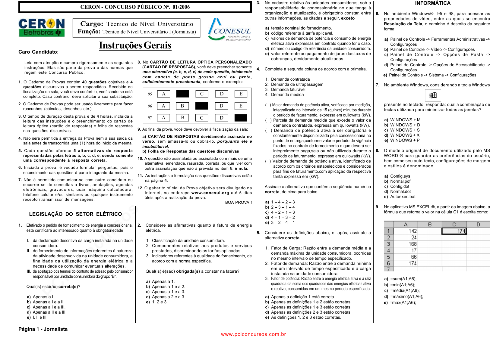 pcimarkpci MDAwMDowMDAwOjAwMDA6MDAwMDowMDAwOmZmZmY6MzZlOTpjMjU5:V2VkLCAxNSBTZXAgMjAyMSAwNDo0NDoxMiAtMDMwMA== Página 1 - Jornalista Cargo: Técnico de Nível Universitário Função: Técnico de Nível Universitário I (Jornalista) CERON - CONCURSO PÚBLICO No. 01/2006 Instruções Gerais A C D E A A B B D E C D 95 96 97 LEGISLAÇÃO DO SETOR ELÉTRICO Caro Candidato: Leia com atenção e cumpra rigorosamente as seguintes instruções. Elas são parte da prova e das normas que regem este Concurso Público. 1. O Caderno de Provas contém 40 questões objetivas e 4 questões discursivas a serem respondidas. Recebido da fiscalização da sala, você deve conferi-lo, verificando se está completo. Caso contrário, deve solicitar a sua substituição. 2. O Caderno de Provas pode ser usado livremente para fazer rascunhos (cálculos, desenhos etc.). 3. O tempo de duração desta prova é de 4 horas, incluída a leitura das instruções e o preenchimento do cartão de leitura óptica (cartão de respostas) e folha de respostas nas questões discursivas. 4. Não será permitida a entrega da Prova nem a sua saída da sala antes de transcorrida uma (1) hora do início da mesma. 5. Cada questão oferece 5 alternativas de resposta representadas pelas letras a, b, c, d, e, sendo somente uma correspondente à resposta correta. 6. Iniciada a prova, é vedado formular perguntas, pois o entendimento das questões é parte integrante da mesma. 7. Não é permitido comunicar-se com outro candidato ou socorrer-se de consultas a livros, anotações, agendas eletrônicas, gravadores, usar máquina calculadora, telefone celular e/ou similares ou qualquer instrumento receptor/transmissor de mensagens. 8. No CARTÃO DE LEITURA ÓPTICA PERSONALIZADO (CARTÃO DE RESPOSTAS), você deve preencher somente uma alternativa (a, b, c, d, e) de cada questão, totalmente com caneta de ponta grossa azul ou preta, suficientemente pressionada, conforme o exemplo: 9. Ao final da prova, você deve devolver à fiscalização da sala: a) CARTÃO DE RESPOSTAS devidamente assinado no verso, sem amassá-lo ou dobrá-lo, porquanto ele é insubstituível. b) Folha de Respostas das questões discursivas 10. A questão não assinalada ou assinalada com mais de uma alternativa, emendada, rasurada, borrada, ou que vier com outra assinalação que não a prevista no item 8, é nula. 11. As instruções e formulação das questões discursivas estão na página 4. 12. O gabarito oficial da Prova objetiva será divulgado na Internet, no endereço www.conesul.org até 5 dias úteis após a realização da prova. BOA PROVA ! 1. Efetivado o pedido de fornecimento de energia à concessionária, esta certificará ao interessado quanto à obrigatoriedade I. da declaração descritiva da carga instalada na unidade consumidora. II. do fornecimento de informações referentes à natureza da atividade desenvolvida na unidade consumidora, a finalidade da utilização da energia elétrica e a necessidade de comunicar eventuais alterações. III. da aceitação dos termos do contrato de adesão pelo consumidor responsávelporunidadeconsumidoradogrupo B . Qual(is) está(ão) correta(s)? a) Apenas a I. b) Apenas a I e a II. c) Apenas a I e a III. d) Apenas a II e a III. e) I, II e III. 2. Considere as afirmativas quanto à fatura de energia elétrica. 1. Classificação da unidade consumidora. 2. Componentes relativos aos produtos e serviços prestados, discriminando as tarifas aplicadas. 3. Indicadores referentes à qualidade do fornecimento, de acordo com a norma específica. Qual(is) é(são) obrigada(s) a constar na fatura? a) Apenas a 1. b) Apenas a 1 e a 2. c) Apenas a 1 e a 3. d) Apenas a 2 e a 3. e) 1, 2 e 3. 3. No cadastro relativo às unidades consumidoras, sob a responsabilidade da concessionária no que tange à organização e atualização, é obrigatório constar, entre outras informações, as citadas a seguir, exceto a) tensão nominal do fornecimento. b) código referente à tarifa aplicável. c) valores de demanda de potência e consumo de energia elétrica ativa expressas em contrato quando for o caso. d) número ou código de referência da unidade consumidora. e) valor referente ao pagamento de juros das taxas de cobranças, devidamente atualizadas. 4. Complete a segunda coluna de acordo com a primeira. 1. Demanda contratada 2. Demanda de ultrapassagem 3. Demanda faturável 4. Demanda medida ( ) Maior demanda de potência ativa, verificada por medição, integralizada no intervalo de 15 (quinze) minutos durante o período de faturamento, expressa em quilowatts (kW). ( ) Parcela da demanda medida que excede o valor da demanda contratada, expressa em quilowatts (kW). ( ) Demanda de potência ativa a ser obrigatória e constantemente disponibilizada pela concessionária no ponto de entrega,conforme valor e período de vigência fixados no contrato de fornecimento e que deverá ser integralmente paga,seja ou não utilizada durante o período de faturamento, expresso em quilowatts (kW). ( ) Valor de demanda de potência ativa, identificado de acordo com os critérios estabelecidos e considerados para fins de faturamento,com aplicação da respectiva tarifa expressa em (kW). Assinale a alternativa que contém a seqüência numérica correta, de cima para baixo. a) 1 4 2 3 b) 2 3 1 4 c) 4 2 1 3 d) 4 1 3 2 e) 3 2 4 1 5. Considere as definições abaixo, e, após, assinale a alternativa correta. 1. Fator de Carga: Razão entre a demanda média e a demanda máxima da unidade consumidora, ocorridas no mesmo intervalo de tempo especificado. 2. Fator de demanda: Razão entre a demanda mínima em um intervalo de tempo especificado e a carga instalada na unidade consumidora. 3. Fator de potência: Razão entre a energia elétrica ativa e a raiz quadrada da soma dos quadrados das energias elétricas ativa e reativa, consumidas em um mesmo período especificado. a) Apenas a definição 1 está correta. b) Apenas as definições 1 e 2 estão corretas. c
