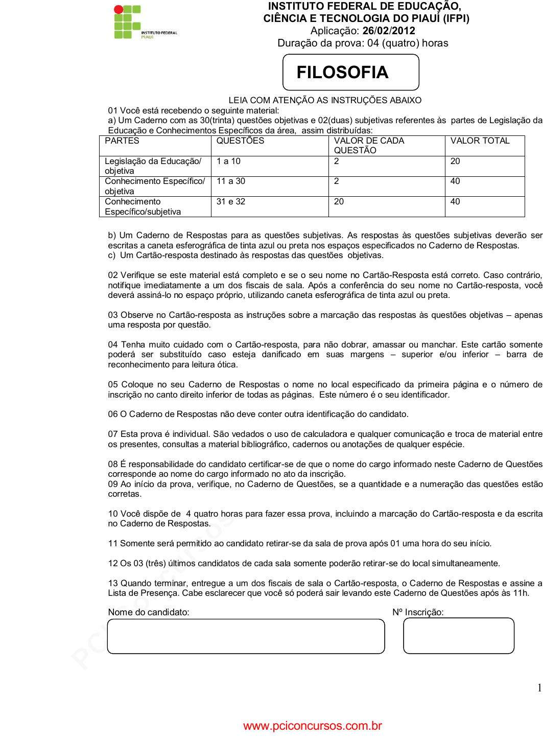 pcimarkpci MDAwMDowMDAwOjAwMDA6MDAwMDowMDAwOmZmZmY6MzZlOTpjMjU5:VGh1LCAxNiBTZXAgMjAyMSAwMzowNzowMSAtMDMwMA== 1 INSTITUTO FEDERAL DE EDUCAÇÃO, CIÊNCIA E TECNOLOGIA DO PIAUÍ (IFPI) Aplicação: 26/02/2012 Duração da prova: 04 (quatro) horas LEIA COM ATENÇÃO AS INSTRUÇÕES ABAIXO 01 Você está recebendo o seguinte material: a) Um Caderno com as 30(trinta) questões objetivas e 02(duas) subjetivas referentes às partes de Legislação da Educação e Conhecimentos Específicos da área, assim distribuídas: PARTES QUESTÕES VALOR DE CADA QUESTÃO VALOR TOTAL Legislação da Educação/ objetiva 1 a 10 2 20 Conhecimento Específico/ objetiva 11 a 30 2 40 Conhecimento Específico/subjetiva 31 e 32 20 40 b) Um Caderno de Respostas para as questões subjetivas. As respostas às questões subjetivas deverão ser escritas a caneta esferográfica de tinta azul ou preta nos espaços especificados no Caderno de Respostas. c) Um Cartão-resposta destinado às respostas das questões objetivas. 02 Verifique se este material está completo e se o seu nome no Cartão-Resposta está correto. Caso contrário, notifique imediatamente a um dos fiscais de sala. Após a conferência do seu nome no Cartão-resposta, você deverá assiná-lo no espaço próprio, utilizando caneta esferográfica de tinta azul ou preta. 03 Observe no Cartão-resposta as instruções sobre a marcação das respostas às questões objetivas – apenas uma resposta por questão. 04 Tenha muito cuidado com o Cartão-resposta, para não dobrar, amassar ou manchar. Este cartão somente poderá ser substituído caso esteja danificado em suas margens – superior e/ou inferior – barra de reconhecimento para leitura ótica. 05 Coloque no seu Caderno de Respostas o nome no local especificado da primeira página e o número de inscrição no canto direito inferior de todas as páginas. Este número é o seu identificador. 06 O Caderno de Respostas não deve conter outra identificação do candidato. 07 Esta prova é individual. São vedados o uso de calculadora e qualquer comunicação e troca de material entre os presentes, consultas a material bibliográfico, cadernos ou anotações de qualquer espécie. 08 É responsabilidade do candidato certificar-se de que o nome do cargo informado neste Caderno de Questões corresponde ao nome do cargo informado no ato da inscrição. 09 Ao início da prova, verifique, no Caderno de Questões, se a quantidade e a numeração das questões estão corretas. 10 Você dispõe de 4 quatro horas para fazer essa prova, incluindo a marcação do Cartão-resposta e da escrita no Caderno de Respostas. 11 Somente será permitido ao candidato retirar-se da sala de prova após 01 uma hora do seu início. 12 Os 03 (três) últimos candidatos de cada sala somente poderão retirar-se do local simultaneamente. 13 Quando terminar, entregue a um dos fiscais de sala o Cartão-resposta, o Caderno de Respostas e assine a Lista de Presença. Cabe esclarecer que você só poderá sair levando este Caderno de Questões após às 11h. Nome do candidato: Nº Inscrição: FILOSOFIA www.pciconcursos.com.br pcimarkpci MDAwMDowMDAwOjAwMDA6MDAwMDowMDAwOmZmZmY6MzZlOTpjMjU5:VGh1LCAxNiBTZXAgMjAyMSAwMzowNzowMSAtMDMwMA== 2 QUESTÕES OBJETIVAS - LEGISLAÇÃO EDUCACIONAL 1 O art. 3º do decreto nº 5154/2004 diz: “Os cursos e programas de formação inicial e continuada de trabalhadores, referidos no inciso I do art. 1o, incluídos a capacitação, o aperfeiçoamento, a especialização e a atualização, em todos os níveis de escolaridade, poderão ser ofertados segundo itinerários formativos, objetivando o desenvolvimento de aptidões para a vida produtiva e social.” De acordo com o artigo acima, itinerário formativo significa: A) “O conjunto de cursos de educação geral e profissional que juntos compõem o currículo do estudante ao final da graduação.” B) As exigências de cada instituição de ensino nos termos de seu projeto pedagógico C) A organização por áreas profissionais em função da estrutura sócio-ocupacional e tecnológica D) O conjunto de etapas que compõem a organização da educação profissional em uma determinada área, possibilitando o aproveitamento contínuo e articulado dos estudos. E) Os objetivos contidos nas diretrizes curriculares nacionais definidos pelo Conselho Nacional de Educação. 2 A educação profissional técnica de nível médio é desenvolvida de forma articulada com o Ensino Médio, observando-se: I Os objetivos contidos nas diretrizes curriculares nacionais definidos pelo Conselho Nacional de Educação; II A carência de cada cidade, levando-se em consideração o ritmo da clientela; III As normas complementares dos respectivos sistemas de ensino; IV As exigências de cada instituição de ensino, nos termos de seu projeto pedagógico. Em relação às assertivas, estão corretas: A) I, III, IV. B) I,II,III. C) II,III,IV. D) I,II,IV. E) I,II,III,IV. 3 Os cursos de educação profissional tecnológica de graduação e pós-graduação serão organizados como seguem abaixo: A) De forma a suprir as necessidades e características de cada região, obedecendo às diretrizes do Conselho Estadual de Educação. B) No que concerne à duração, metodologia e avaliação de acordo com as diretrizes do Conselho Estadual de Educação. C) De forma estruturada em etapas com terminalidade gradativa e inclusão de saídas intermediárias. D) No que concerne aos objetivos, características e direção de acordo com as diretrizes curriculares e prioritárias dos Municípios e Estado, respectivamente. E) No que concerne aos objetivos, características e duração de acordo com as diretrizes curriculares nacionais, definidas pelo Conselho Nacional de Educação. www.pciconcursos.com.br pcimarkpci MDAwMDowMDAwOjAwMDA6MDAwMDowMDAwOmZmZmY6MzZlOTpjMjU5:VGh1LCAxNiBTZXAgMjAyMSAwMzowNzowMSAtMDMwMA== 3 4 No âmbito do Sistema Federal de Ensino, a Rede Federal de Educação Profissional Ci